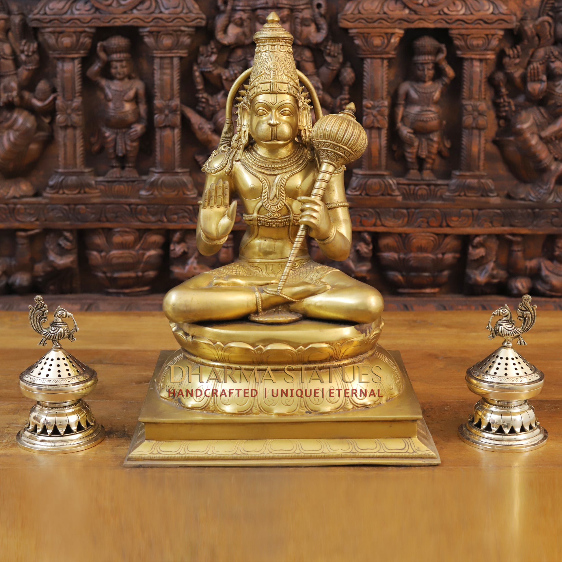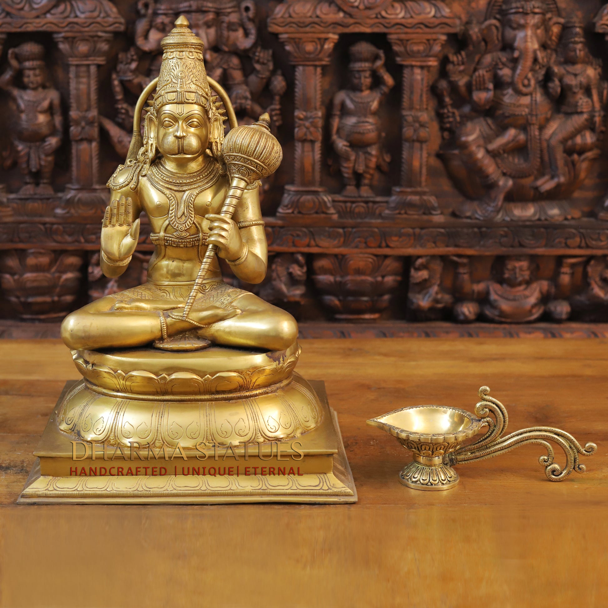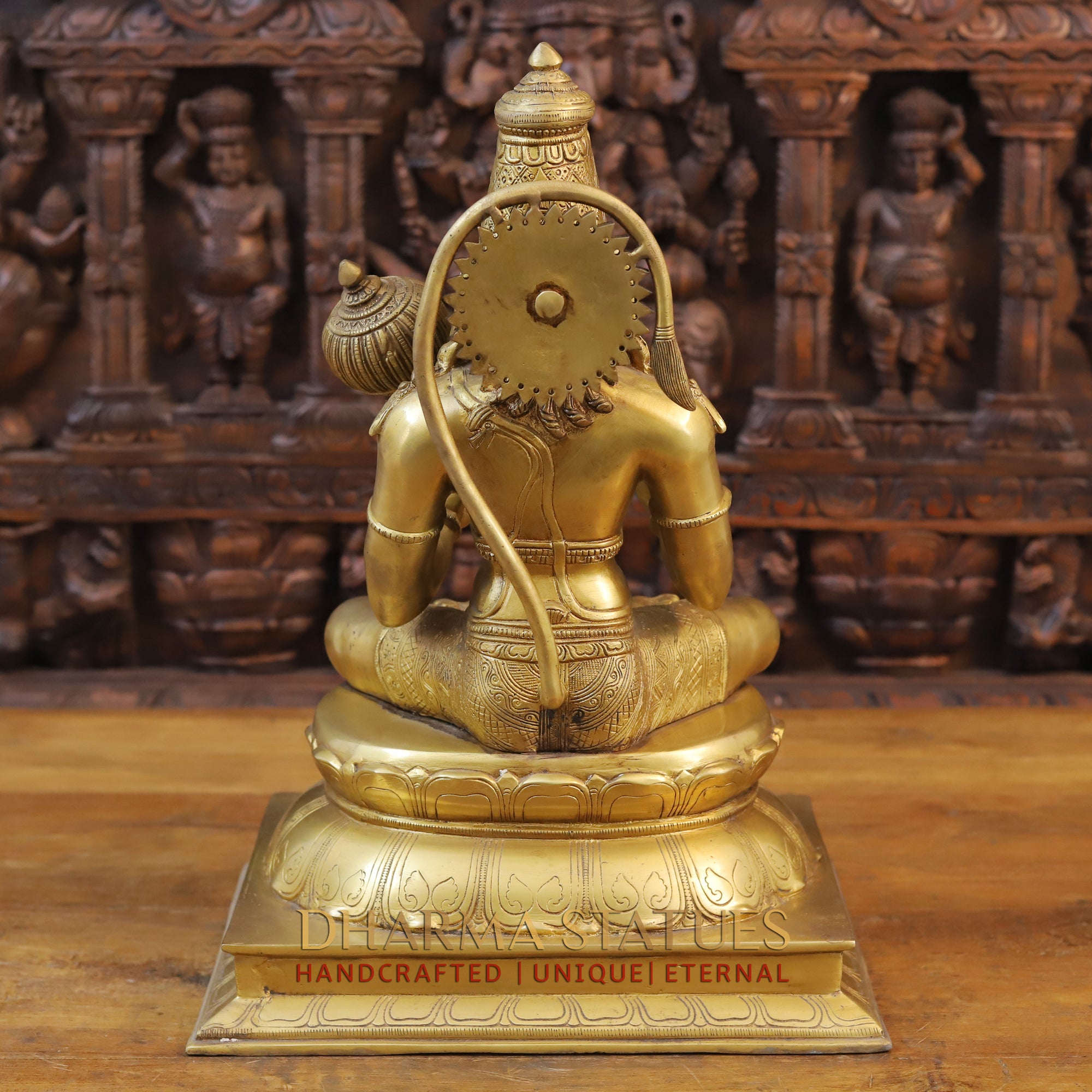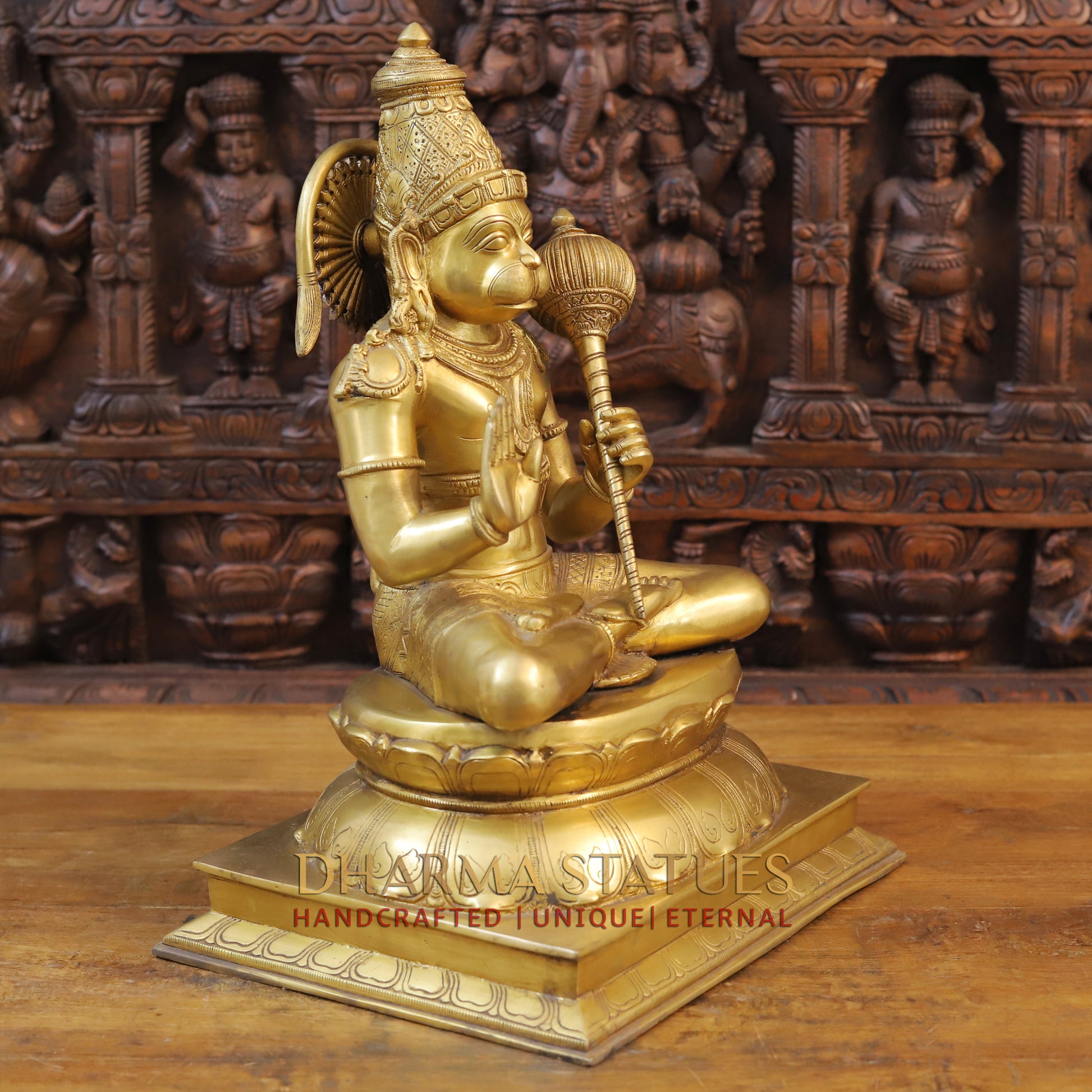 Brass Hanuman Idol, Seated on a Lotus, Fine Golden Finish 18"