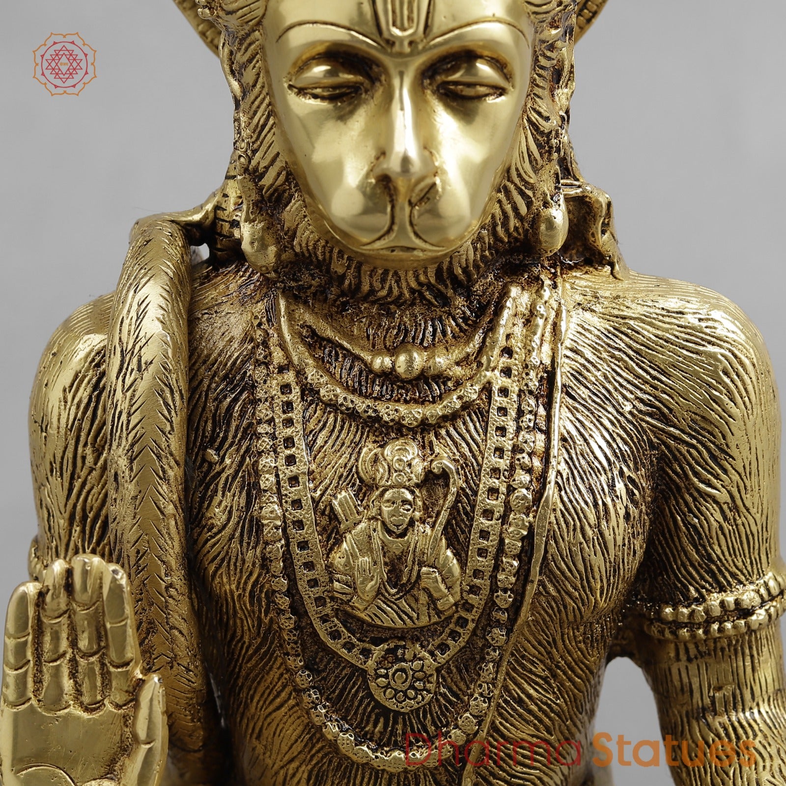 A finely handcrafted Brass Lord Hanuman in a serene seated posture, finished with a rich golden polish. Featuring intricate detailing, a calm yet powerful expression, and the blessing hand gesture, this statue symbolizes strength, devotion, courage, and protection. Ideal for pooja rooms, meditation spaces, offices, or spiritual décor, it radiates positive energy, faith, and divine grace in any sacred setting.