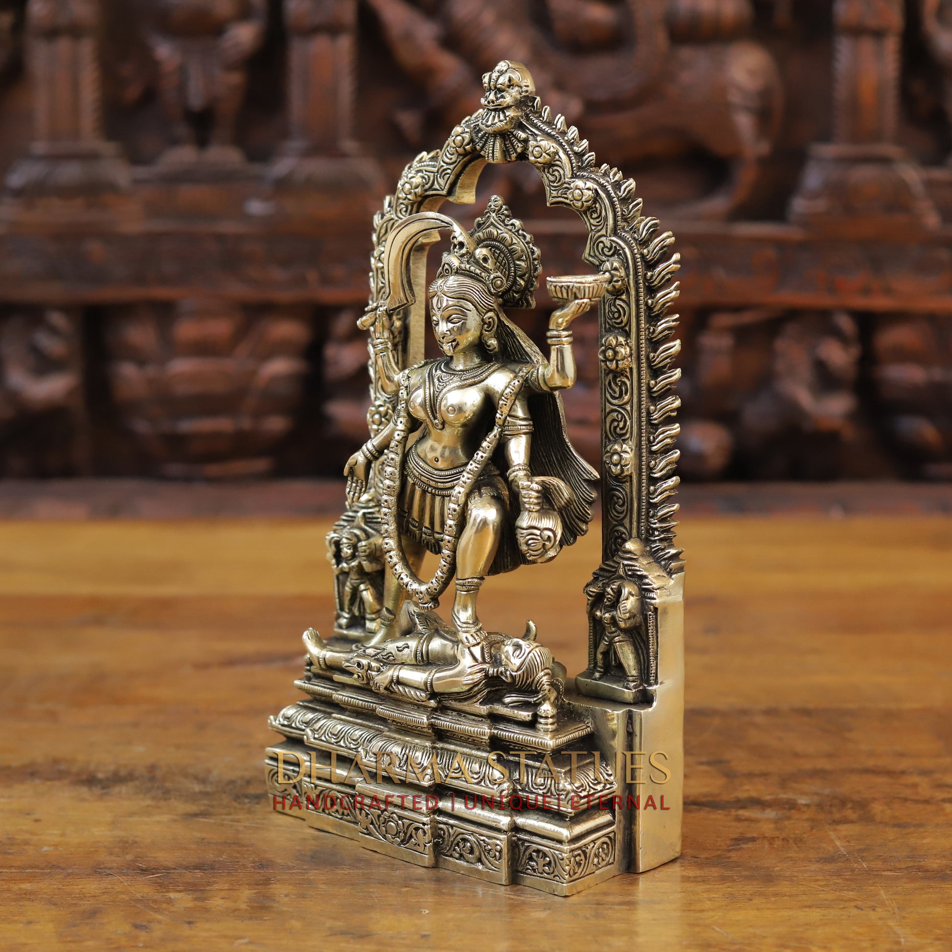 Elevate your home decor with our 10.5 inch brass standing Kali statue, featuring a fine golden finish and ornate frame. Crafted with precision, this statue exudes elegant craftsmanship and is a perfect addition to any space. Admire the intricate design and bring a touch of sacred beauty to your surroundings.