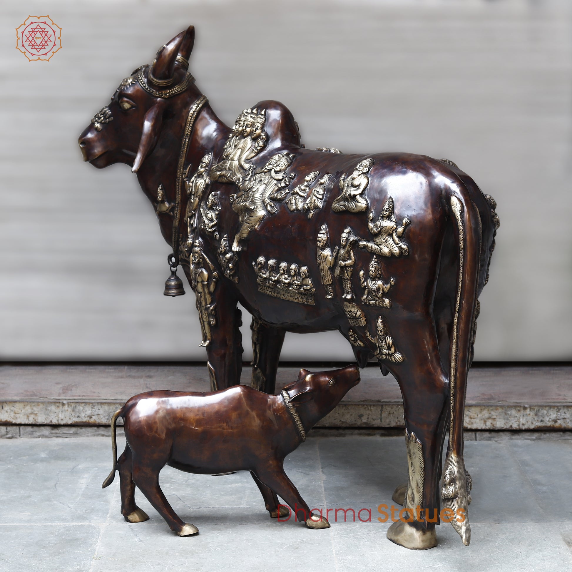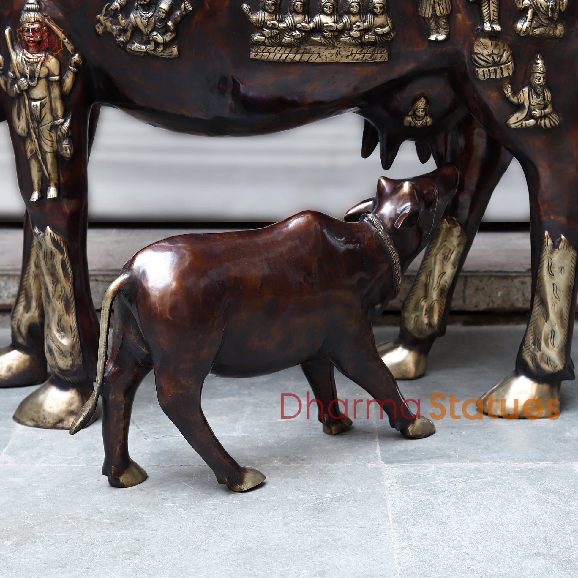 Brass Kamadhenu Cow with Calf, Copper & Golden Finish, 50"