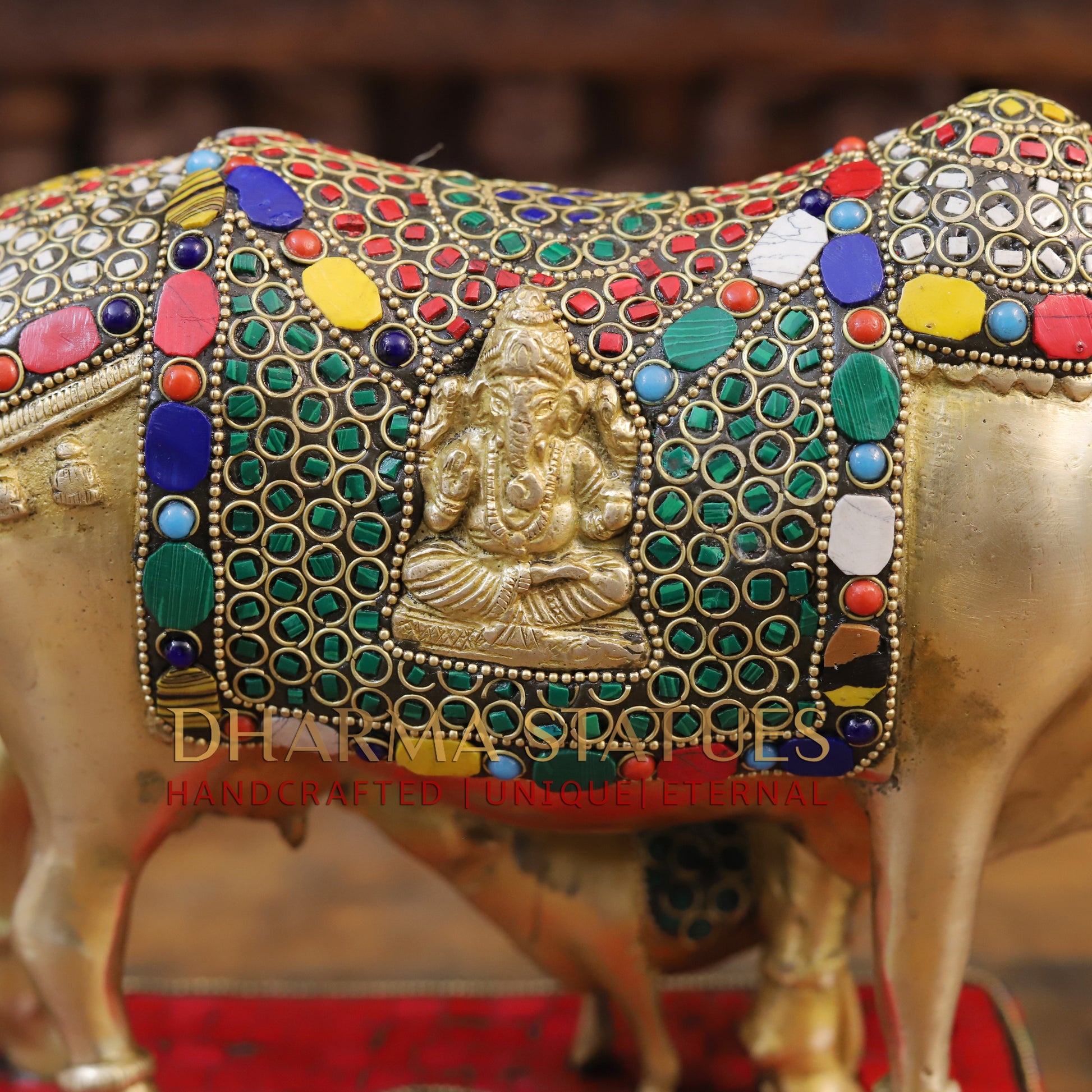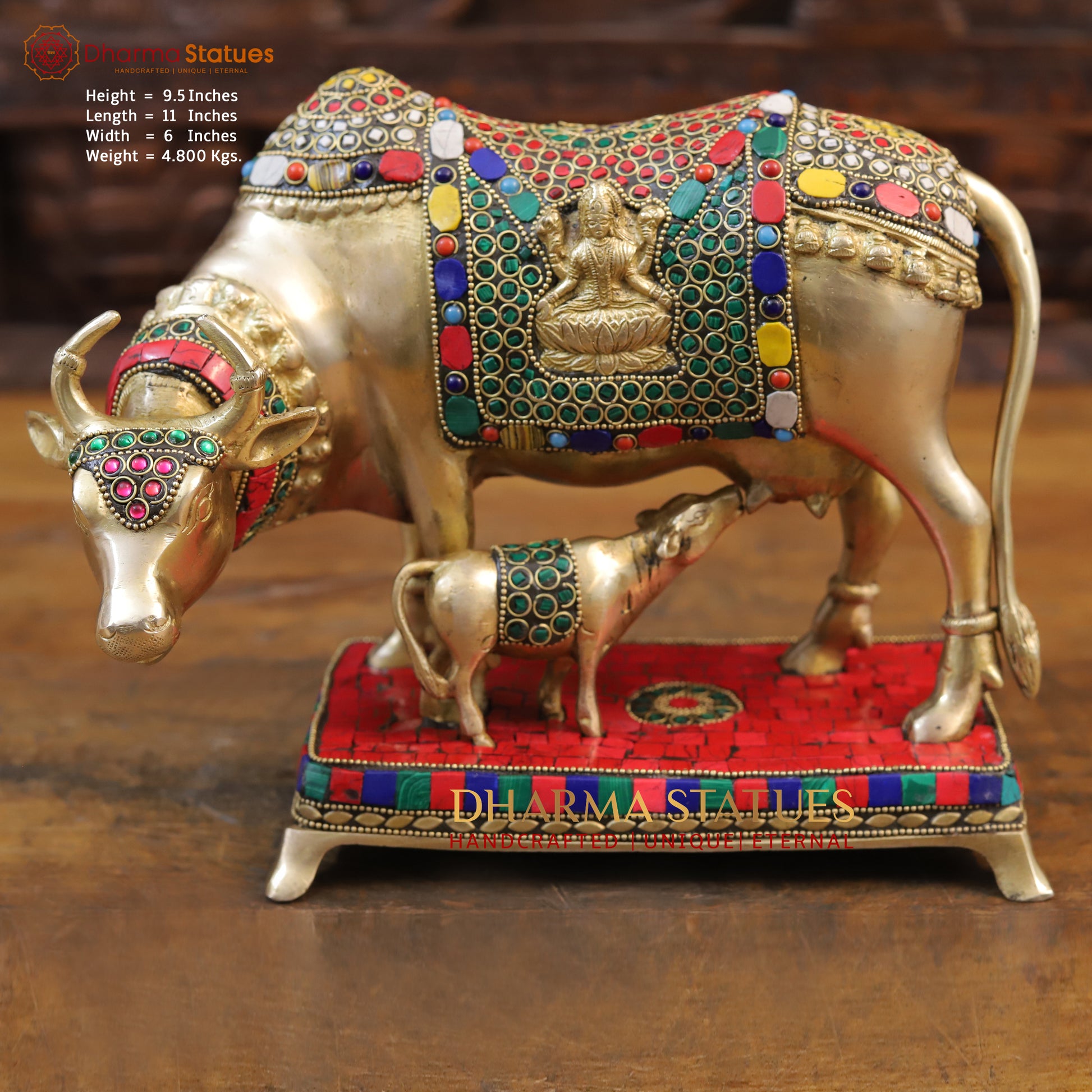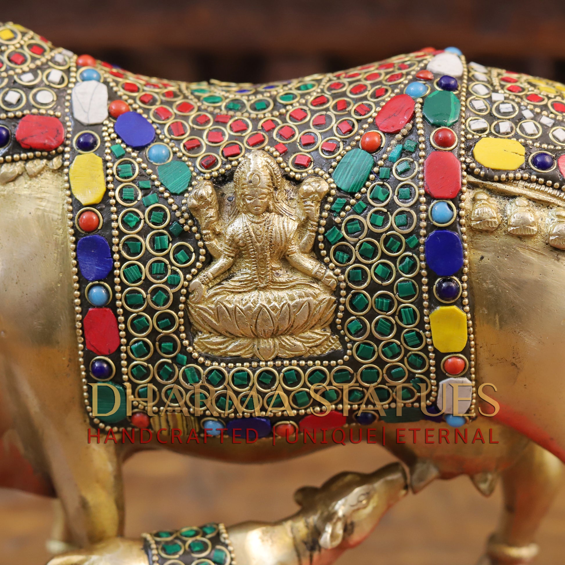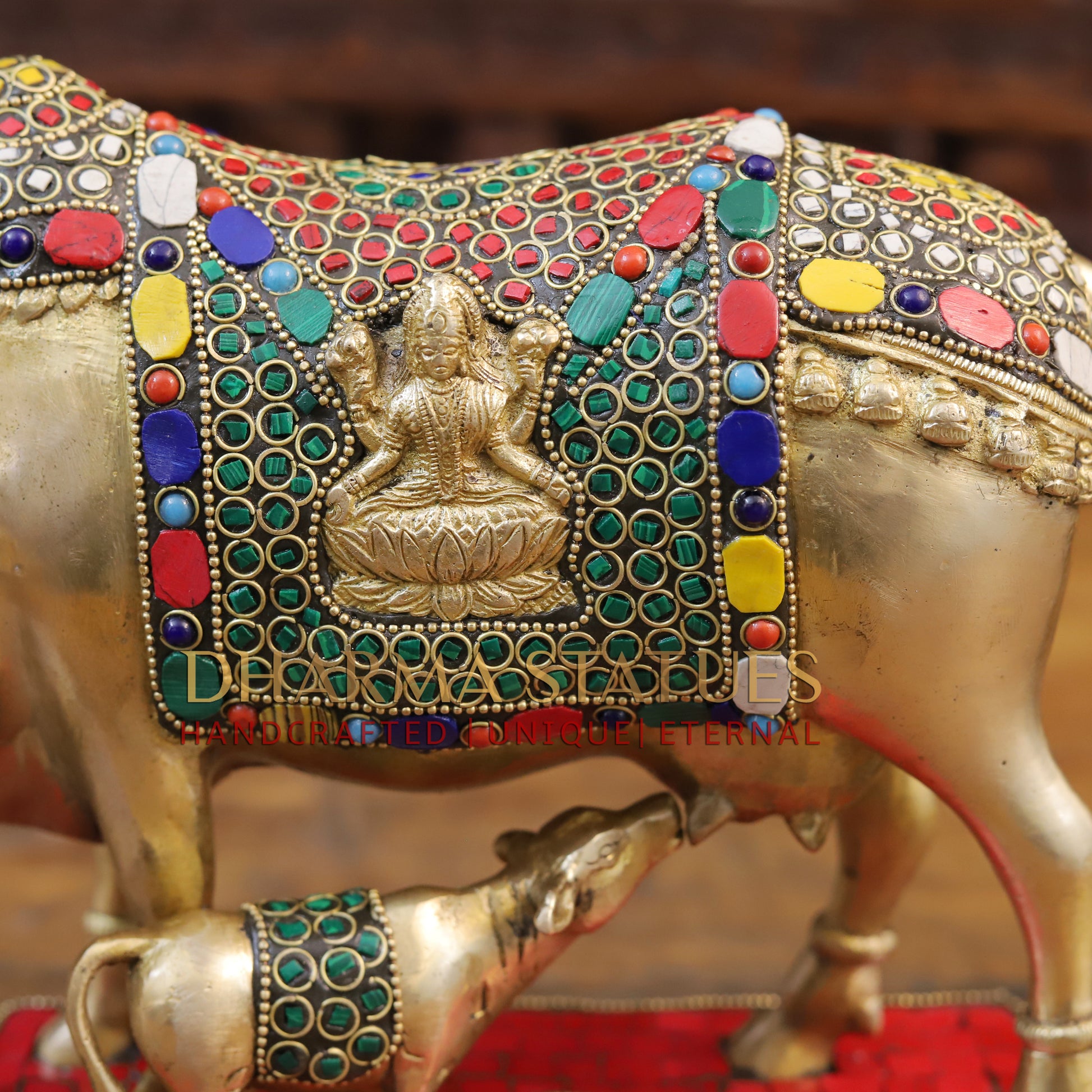 Brass Kamdhenu Cow with Lakshmi's Divine Presence, Golden Finish with Stone work, 9.5"