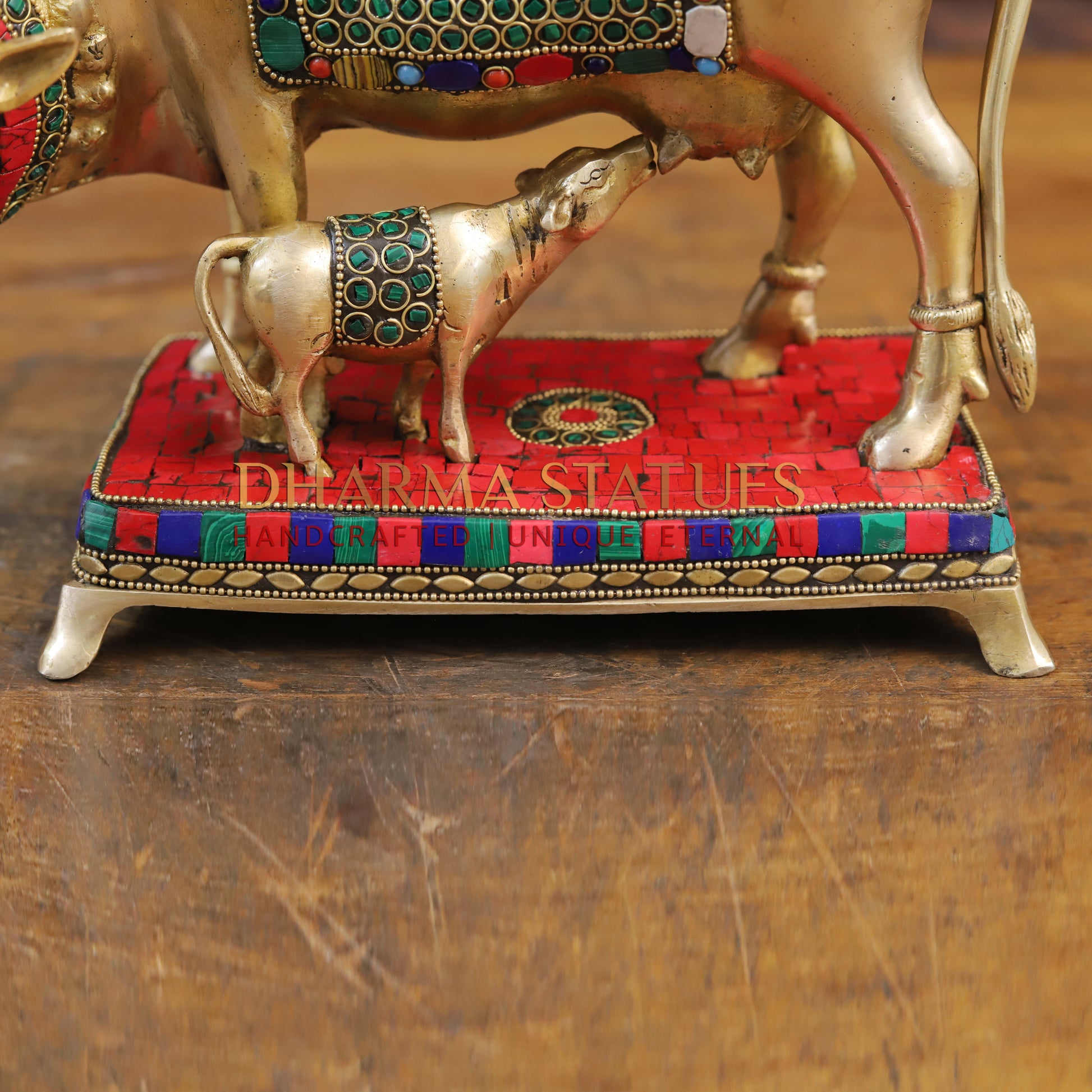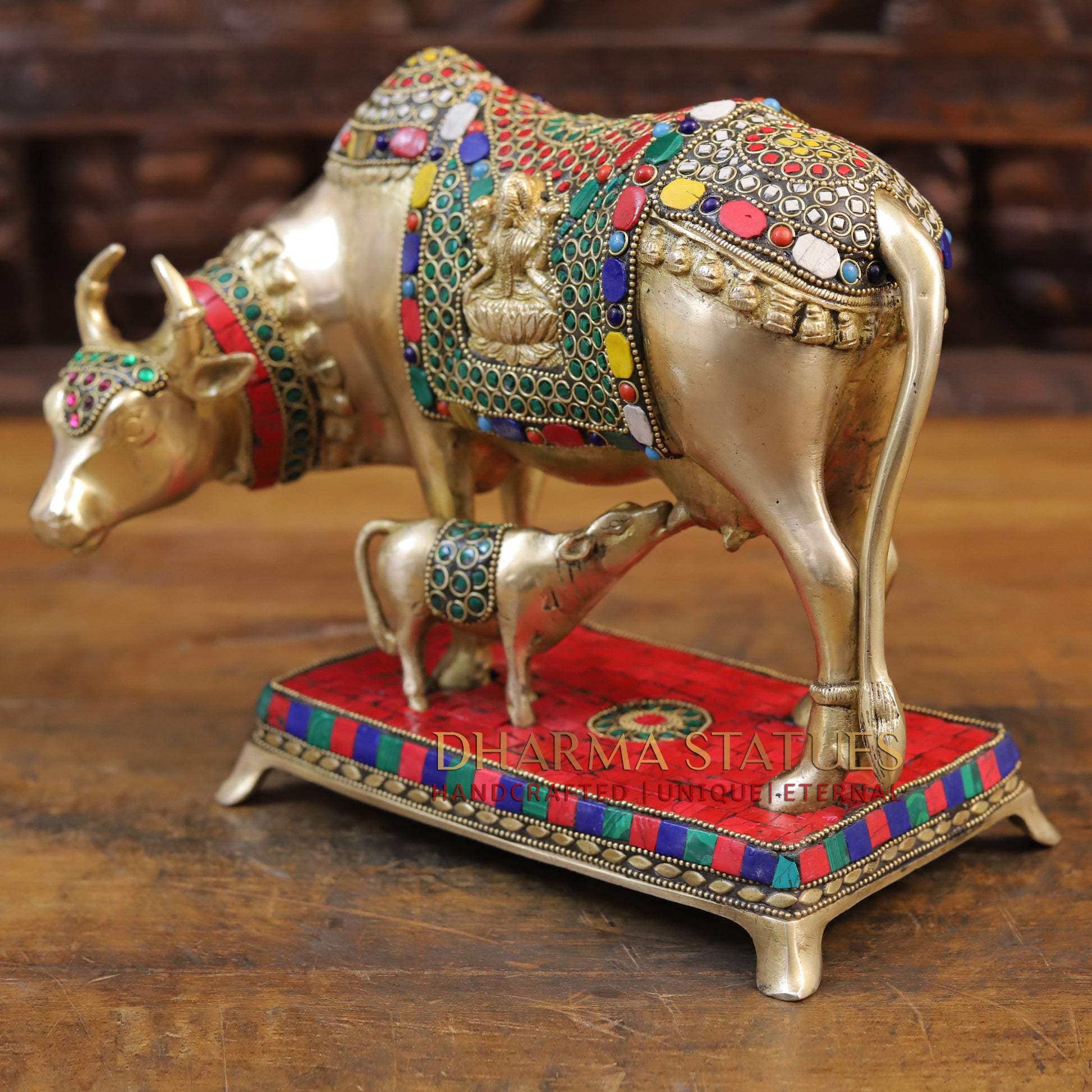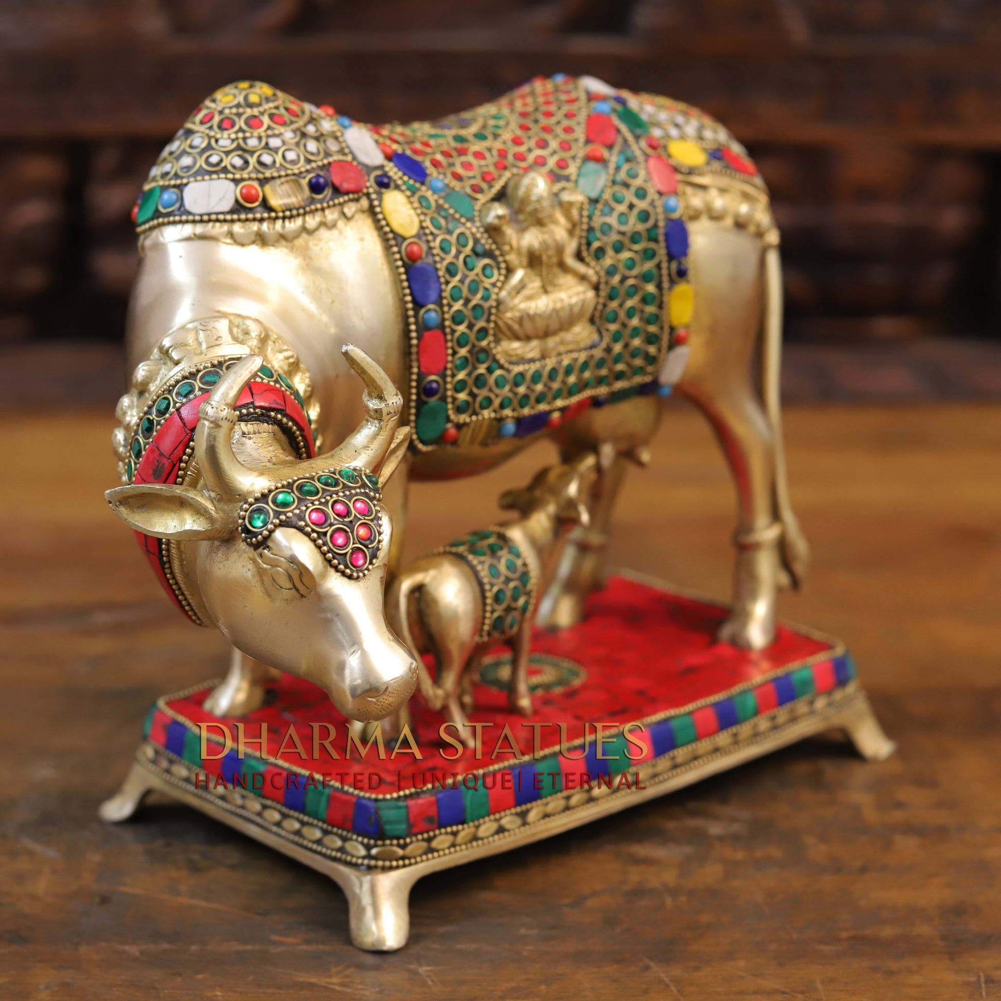 This stunning brass Kamdhenu cow figurine features intricate golden and stone work, depicting the Cow feeding her calf. Handcrafted with precision and attention to detail, this piece adds a touch of elegance and traditional charm to any space. Perfect for those who appreciate fine craftsmanship and cultural significance. Best for Wedding Gift | Diwali Gift | Gift purpose | Temple | worshipping | Perfect for Home decoration | Office decoration.