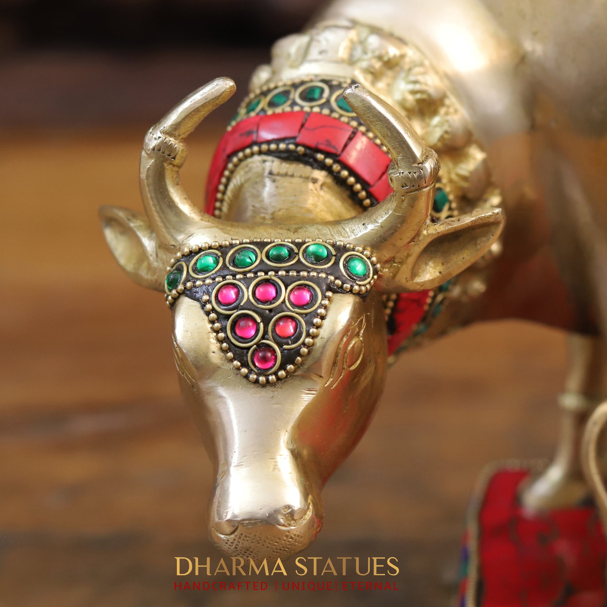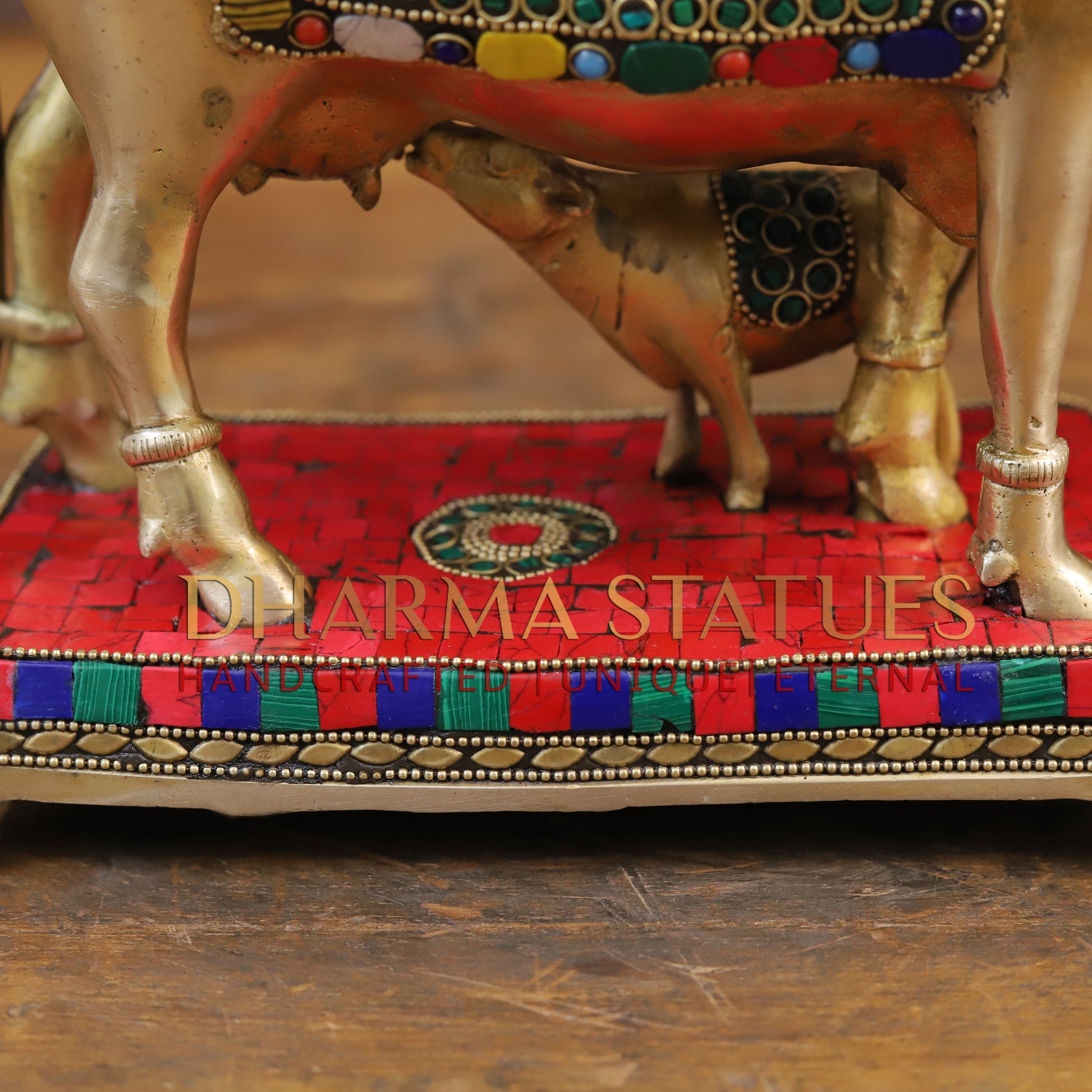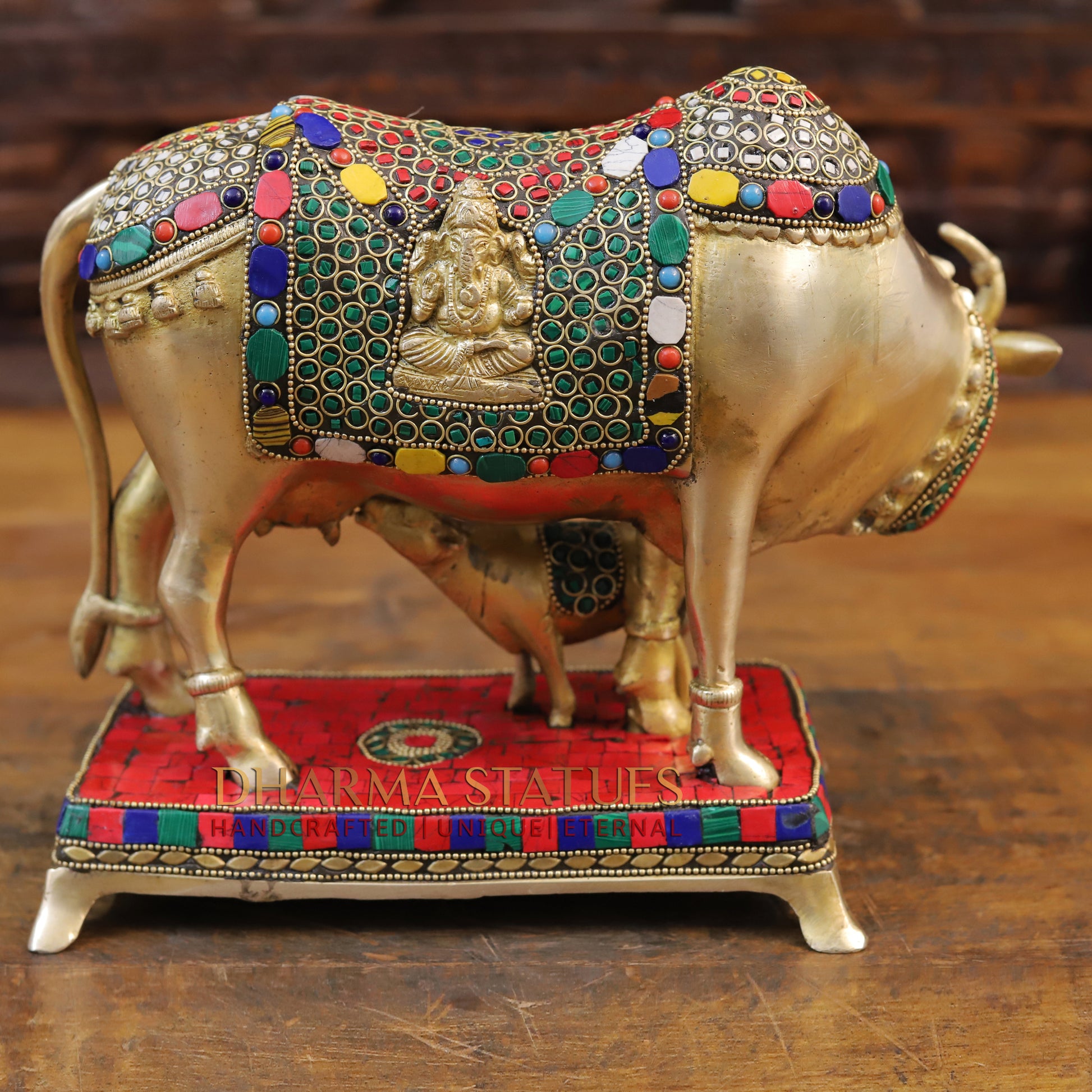 This stunning brass Kamdhenu cow figurine features intricate golden and stone work, depicting the Cow feeding her calf. Handcrafted with precision and attention to detail, this piece adds a touch of elegance and traditional charm to any space. Perfect for those who appreciate fine craftsmanship and cultural significance. Best for Wedding Gift | Diwali Gift | Gift purpose | Temple | worshipping | Perfect for Home decoration | Office decoration.
