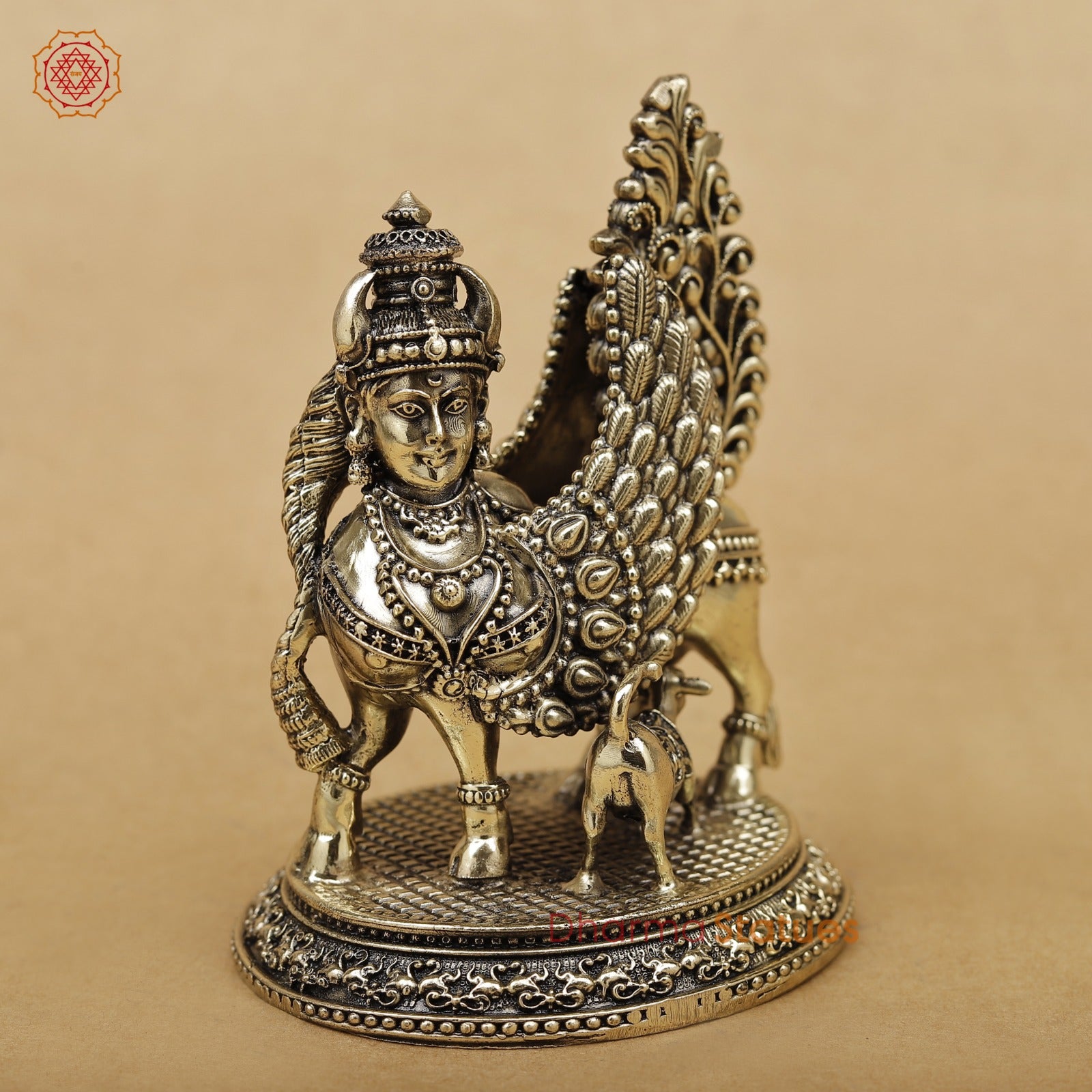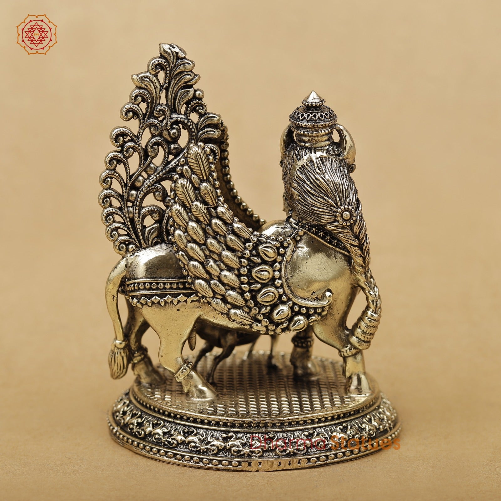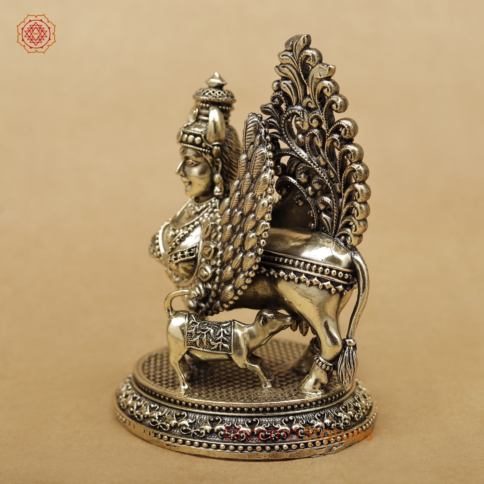 This uniquely designed brass Kamdhenu statue with calf combines traditional symbolism with artistic elegance. Featuring intricate detailing and a decorative winged design, it represents prosperity, nourishment, and divine blessings. Perfect for compact pooja spaces, office desks, or as a thoughtful spiritual gift, this statue adds charm, positivity, and a touch of traditional artistry to any setting.