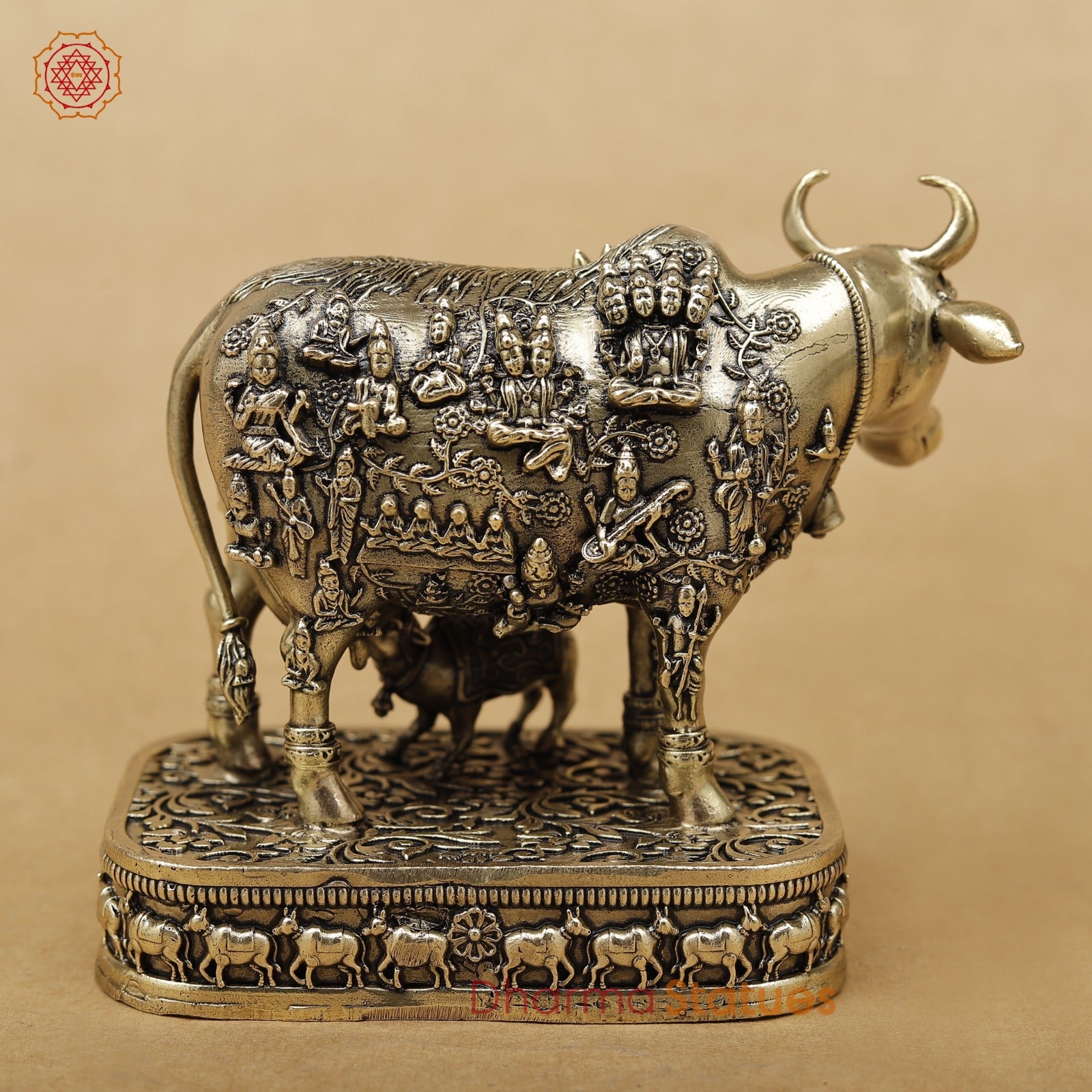 This finely detailed brass Kamdhenu statue with calf represents divine abundance, prosperity, and fulfillment of wishes. Adorned with intricate carvings of deities across the cow’s body, it reflects deep spiritual symbolism and exceptional craftsmanship. Ideal for home temples, Vastu placement, or gifting, this statue is believed to bring prosperity, positivity, and spiritual blessings into any space.