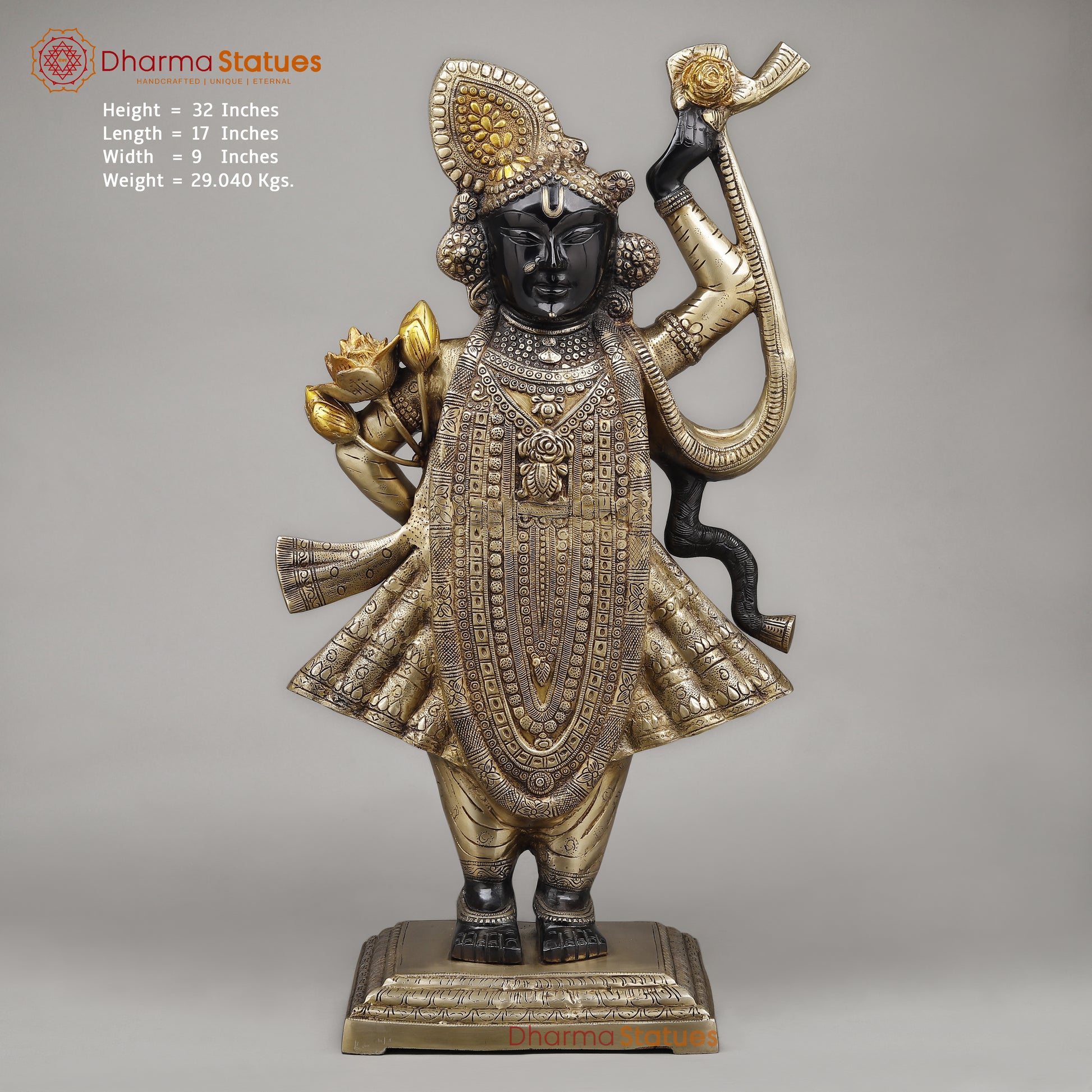 Expertly crafted with a golden and black patina finish, this Brass Krishna as Srinath statue stands at 32 inches tall. Bring a touch of divine elegance to any space with this beautifully designed piece. Perfect for anyone seeking spiritual inspiration and aesthetic appeal.