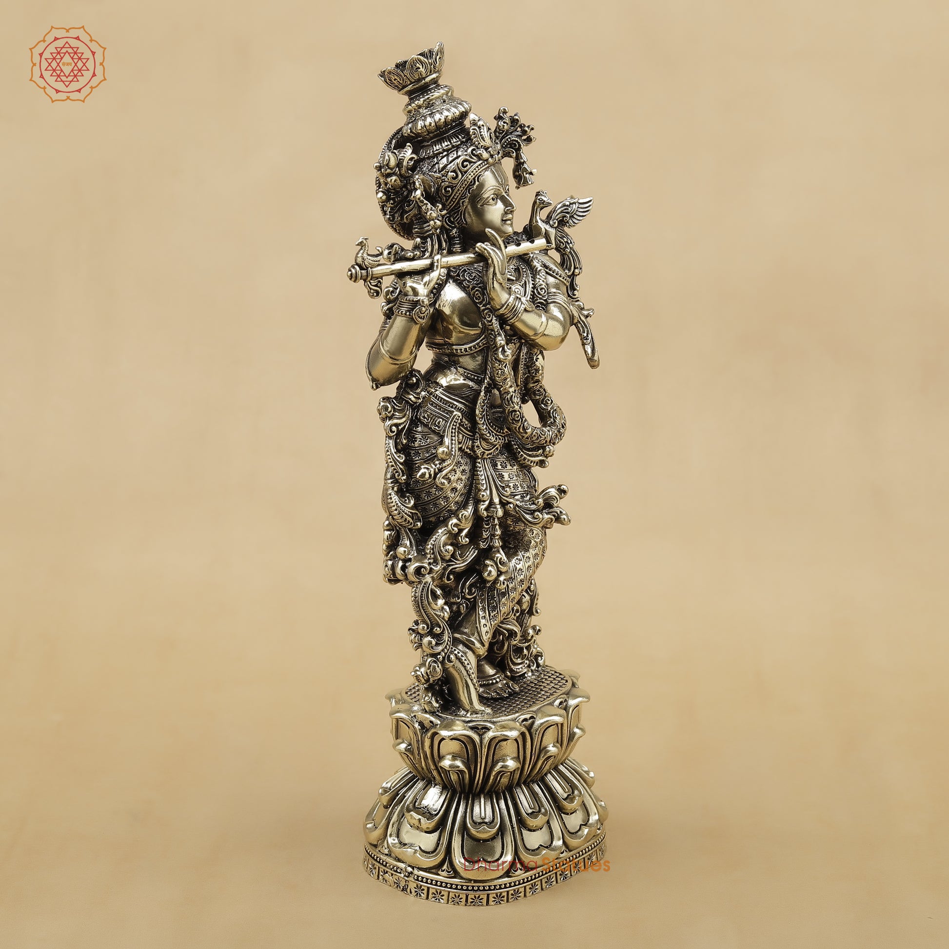 Celebrate divine love, grace, and serenity with this exquisitely crafted Brass Lord Krishna Statue. Standing in an elegant tribhanga posture and playing the flute, Krishna is adorned with intricate fine-casted detailing from head to toe. The ornate lotus pedestal and antique brass finish add a majestic charm, making this idol a stunning centerpiece for any home temple or décor space.