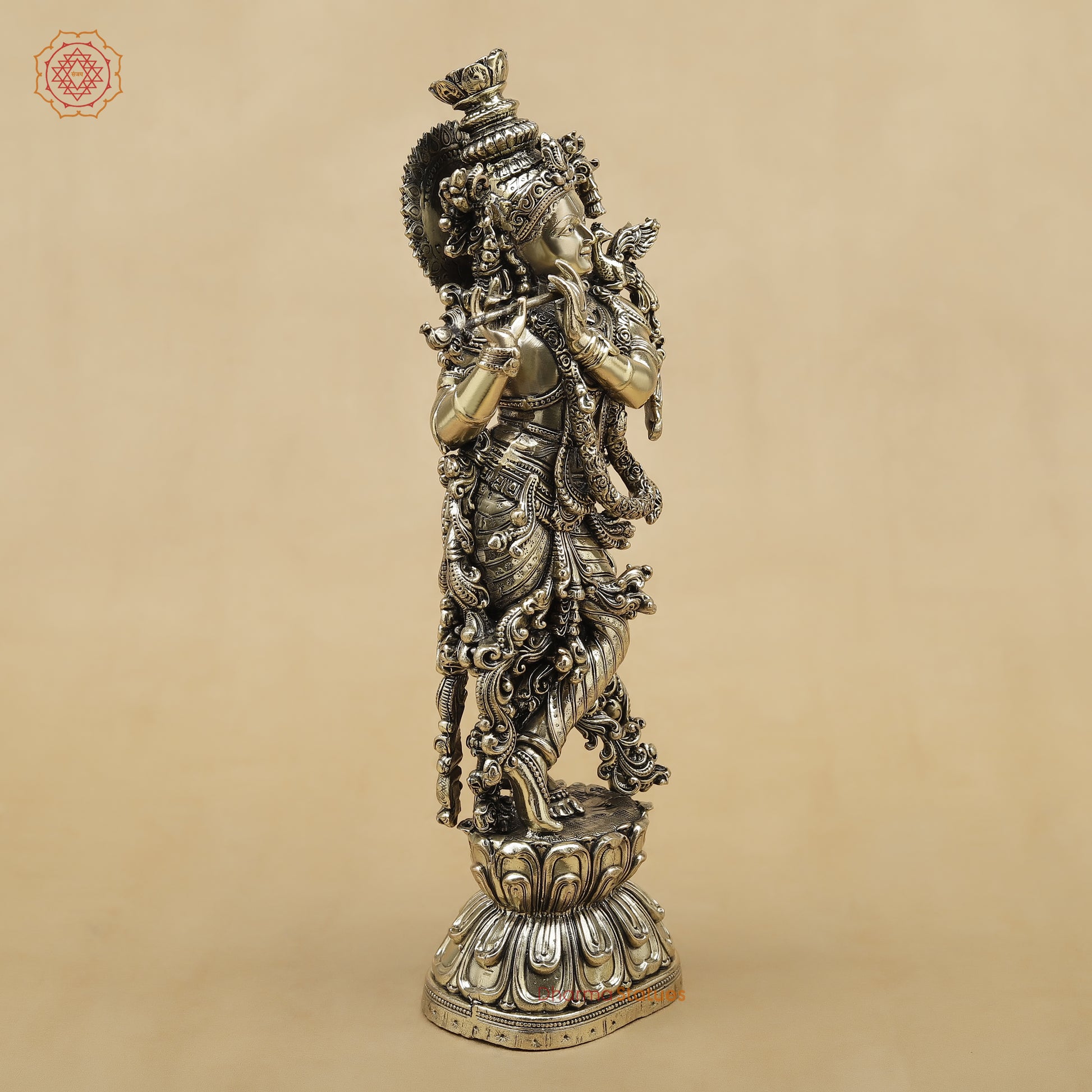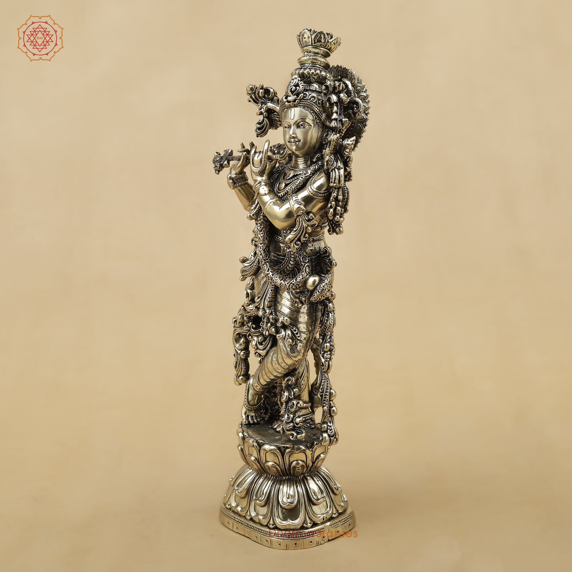 Celebrate divine love, grace, and serenity with this exquisitely crafted Brass Lord Krishna Statue. Standing in an elegant tribhanga posture and playing the flute, Krishna is adorned with intricate fine-casted detailing from head to toe. The ornate lotus pedestal and antique brass finish add a majestic charm, making this idol a stunning centerpiece for any home temple or décor space.