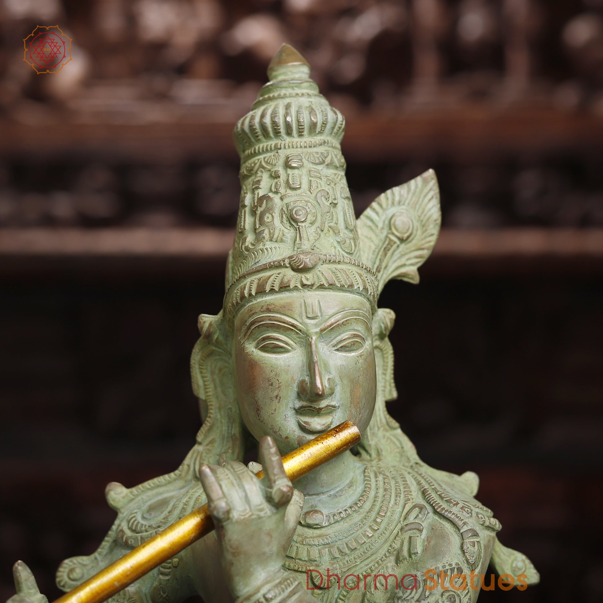 Brass Krishna Playing Flute, Antique Green Finish, 28.5"