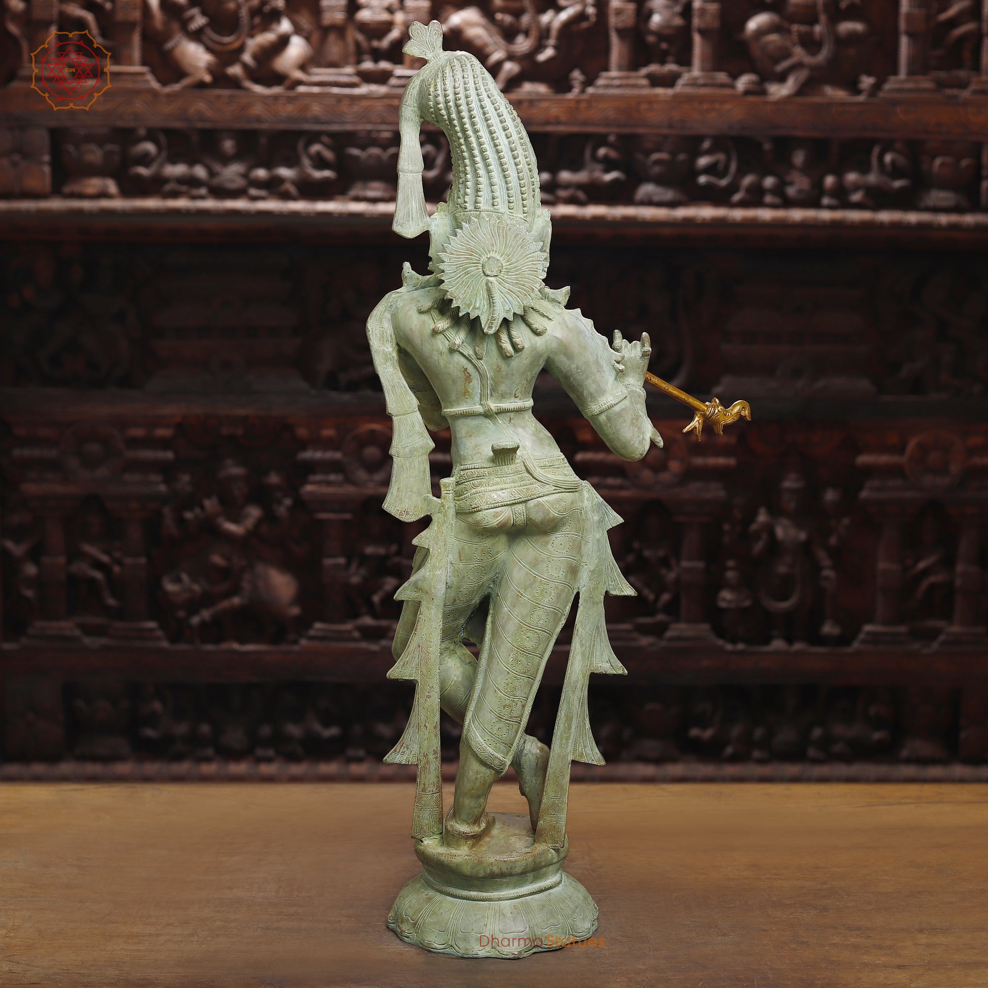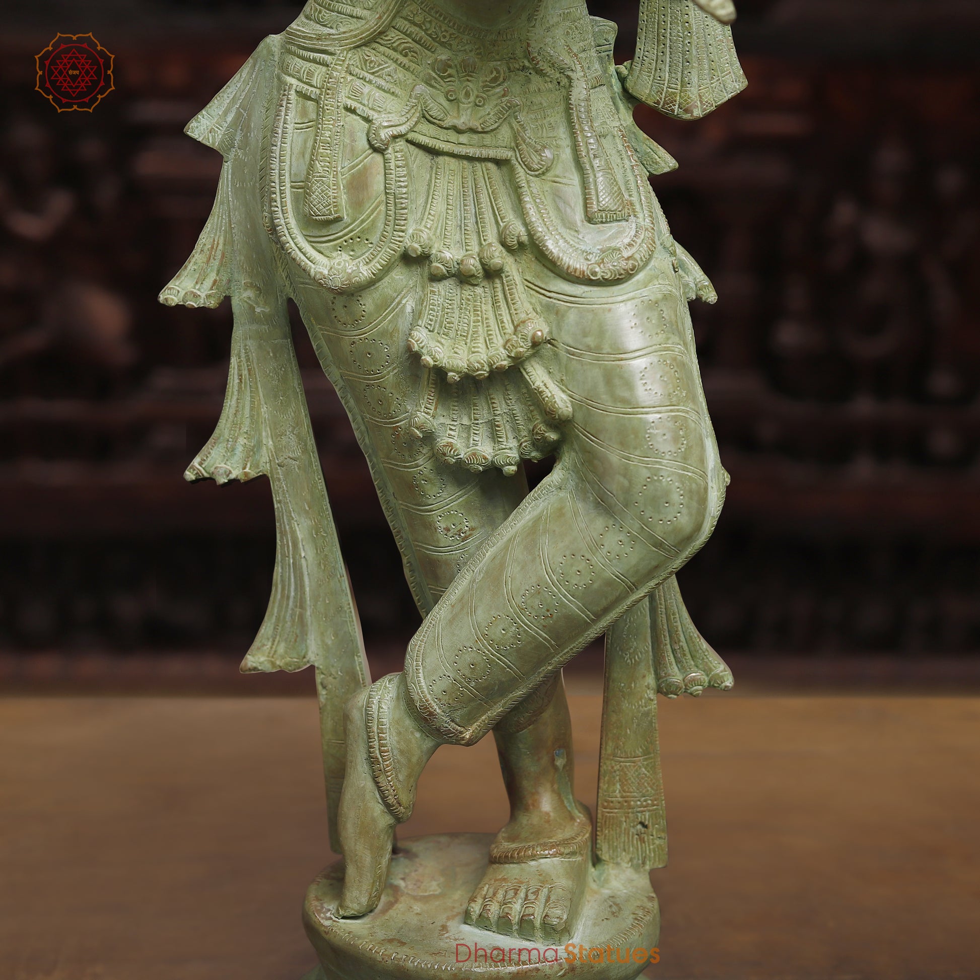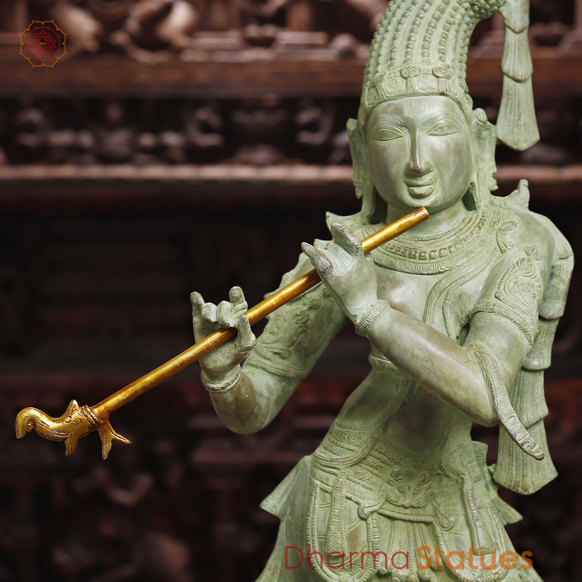 Brass Krishna Playing Flute, Antique Green Finish, 32"
