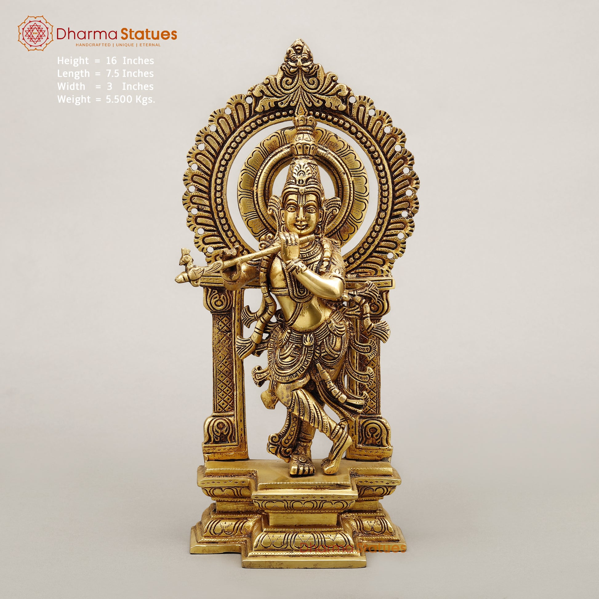 This 16-inch Brass Krishna statue features Lord Krishna standing gracefully with a flute, It is finished in a fine golden accent, giving it a radiant, luxurious appearance. The statue is framed by a delicate Prabhavali, enhancing its divine presence. This piece is perfect for altars or as a decorative item, adding both beauty and spiritual significance to any space.