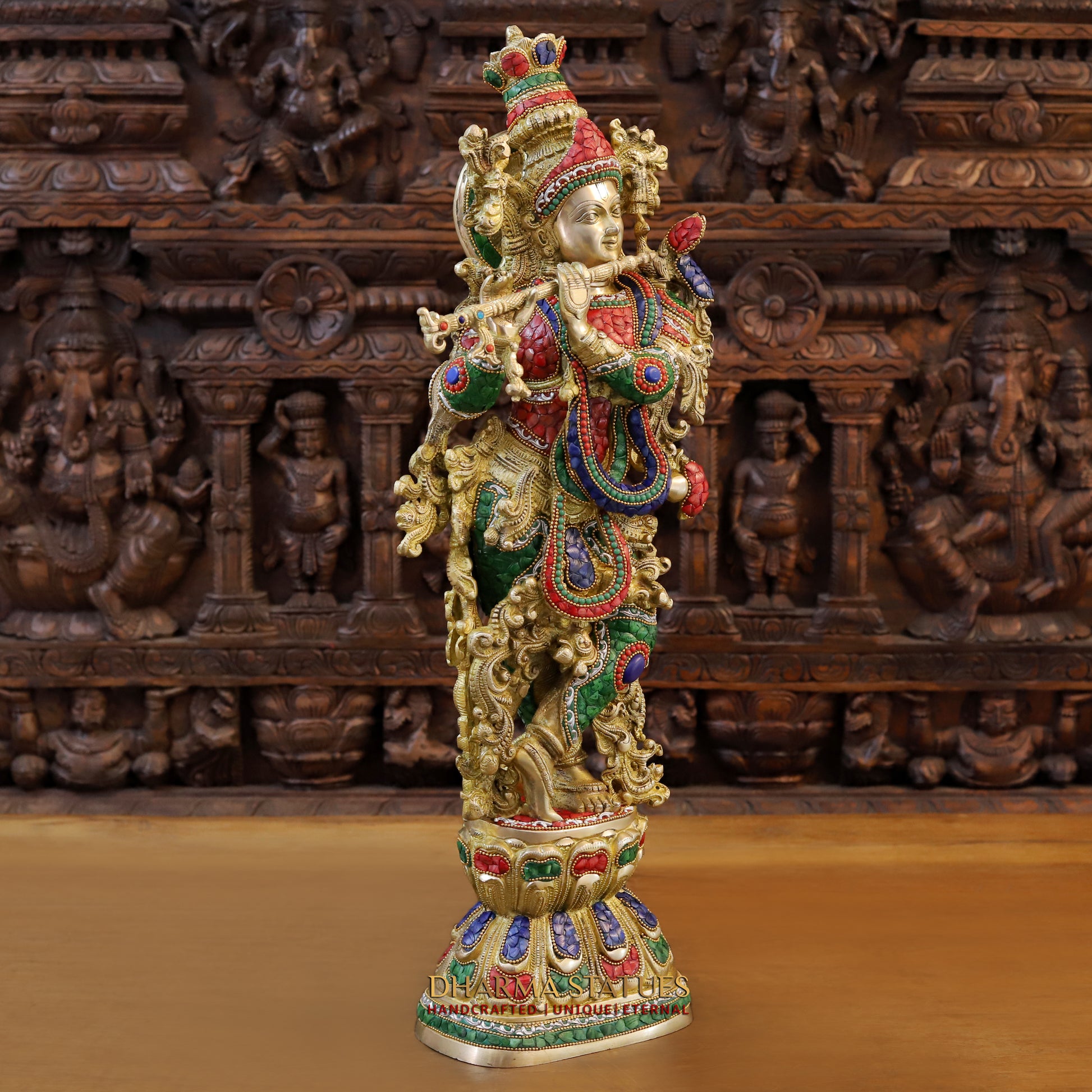 Brass Krishna Playing Flute, Stonework & Golden Finish, 30"