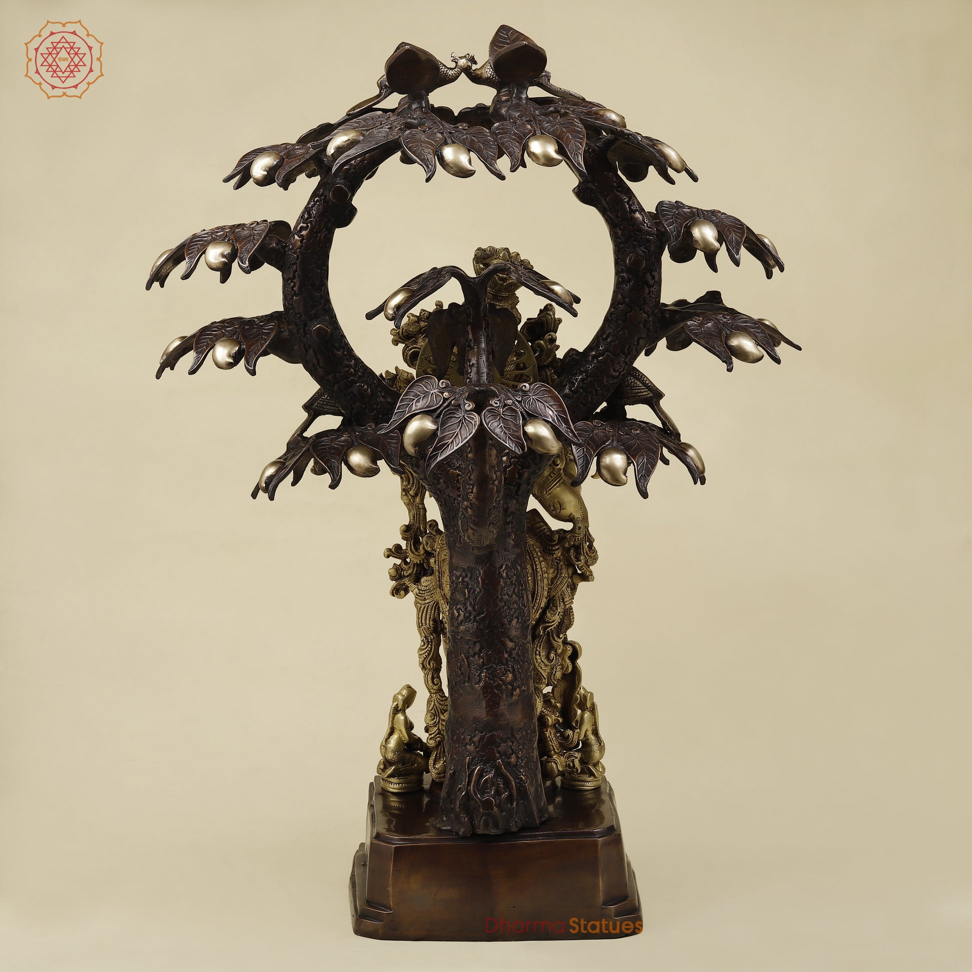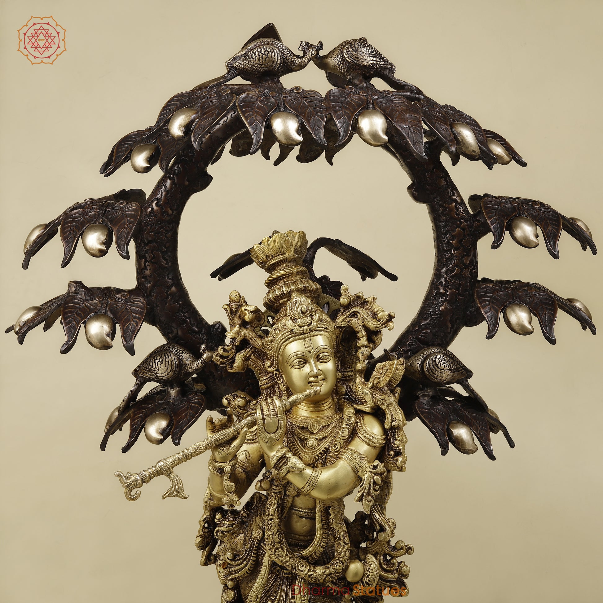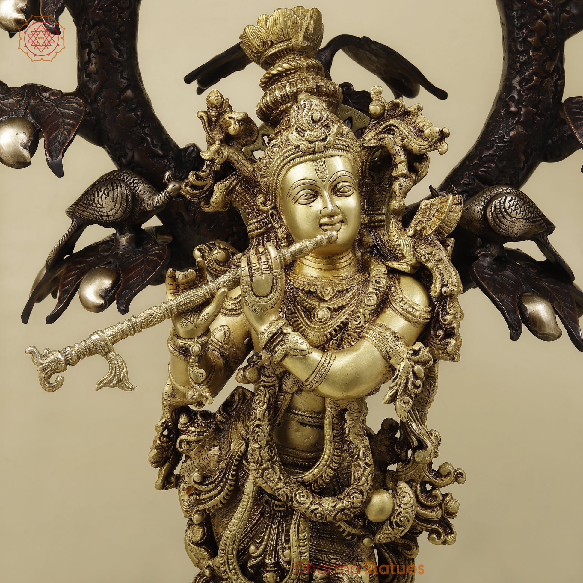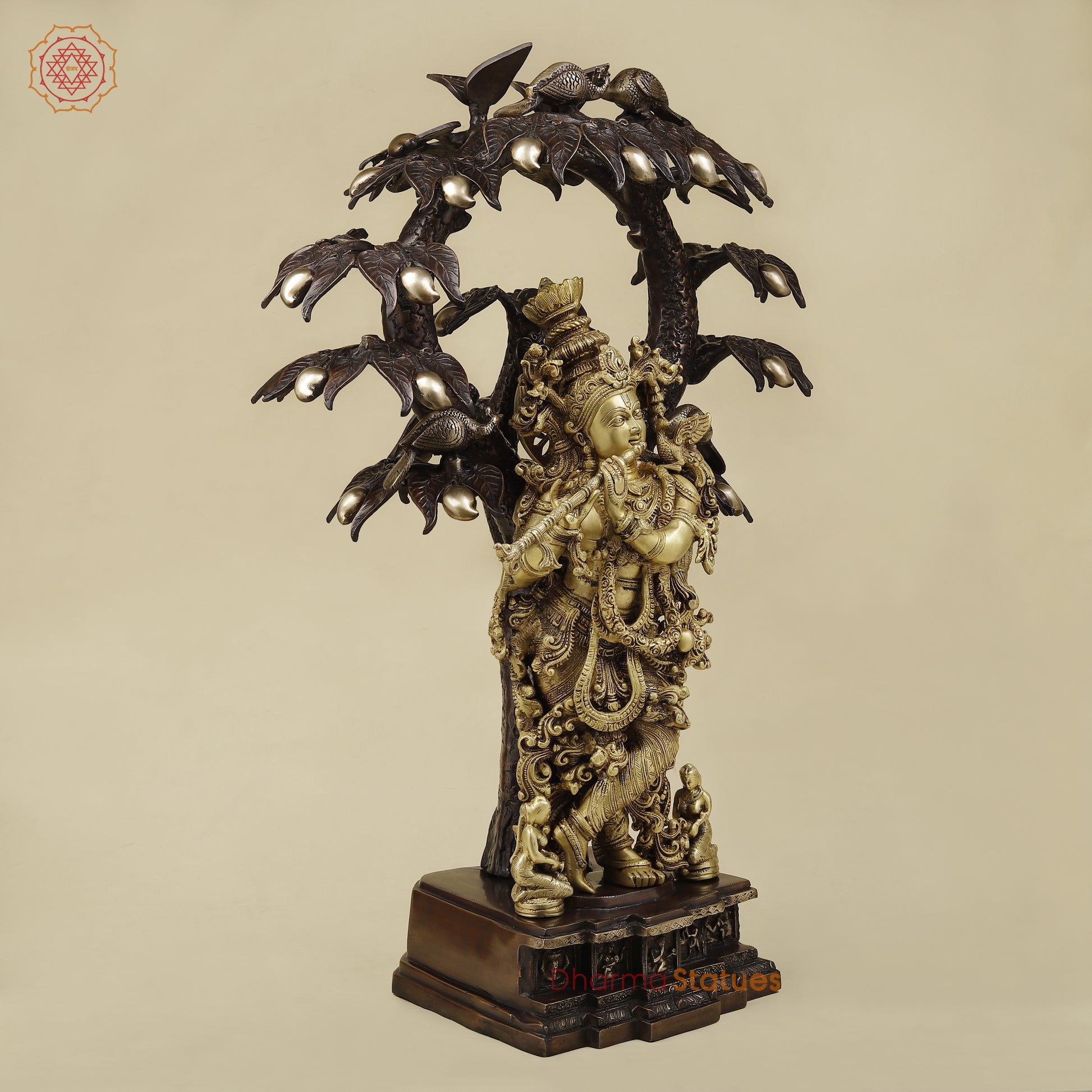 Brass Krishna Playing Flute under Tree, Copper & Golden Finish, 36"