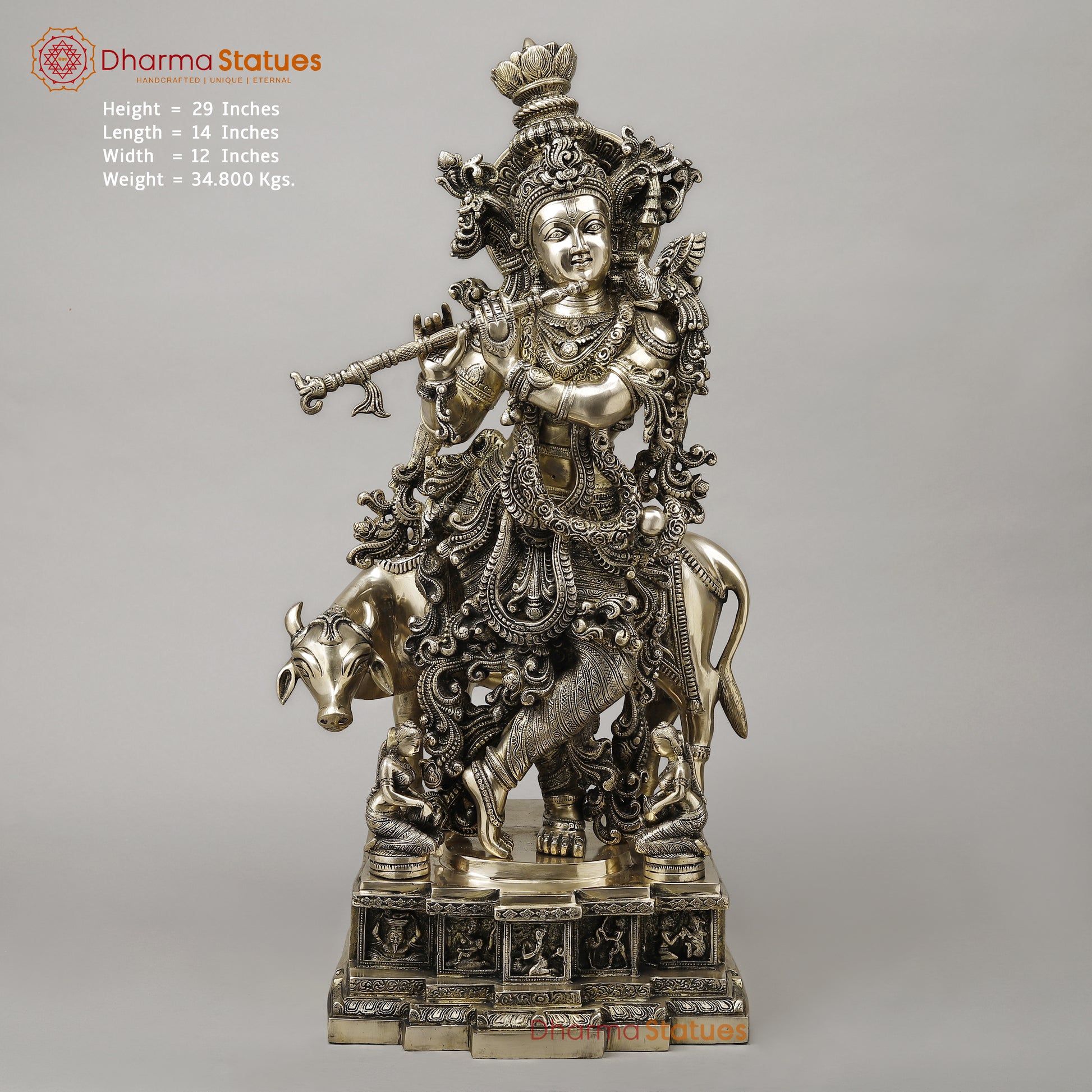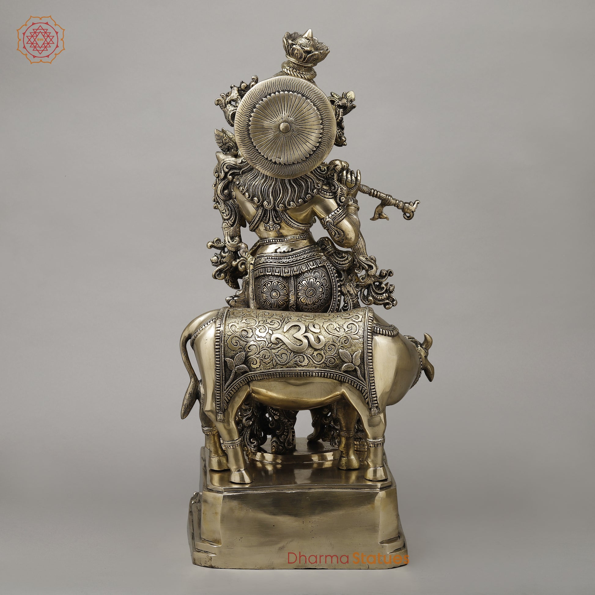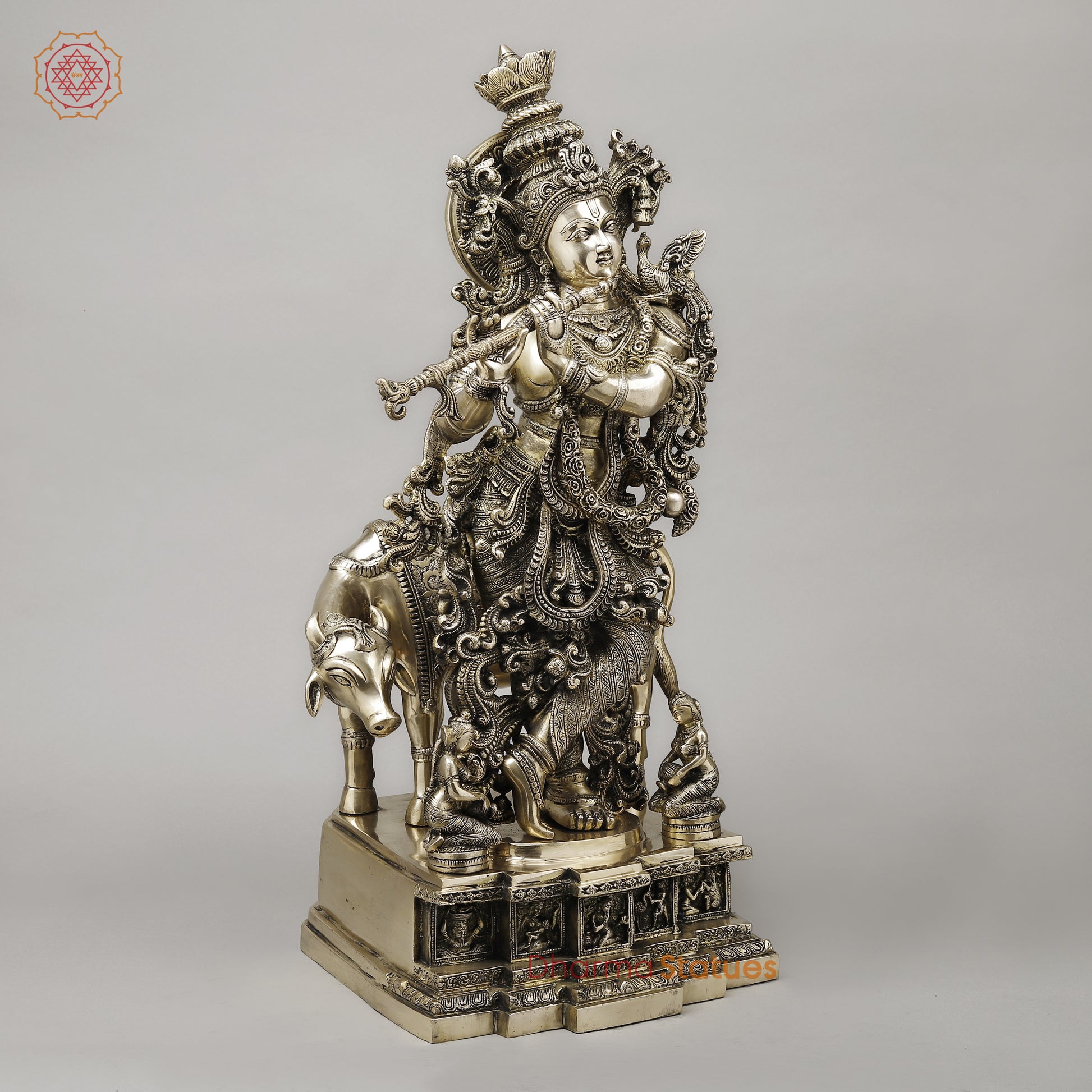Brass Krishna Playing Flute with Cow, Smooth Finish, 29"