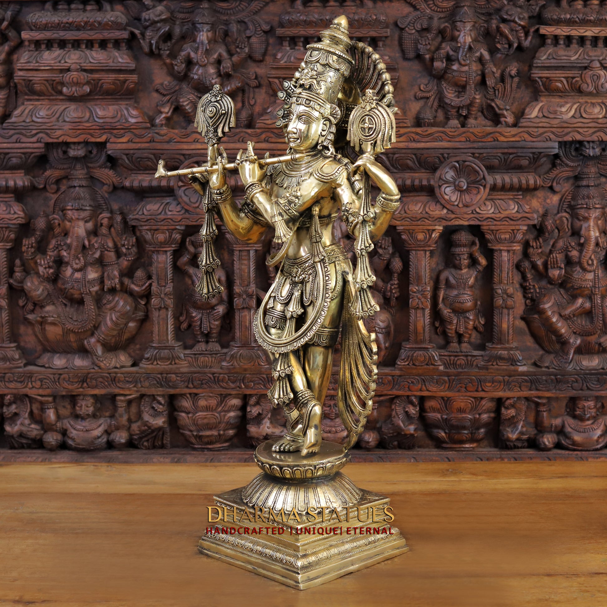 Brass Krishna Statue, Fine Golden Finish, 31"