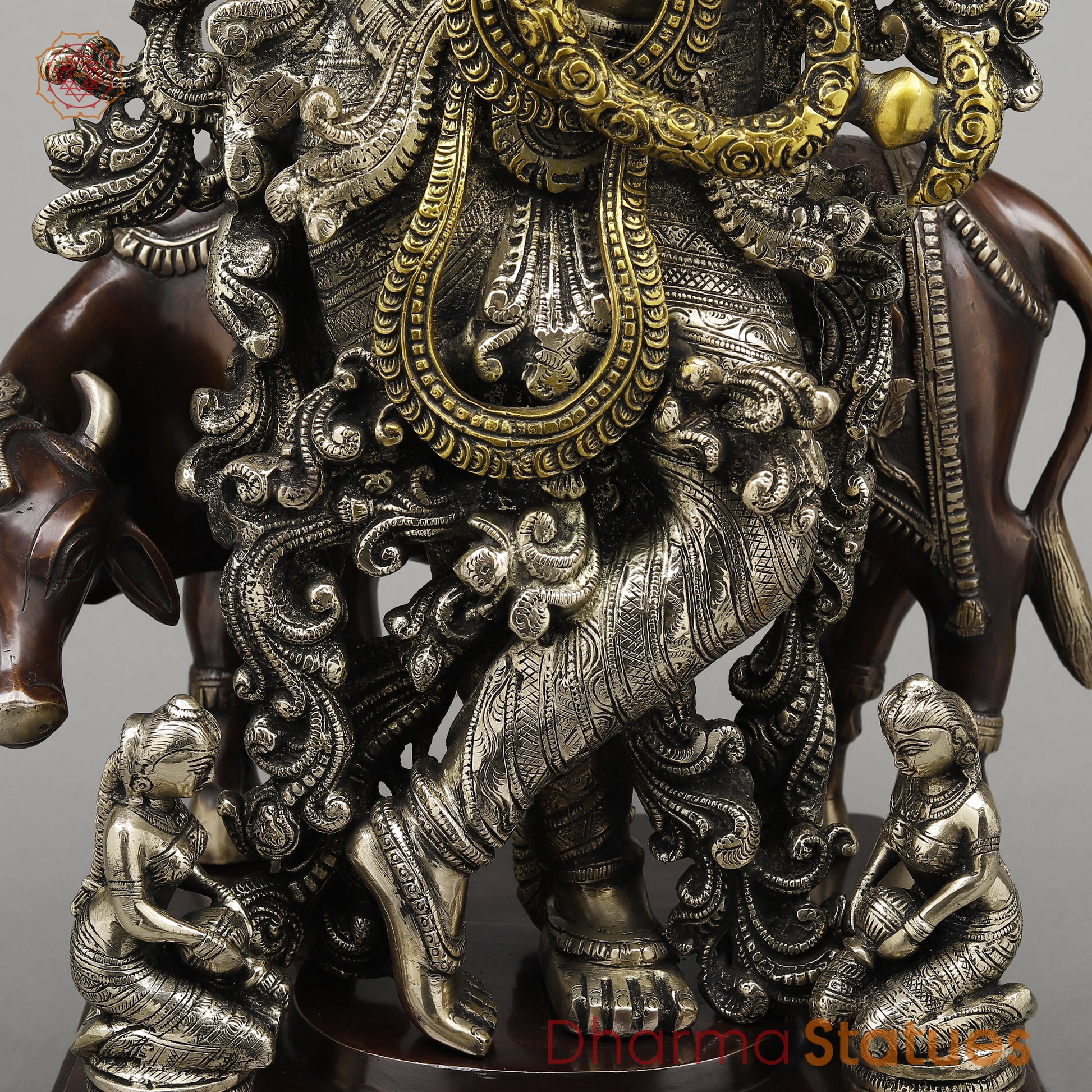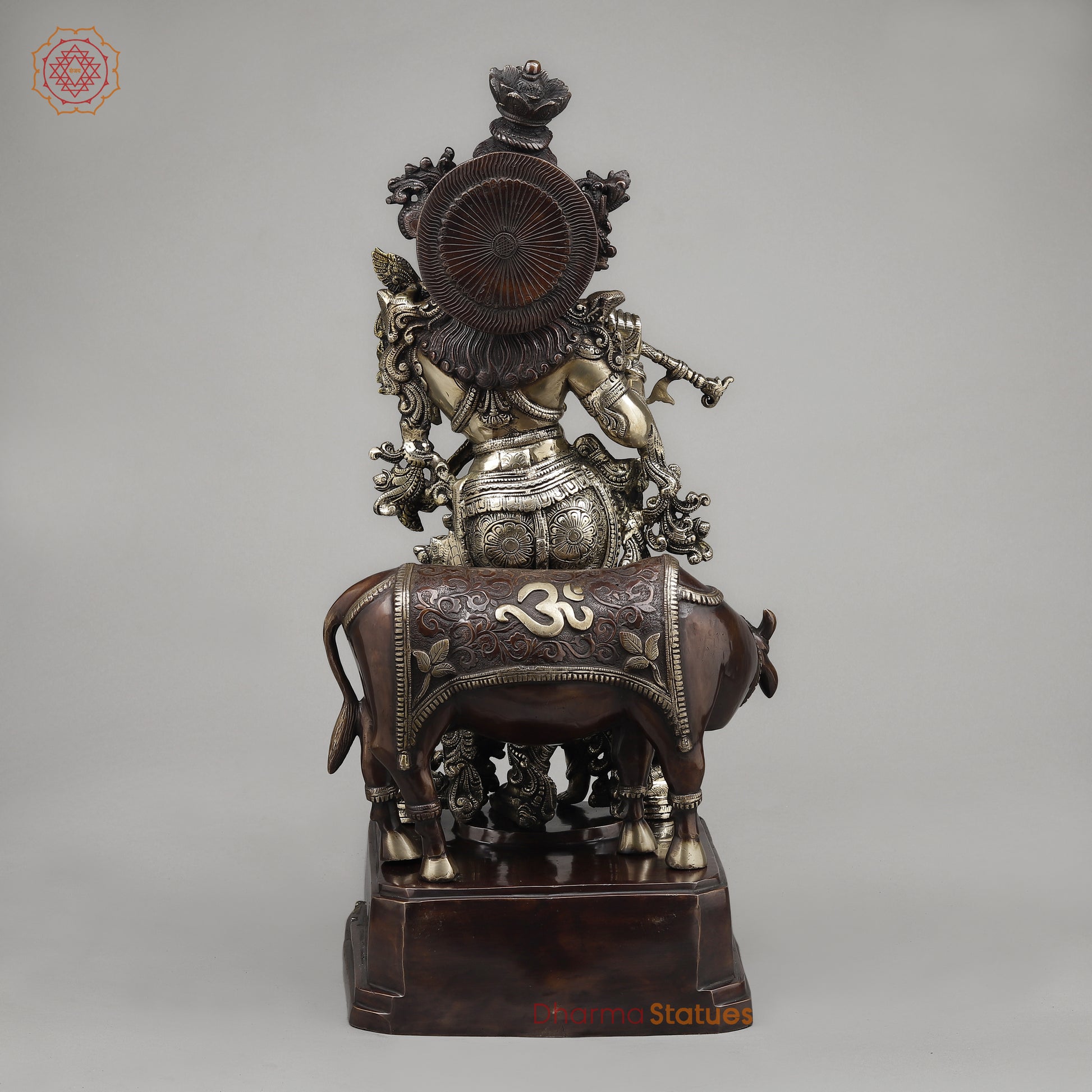 Brass Krishna Standing with Cow, Playing Flute, Golden & Copper Finish, 28.5"