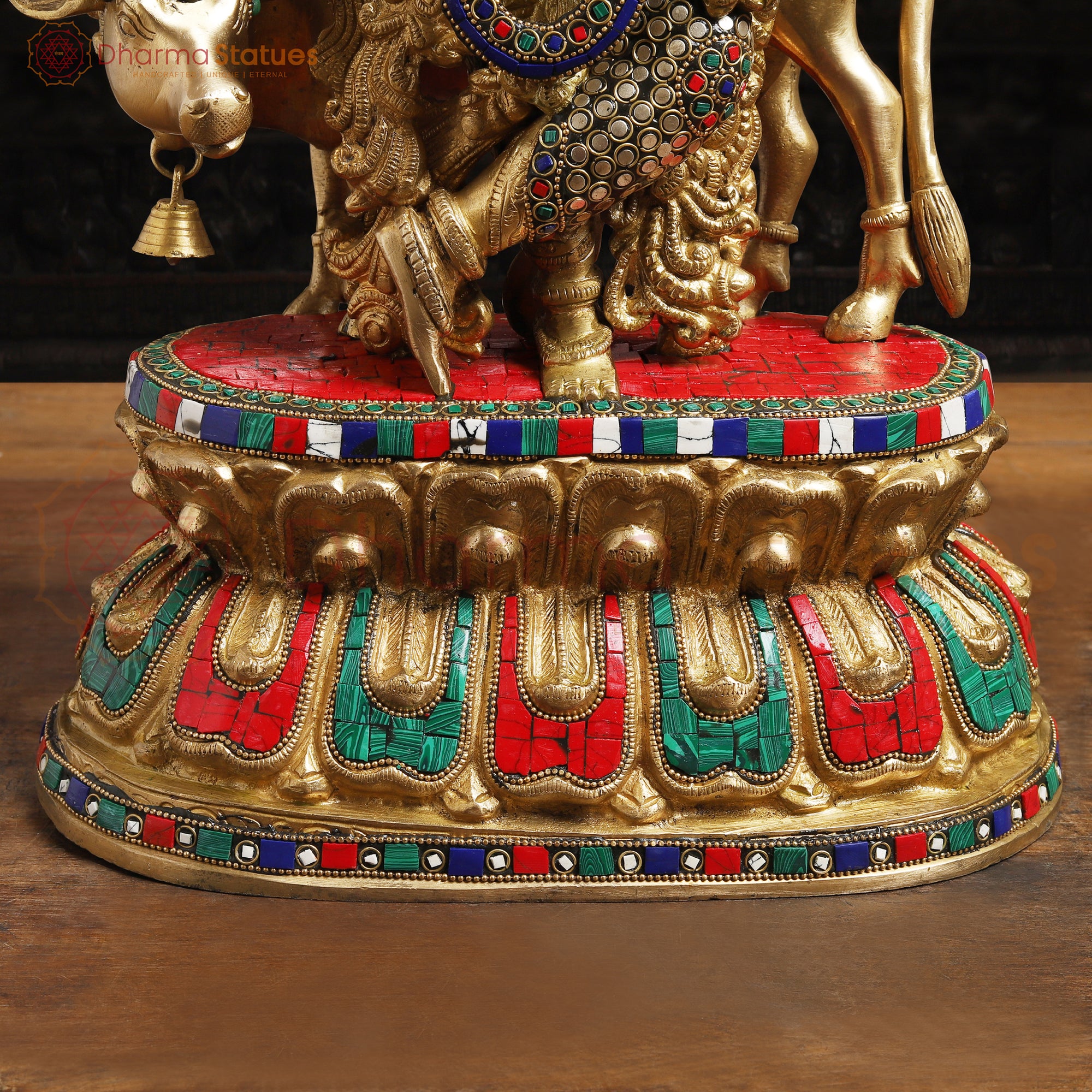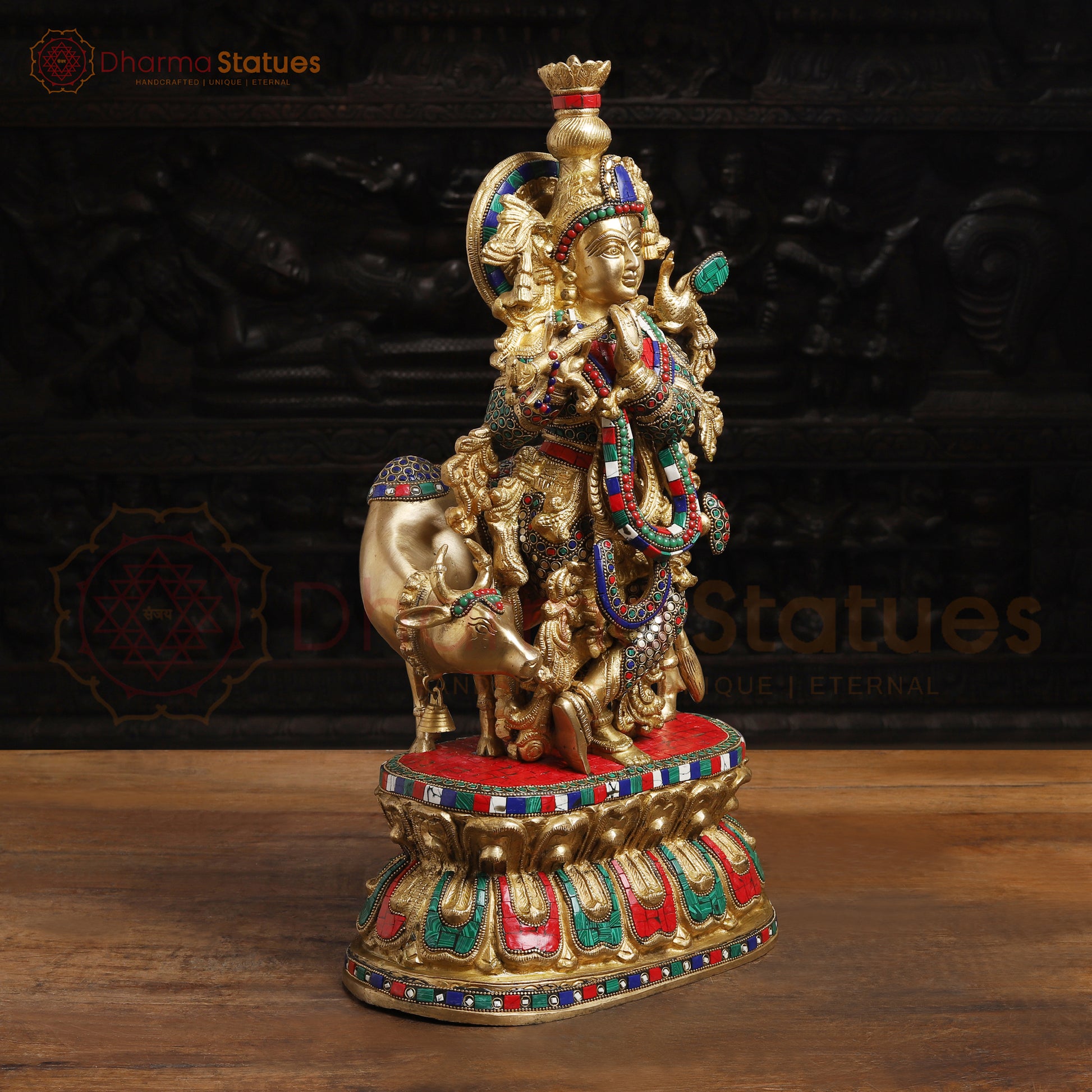Brass Lord Krishna Statue with Cow, Playing Flute, Golden Finish with Stone Work, 21"