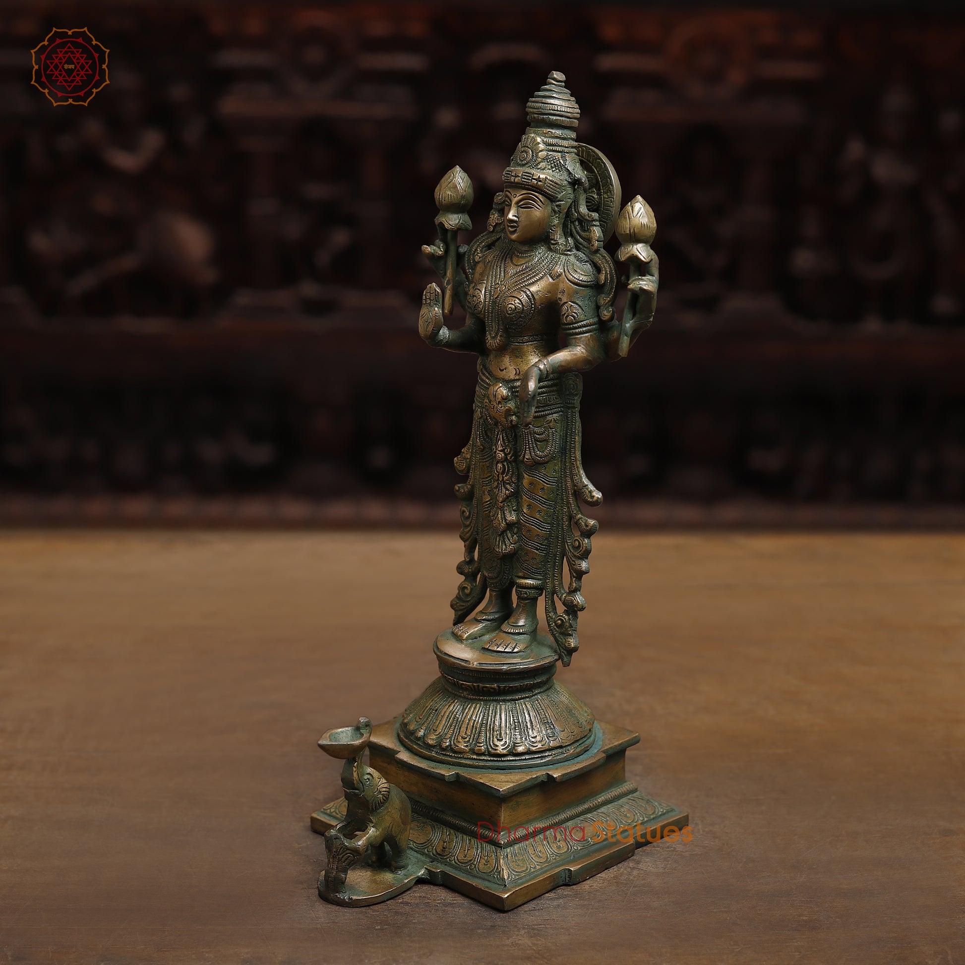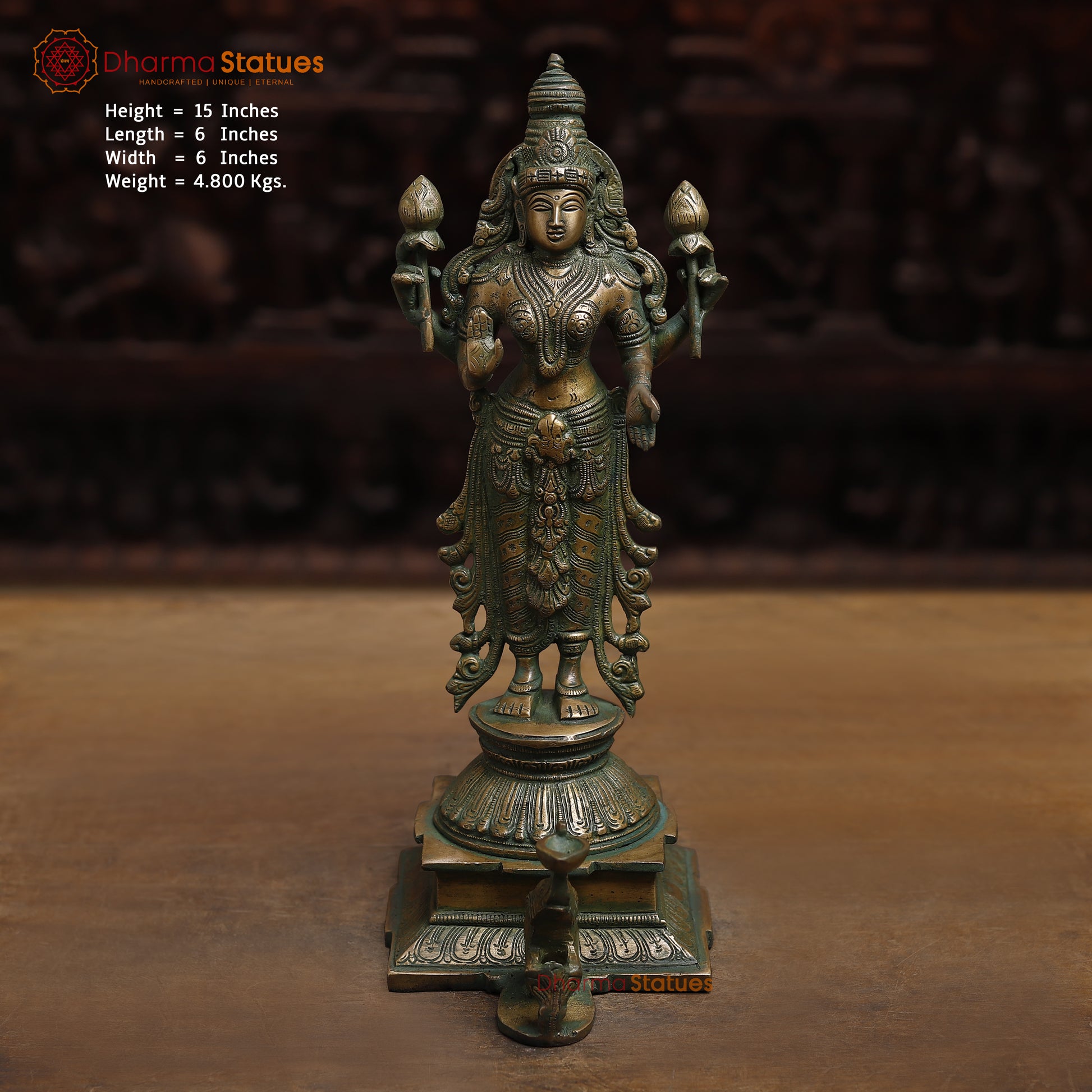 Experience timeless beauty with our Brass Lakshmi statue. Crafted with antique golden and green finish, this 15" statue exudes elegance and grace. Perfect for home decor or as a traditional gift, it adds a touch of divinity to any space. Made of high-quality brass, it is a stunning piece of art that will last for generations.