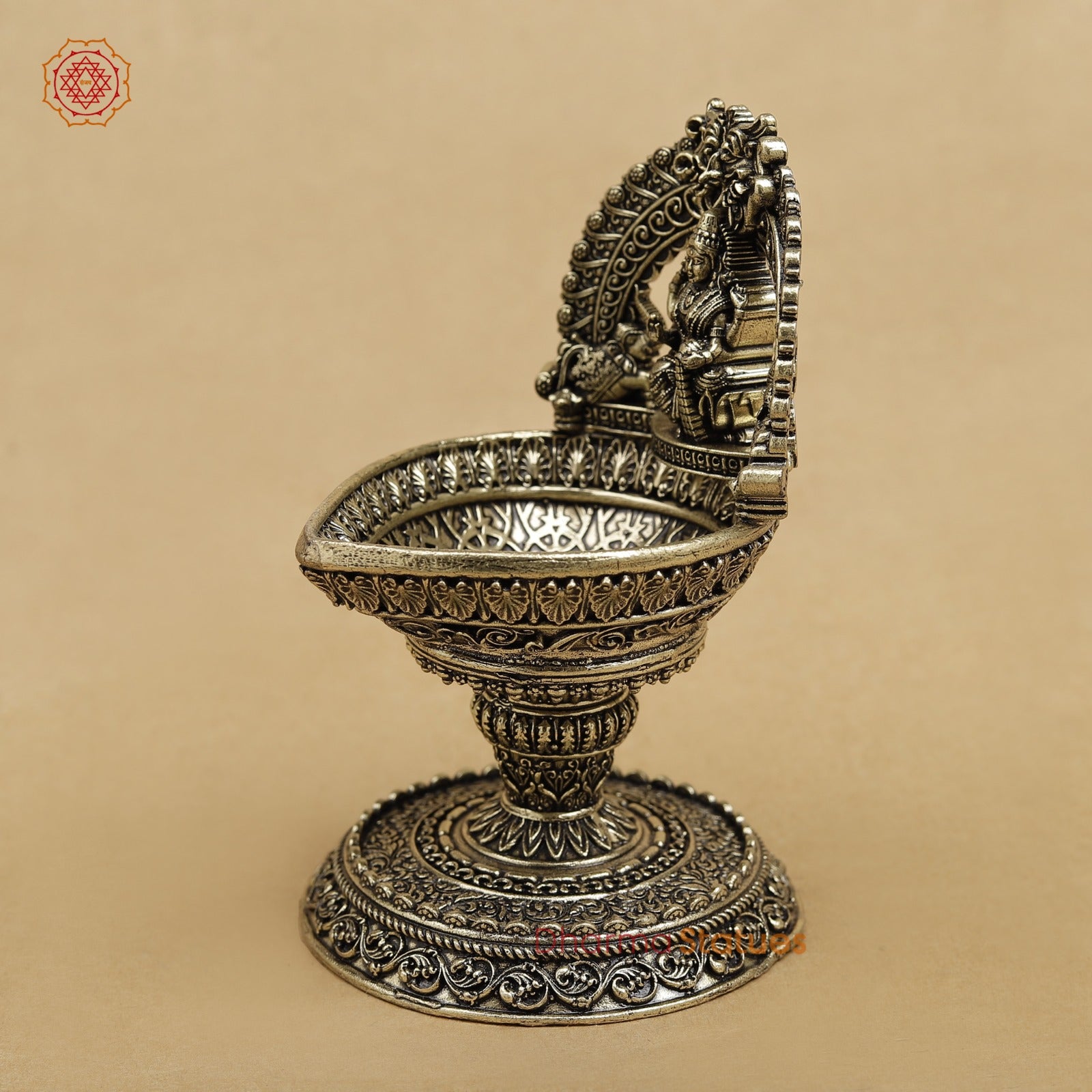 A beautifully designed brass diya featuring Goddess Lakshmi under a decorative arch, symbolizing wealth, prosperity, and divine blessings. Perfect for home temples, pooja rituals, and festive décor.