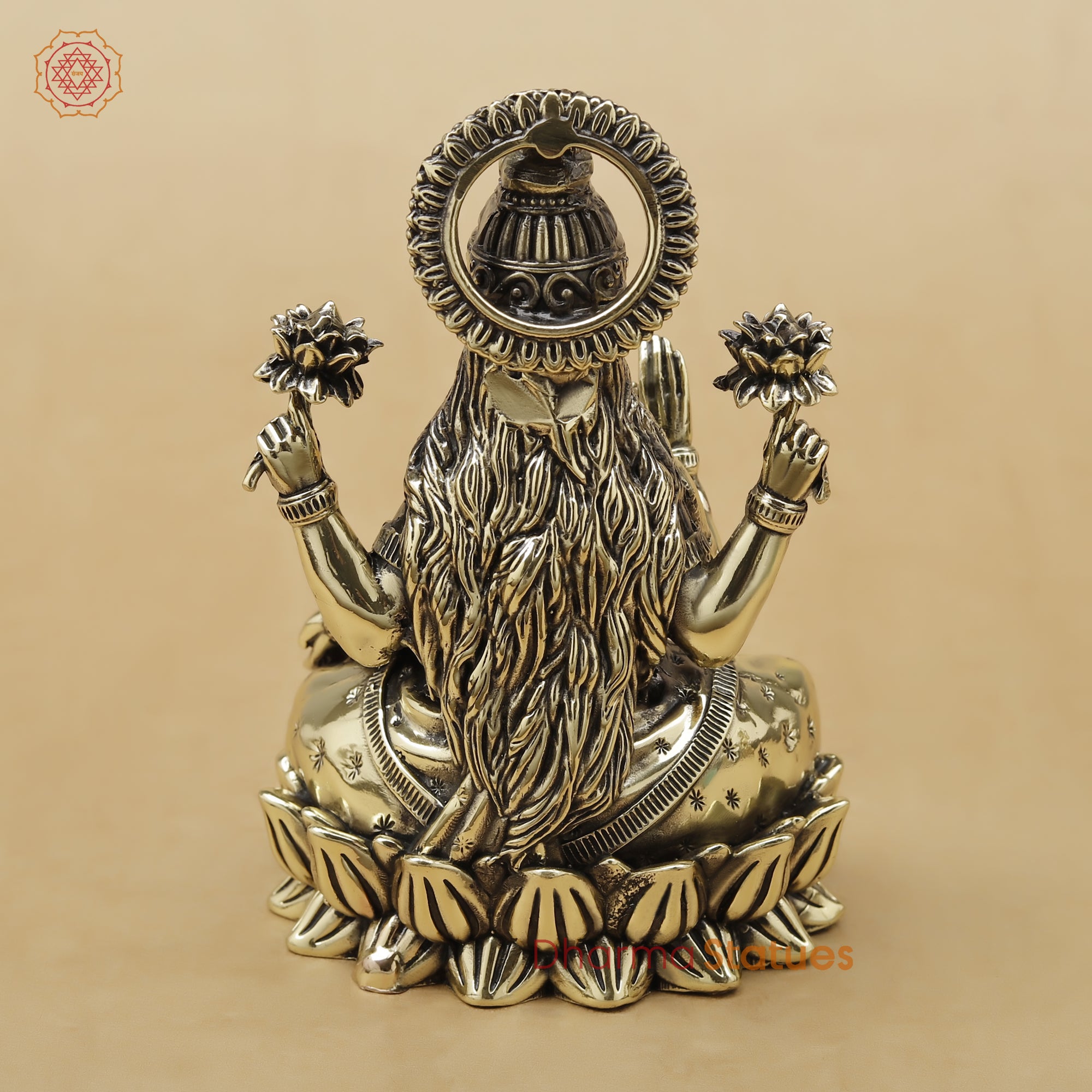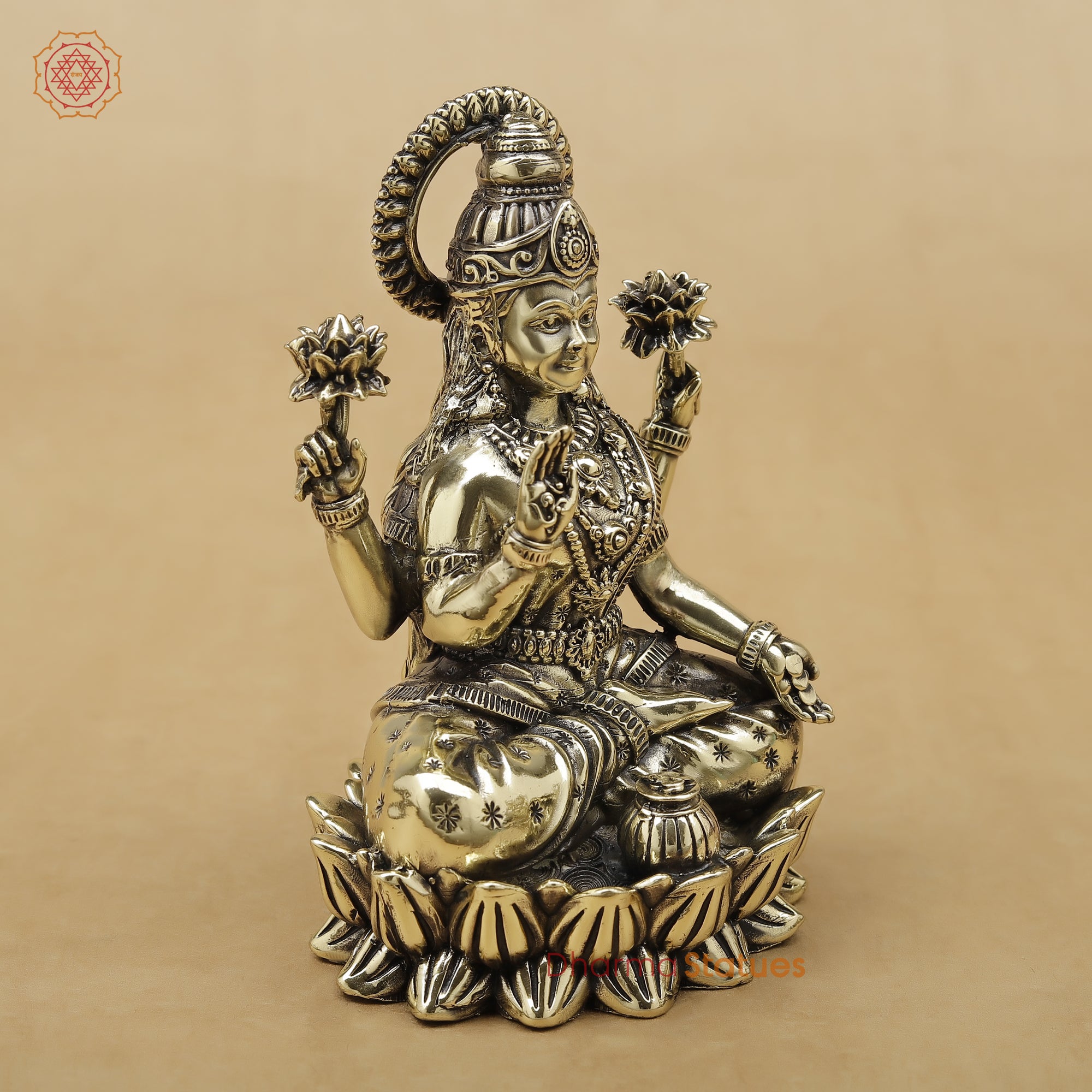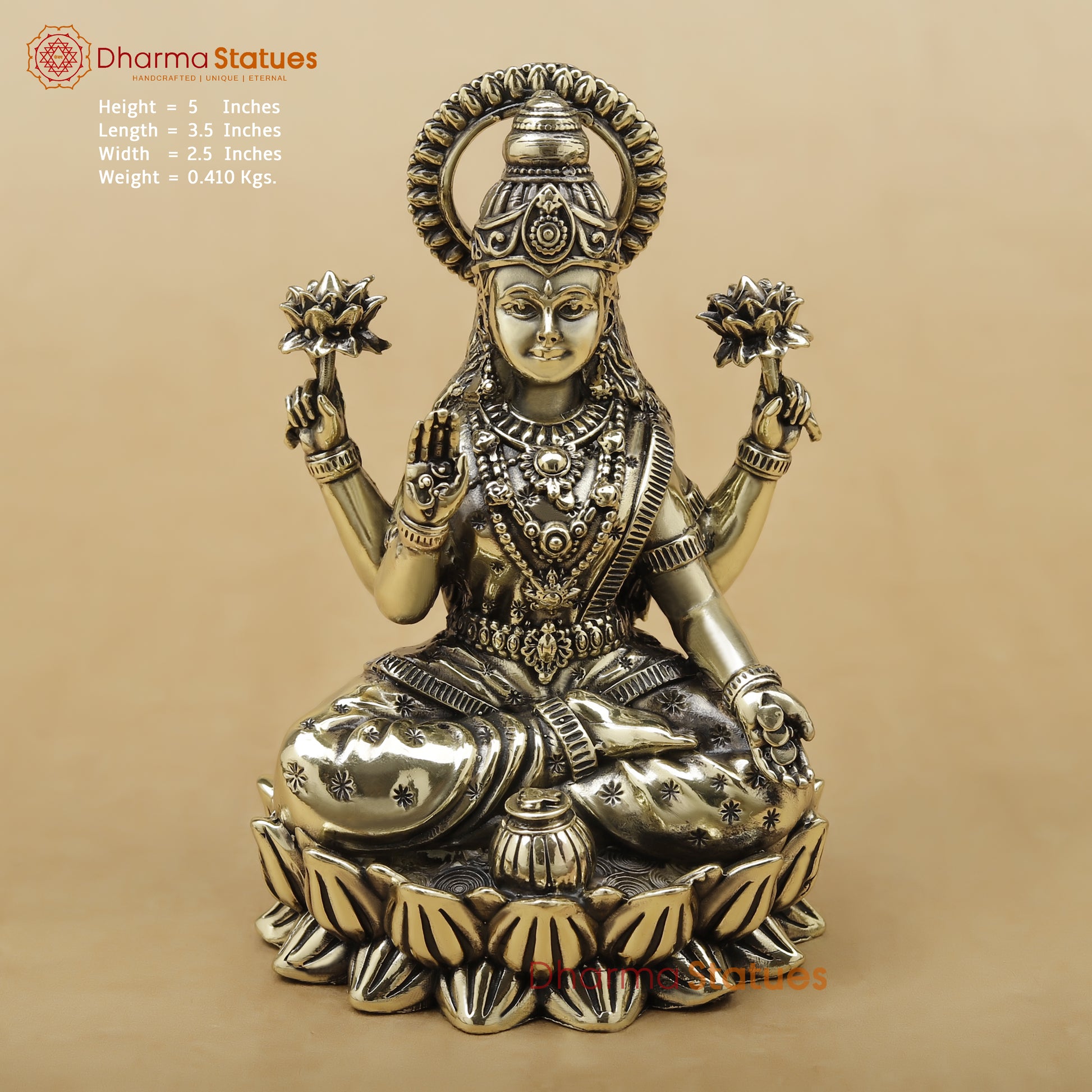 Invite prosperity, abundance, and divine grace into your home with this stunning 5-inch Lakshmi Idol, exquisitely handcrafted with intricate details and finished in an elegant antique metallic tone. Seated on a beautifully sculpted lotus pedestal, Goddess Lakshmi radiates purity, wealth, and auspicious energy.