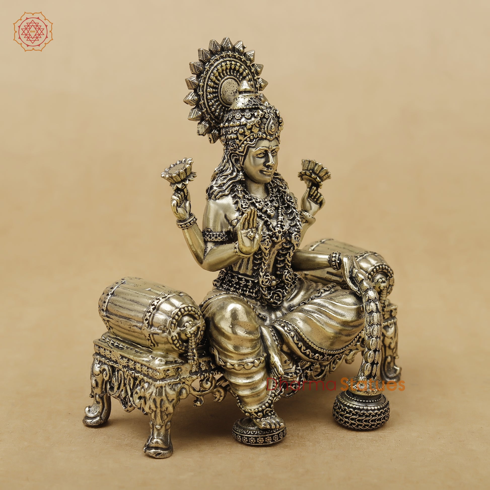 Invite prosperity and good fortune into your home with this beautifully detailed Lakshmi Maa statue. Crafted in an antique brass finish, this compact idol showcases the goddess seated on a lotus, symbolizing purity, abundance, and spiritual growth. Perfect for small mandirs, work desks, and gifting on auspicious occasions.