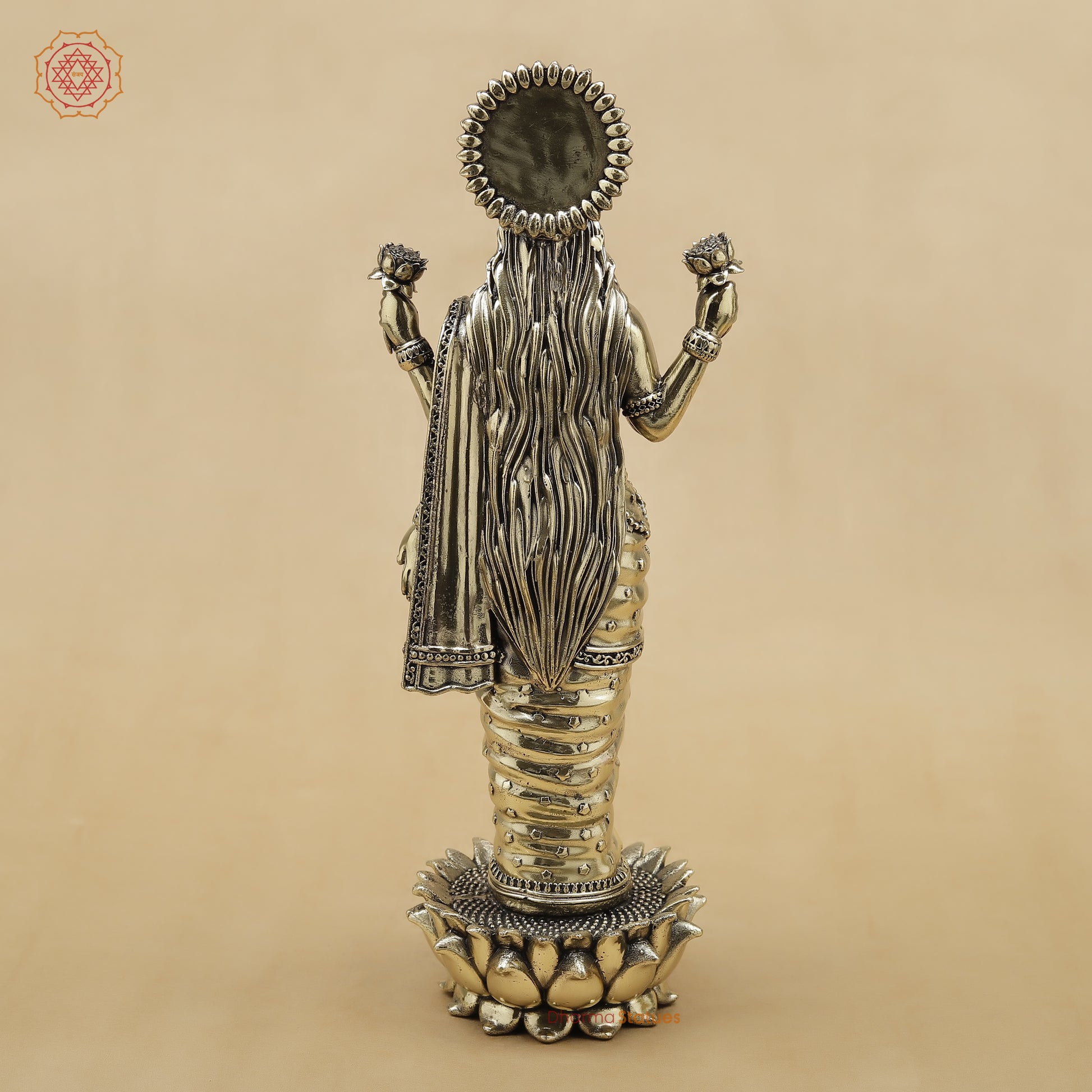 Invite prosperity, abundance, and divine blessings into your home with this beautifully crafted Brass Goddess Lakshmi Statue. Finely casted with intricate detailing, the idol depicts Maa Lakshmi standing gracefully on a lotus pedestal, holding lotus flowers symbolizing purity and spiritual wealth. The antique brass finish enhances its timeless elegance, making it perfect for home temples or as a precious gift.