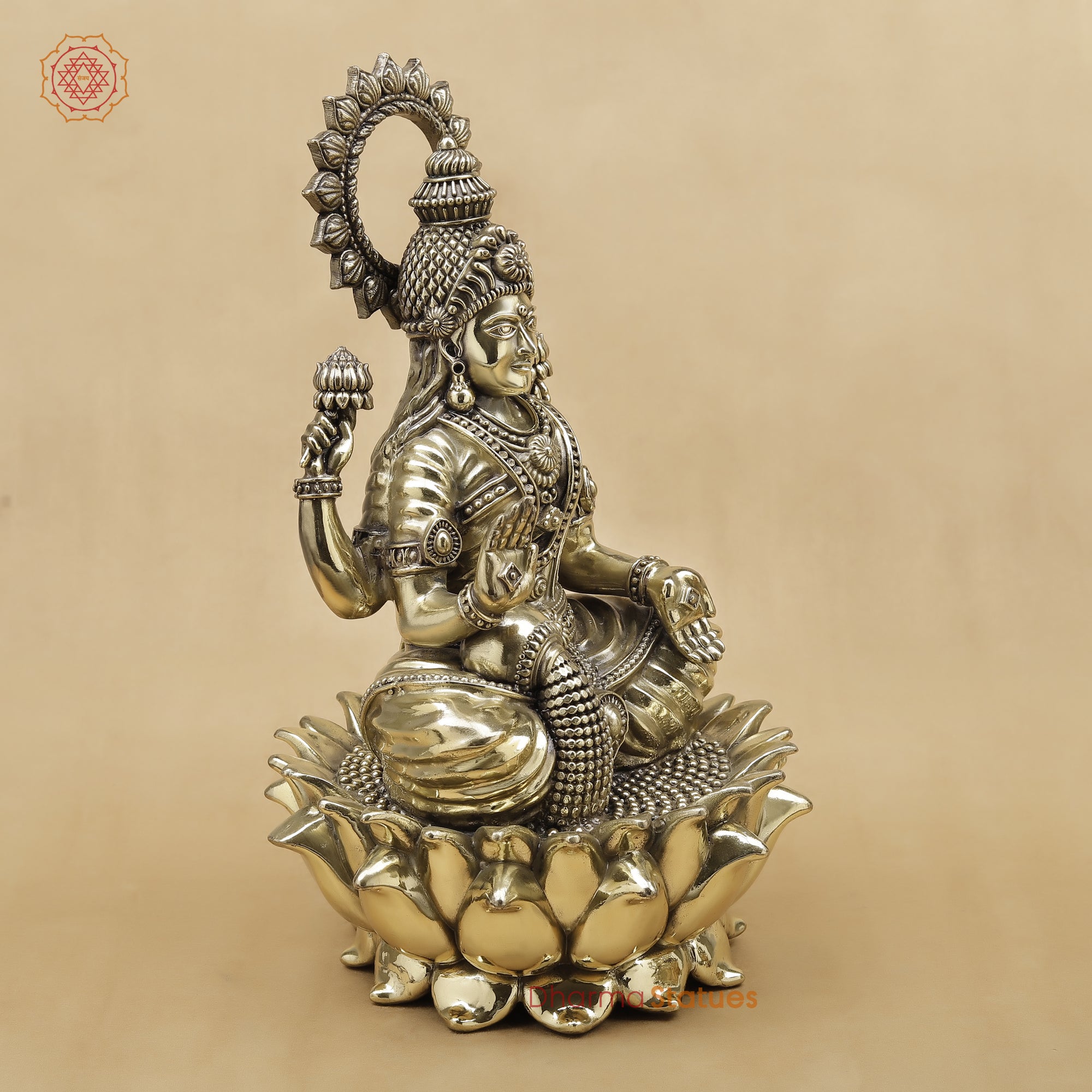 Invite prosperity, abundance, and divine blessings into your home with this exquisitely crafted Brass Goddess Lakshmi Statue. Seated gracefully on a beautifully detailed lotus pedestal, Maa Lakshmi is adorned with intricate fine-casted detailing and an elegant antique finish. Her serene posture and symbolic lotus flowers represent wealth, purity, and spiritual growth making this idol a stunning centerpiece for any sacred space.