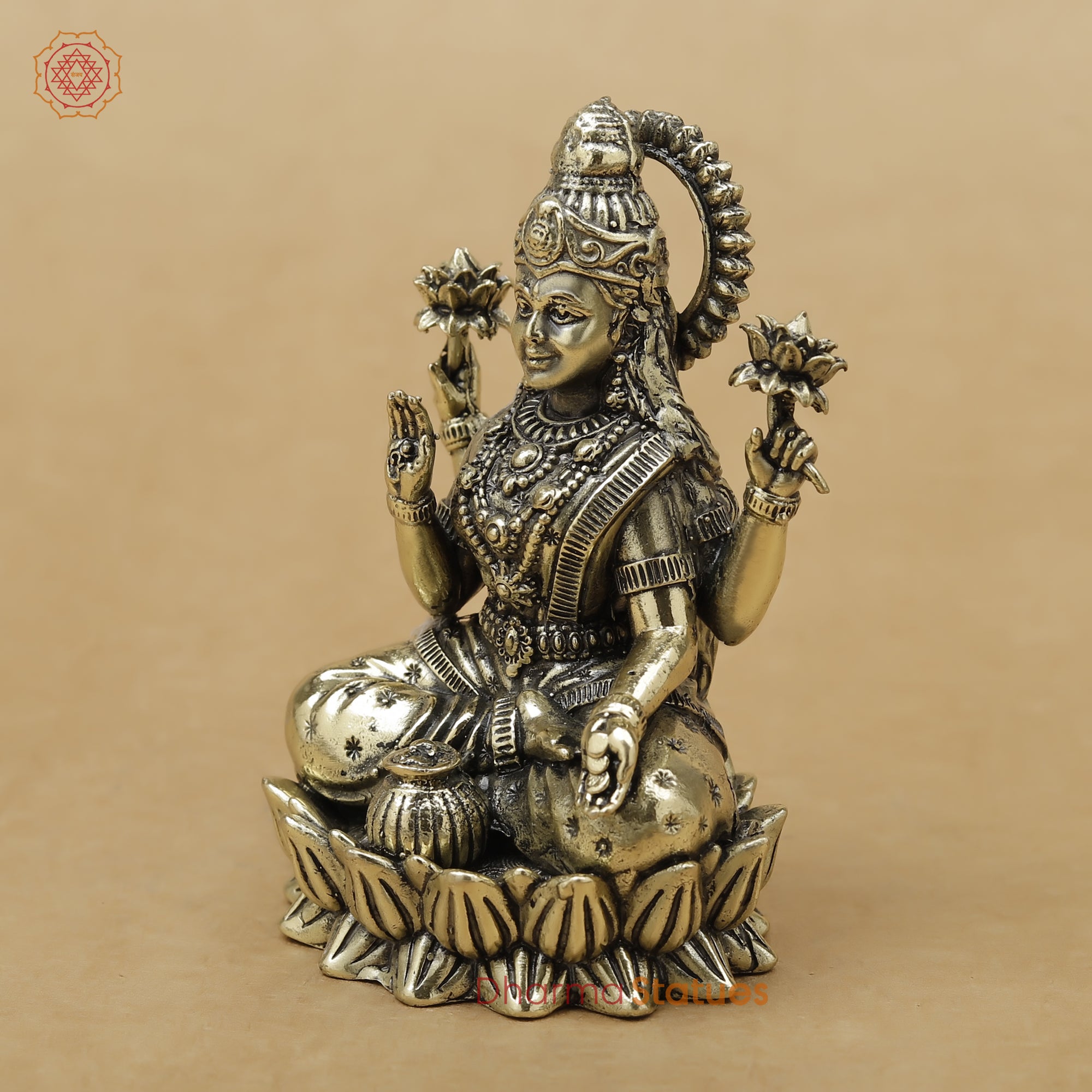 Invite divine prosperity, abundance, and serenity into your home with this exquisitely crafted Maa Lakshmi brass statue. Designed with fine detailing and an elegant antique finish, this idol beautifully captures the goddess seated in a blessing posture, holding lotus flowers symbolizing purity and wealth.