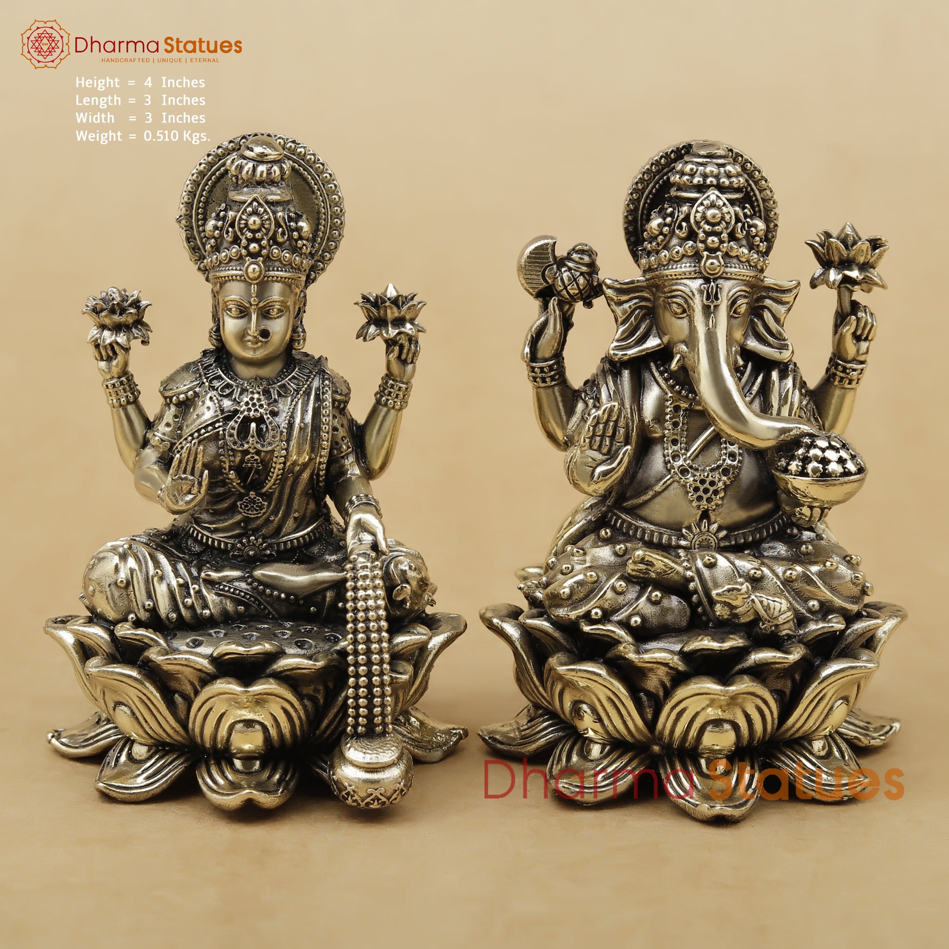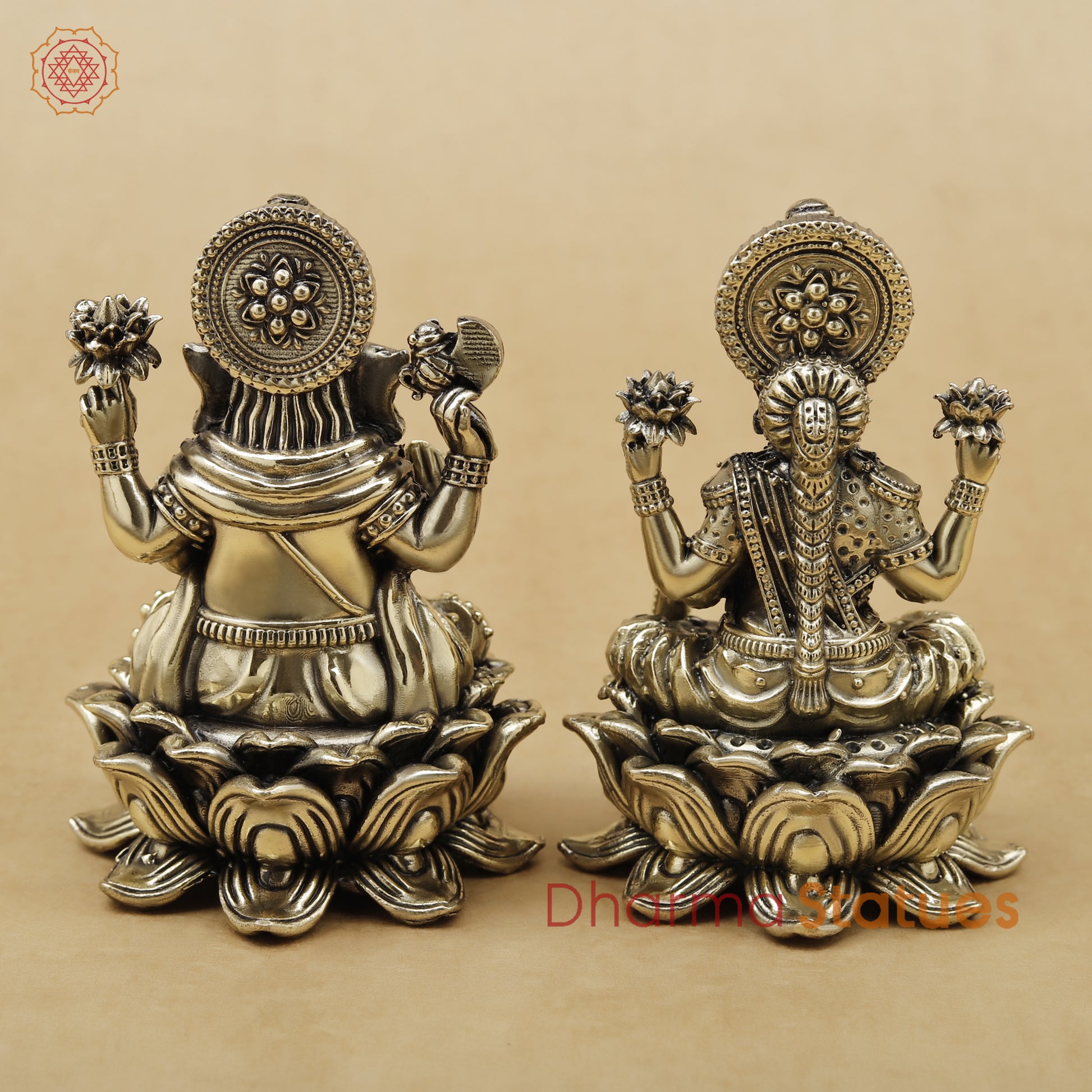 Crafted with intricate detailing and finished in a rich antique metallic tone, this idol set showcases premium artistry—from the elaborate crowns and jewelry to the lifelike lotus petals and symbolic accessories. The pair embodies auspiciousness, wealth, wisdom, and protection—making it perfect for homes, workplaces, and festive décor.