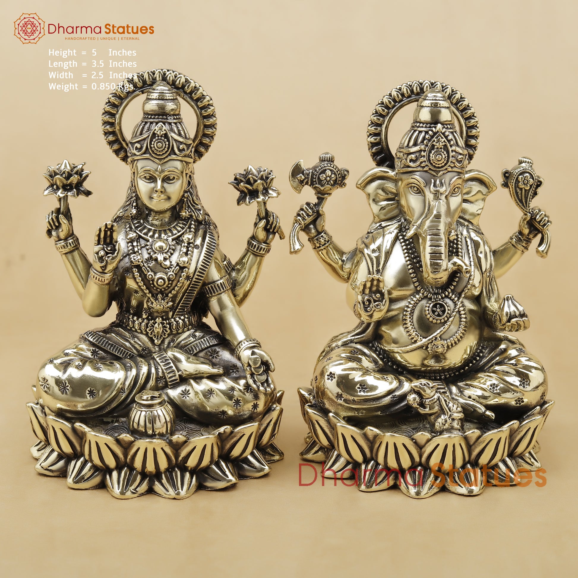 Invite abundance, wisdom, and auspicious energy into your home with this magnificent 5-inch Lakshmi–Ganesha Lotus Idol Set. Expertly handcrafted with intricate detailing, these statues depict Goddess Lakshmi and Lord Ganesha seated gracefully on blooming lotus bases—symbolizing purity, prosperity, spiritual growth, and positivity.