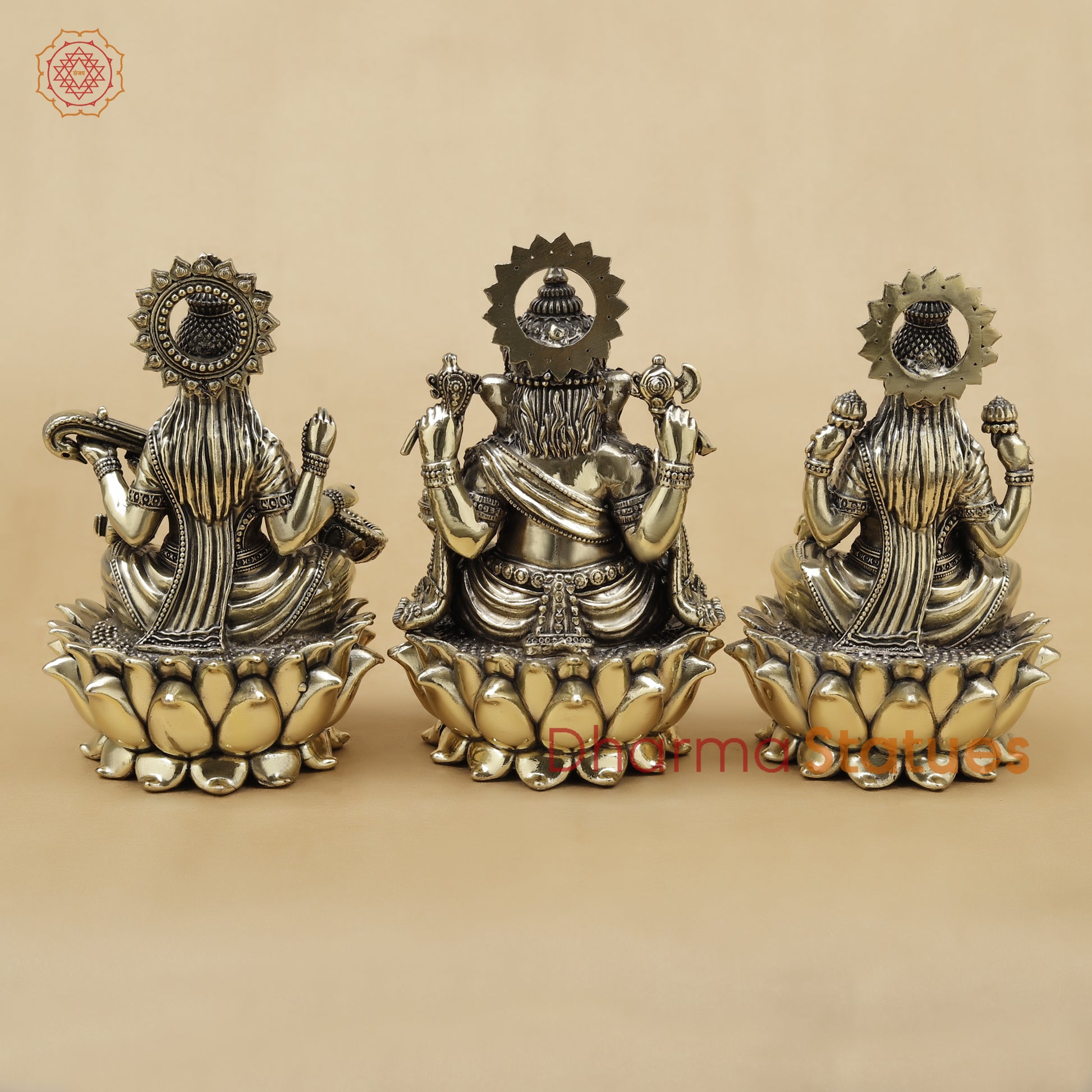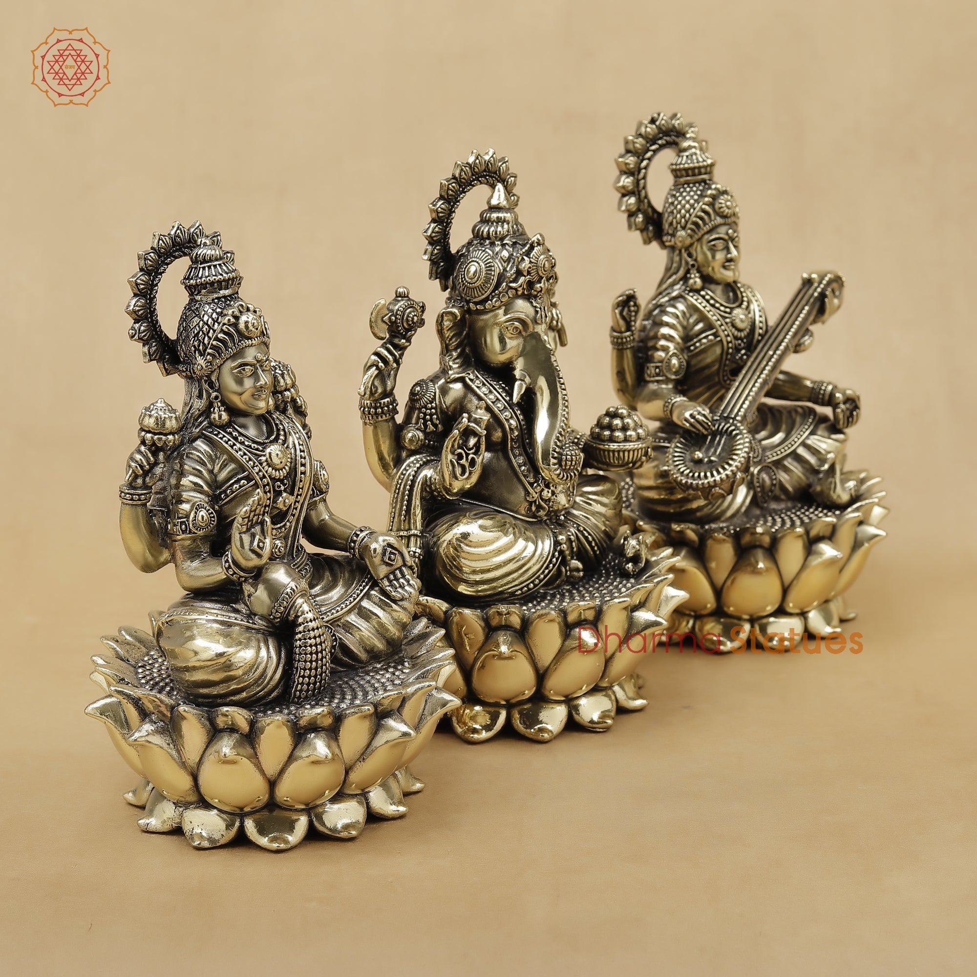 This elegant trio of Lakshmi, Ganesha, and Saraswati symbolizes prosperity, wisdom, and knowledge. Expertly crafted in fine brass and seated on lotus bases, the set enhances spiritual energy and décor. Ideal for homes, offices, and festive gifting, it brings divine blessings and aesthetic charm to any sacred space.