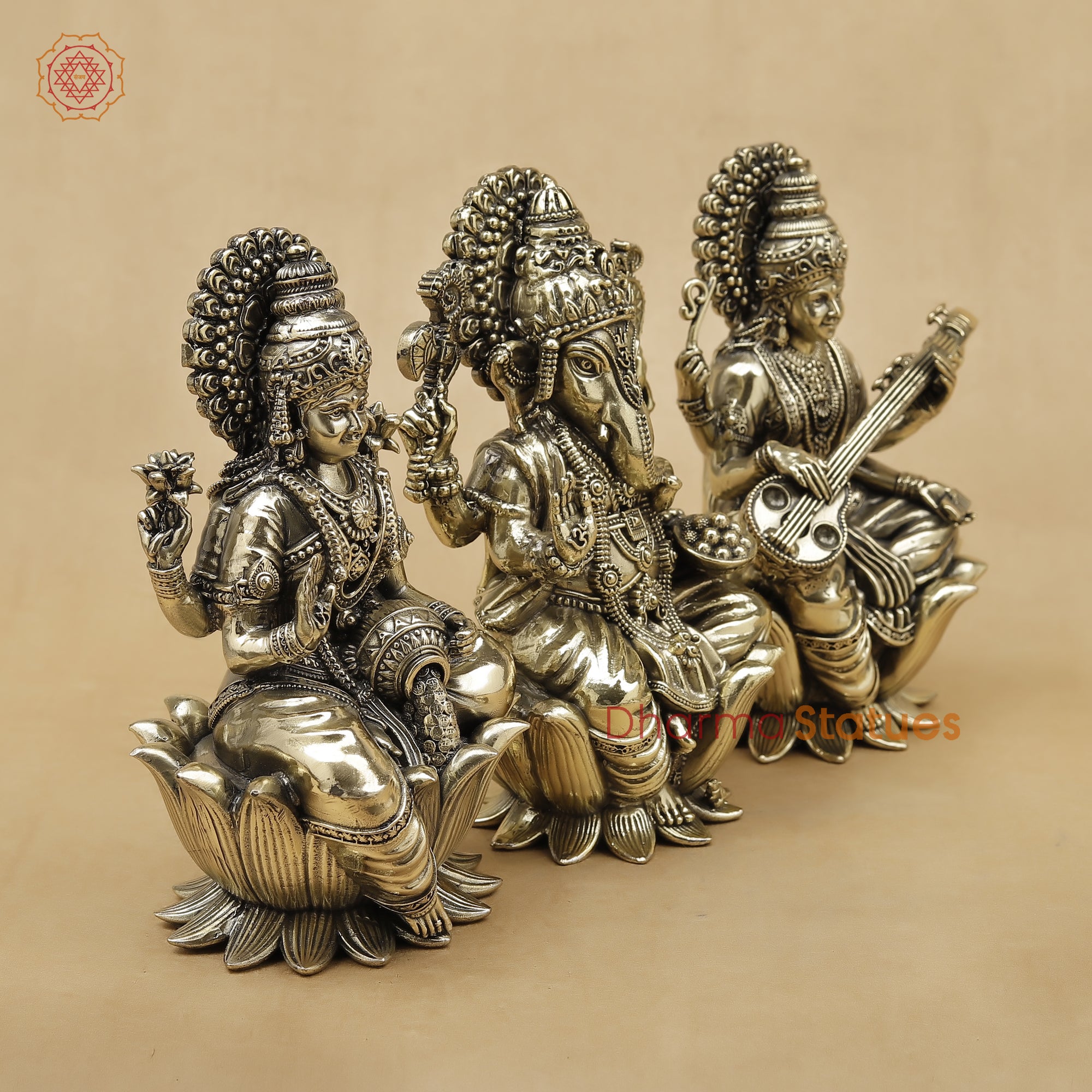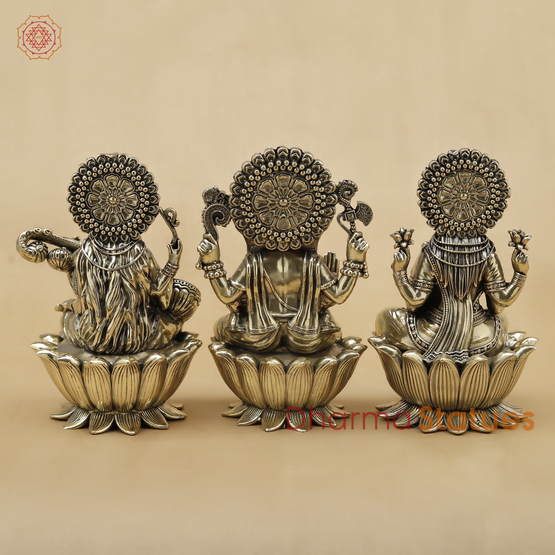 This elegant trio of Lakshmi, Ganesha, and Saraswati symbolizes prosperity, wisdom, and knowledge. Expertly crafted in fine brass and seated on lotus bases, the set enhances spiritual energy and décor. Ideal for homes, offices, and festive gifting, it brings divine blessings and aesthetic charm to any sacred space.