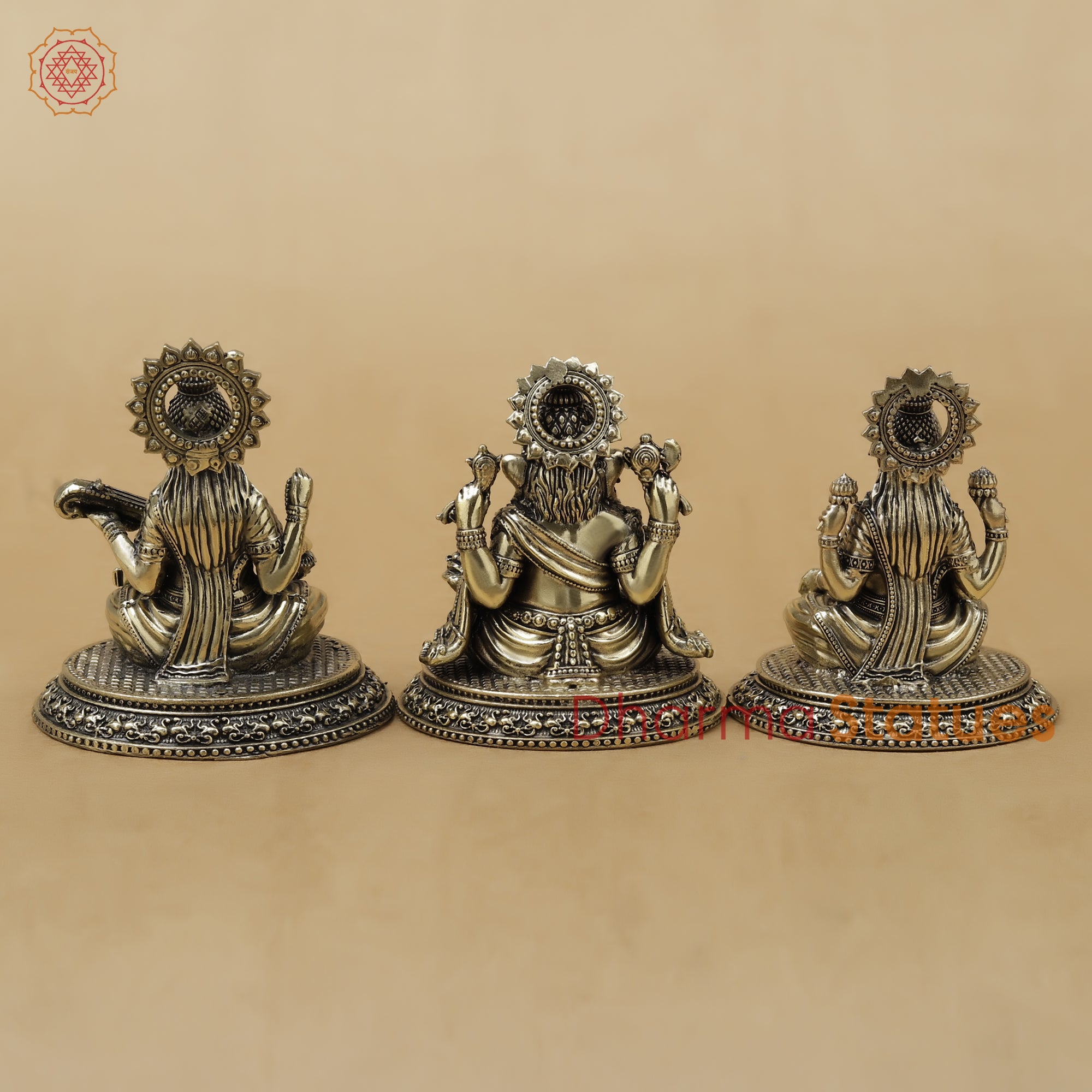 The fine detailing on jewelry, attire, crowns, lotus motifs, and the divine instruments showcases exceptional craftsmanship. The antique metallic finish enhances the timeless elegance of each statue, making this set a perfect centerpiece for your pooja room or living space.