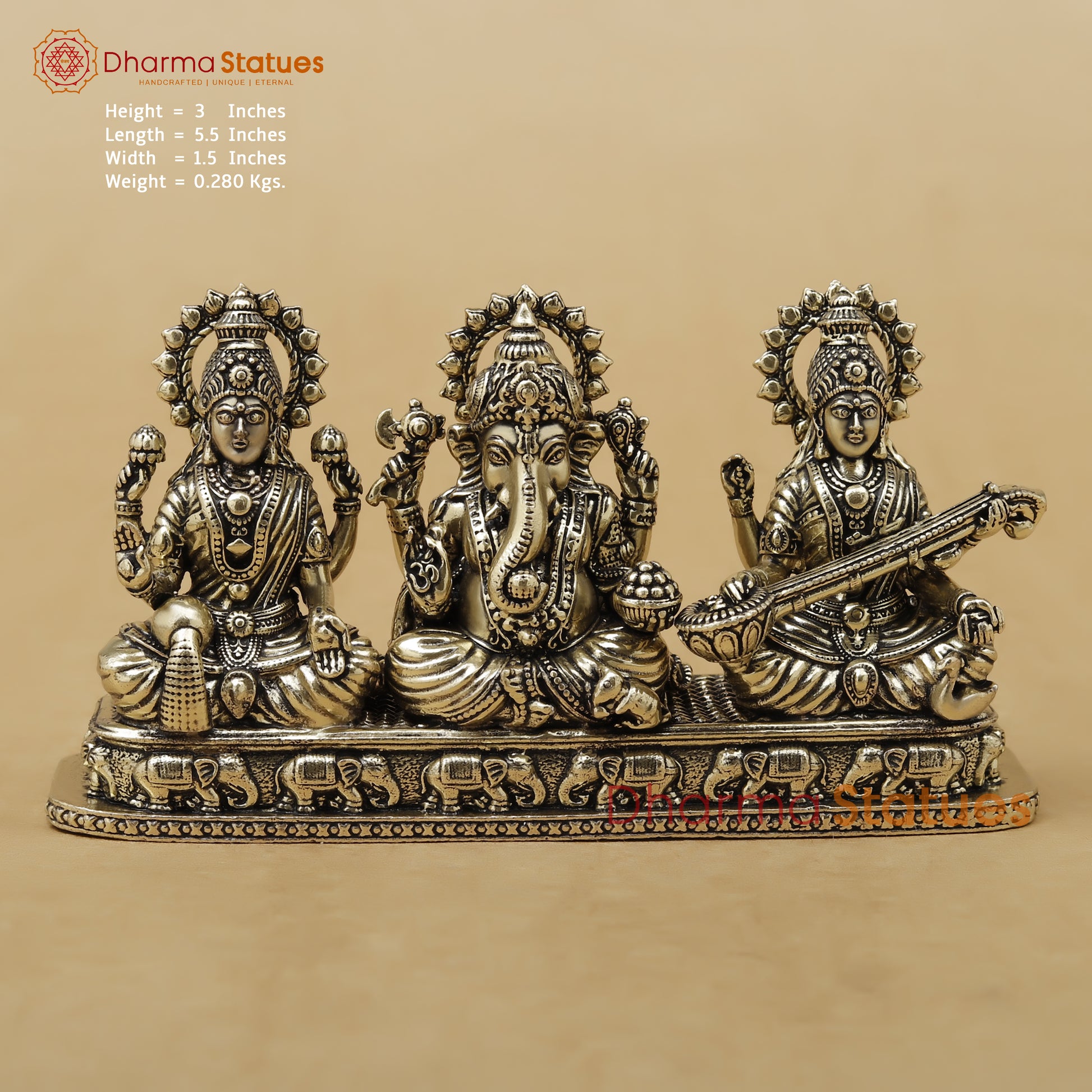 Invite abundance, wisdom, and harmony into your home with this intricately handcrafted Lakshmi–Ganesha–Saraswati Brass Trio Statue by Dharma Statues. Beautifully sculpted with fine detailing, the trio sits on a richly carved base adorned with traditional elephant motifs, symbolizing strength and auspiciousness.