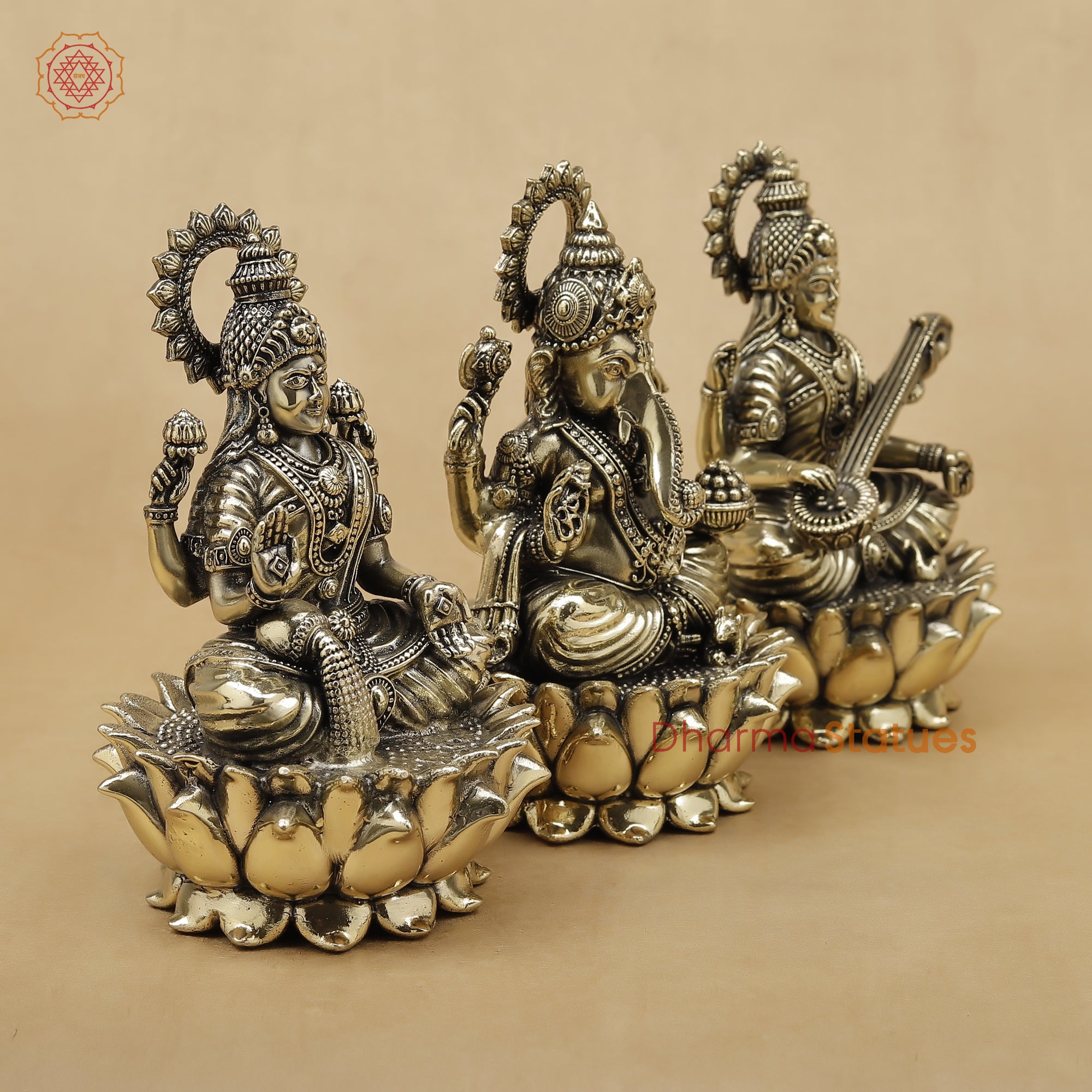 This elegant trio of Lakshmi, Ganesha, and Saraswati symbolizes prosperity, wisdom, and knowledge. Expertly crafted in fine brass and seated on lotus bases, the set enhances spiritual energy and décor. Ideal for homes, offices, and festive gifting, it brings divine blessings and aesthetic charm to any sacred space.
