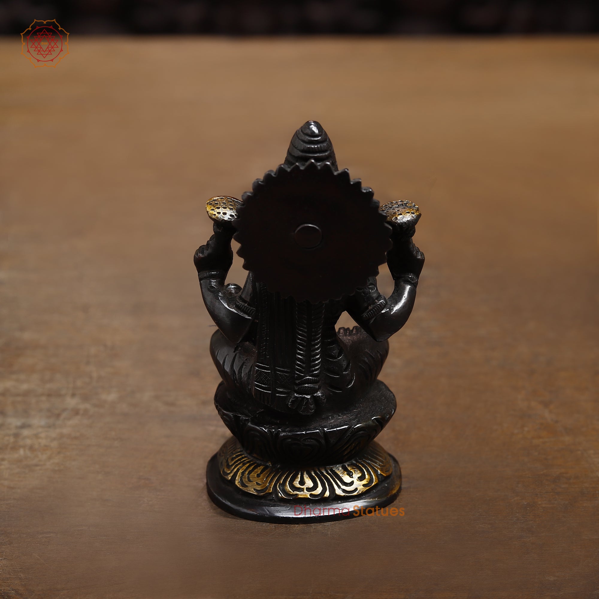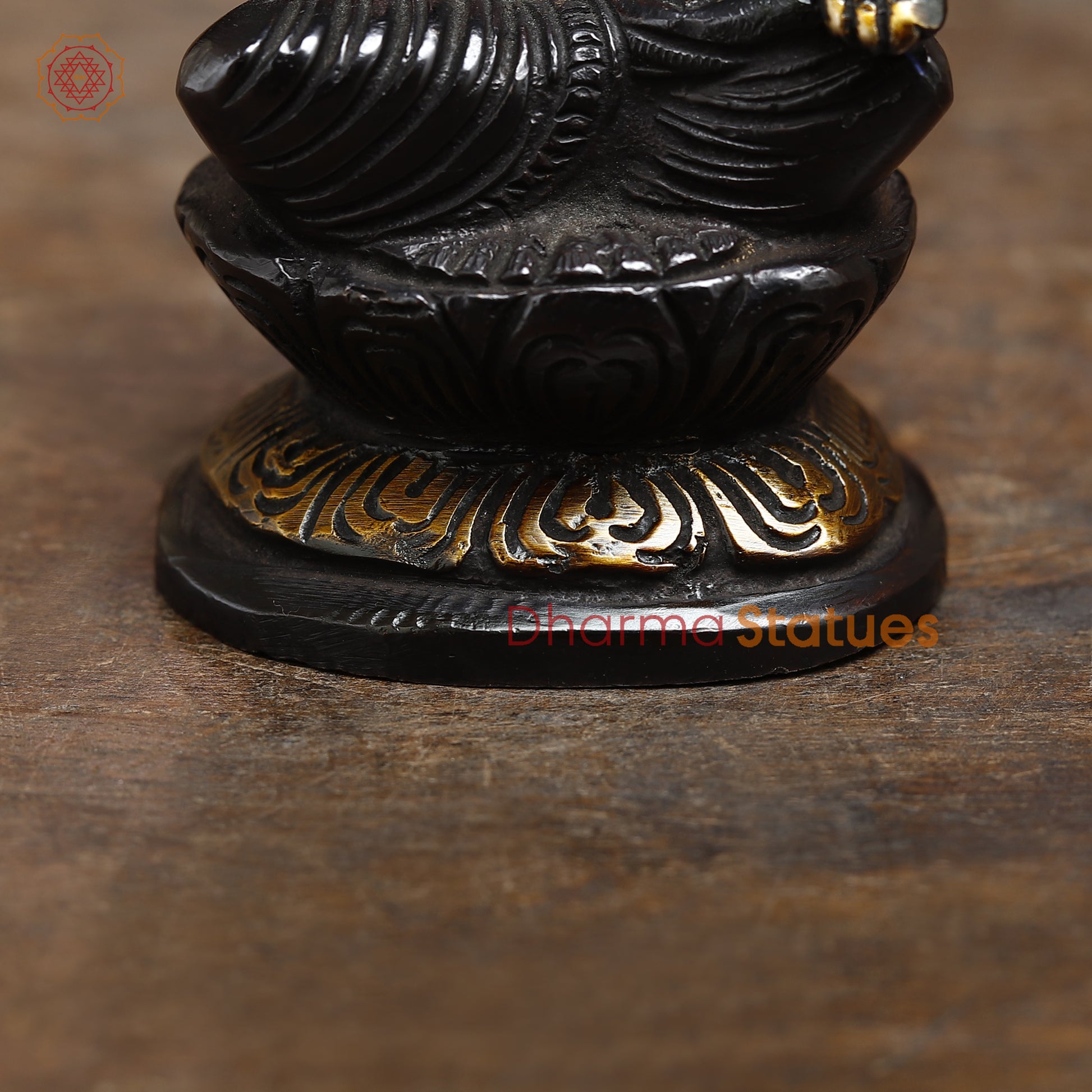This 4.5" brass figurine features Lakshmi, the Hindu goddess of prosperity, seated in a blessing posture with a stunning black patina and golden finish. Elevate your space with this elegant and auspicious depiction of abundance and good fortune.
