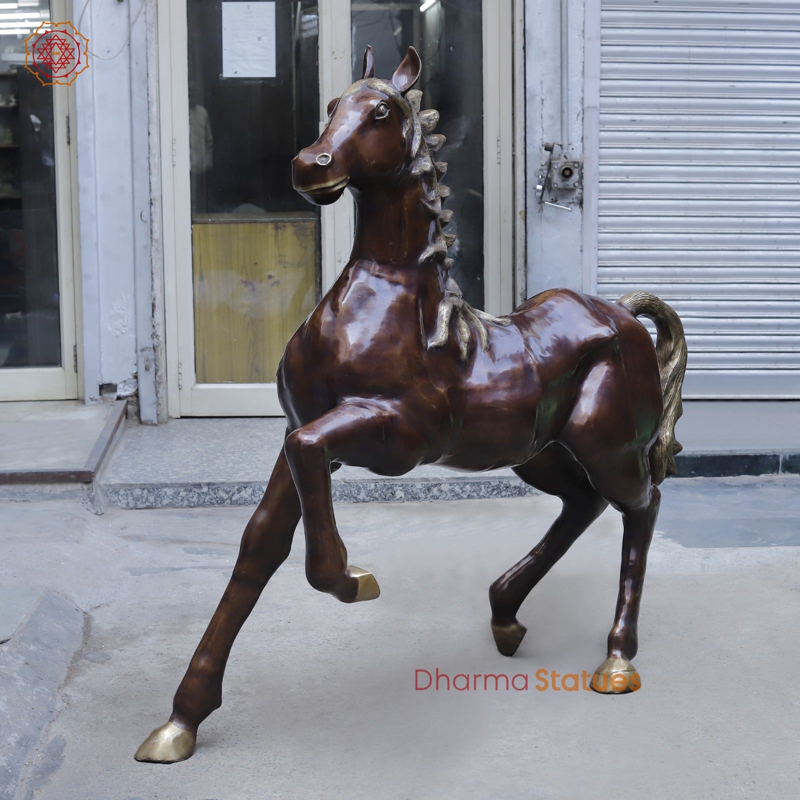A majestic handcrafted Brass Horse captured in a powerful running posture, finished in a rich antique copper tone with subtle highlights. Symbolizing strength, speed, success, and positive energy, this large-scale sculpture makes a bold statement. With dynamic movement and fine craftsmanship, it is ideal for grand entrances, corporate spaces, gardens, or premium interior décor, bringing elegance, power, and timeless appeal to any setting.