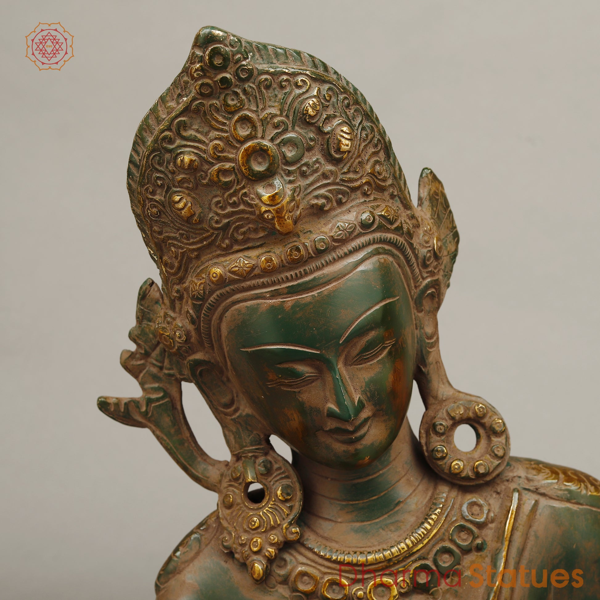 This meticulously crafted Brass Lord Indra statue showcases the divine king of the heavens with intricate detailing and a captivating green patina finish, accented by golden hues. Lord Indra, depicted in a majestic pose, holds his iconic thunderbolt (Vajra), symbolizing his power and control over the forces of nature. The combination of the green patina and golden highlights adds a timeless, regal appeal, enhancing the statue’s spiritual significance. Perfect for worship, meditation, or as a sacred decorative piece, this statue radiates divine energy and strength, making it an ideal addition to any home or temple.