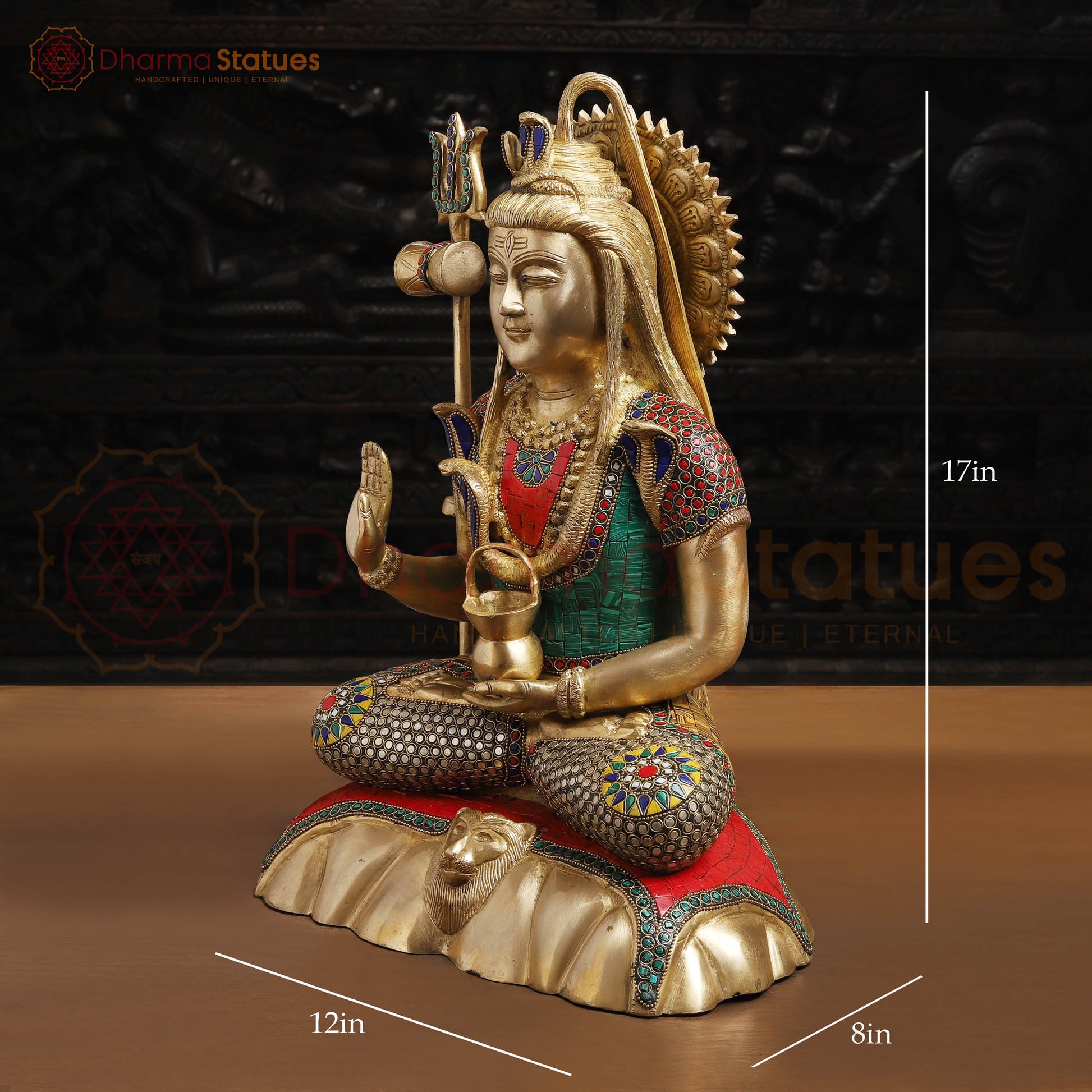 Brass Shiva Idol, Abhay Mudra, Intricate Stonework with Golden finish, 17"