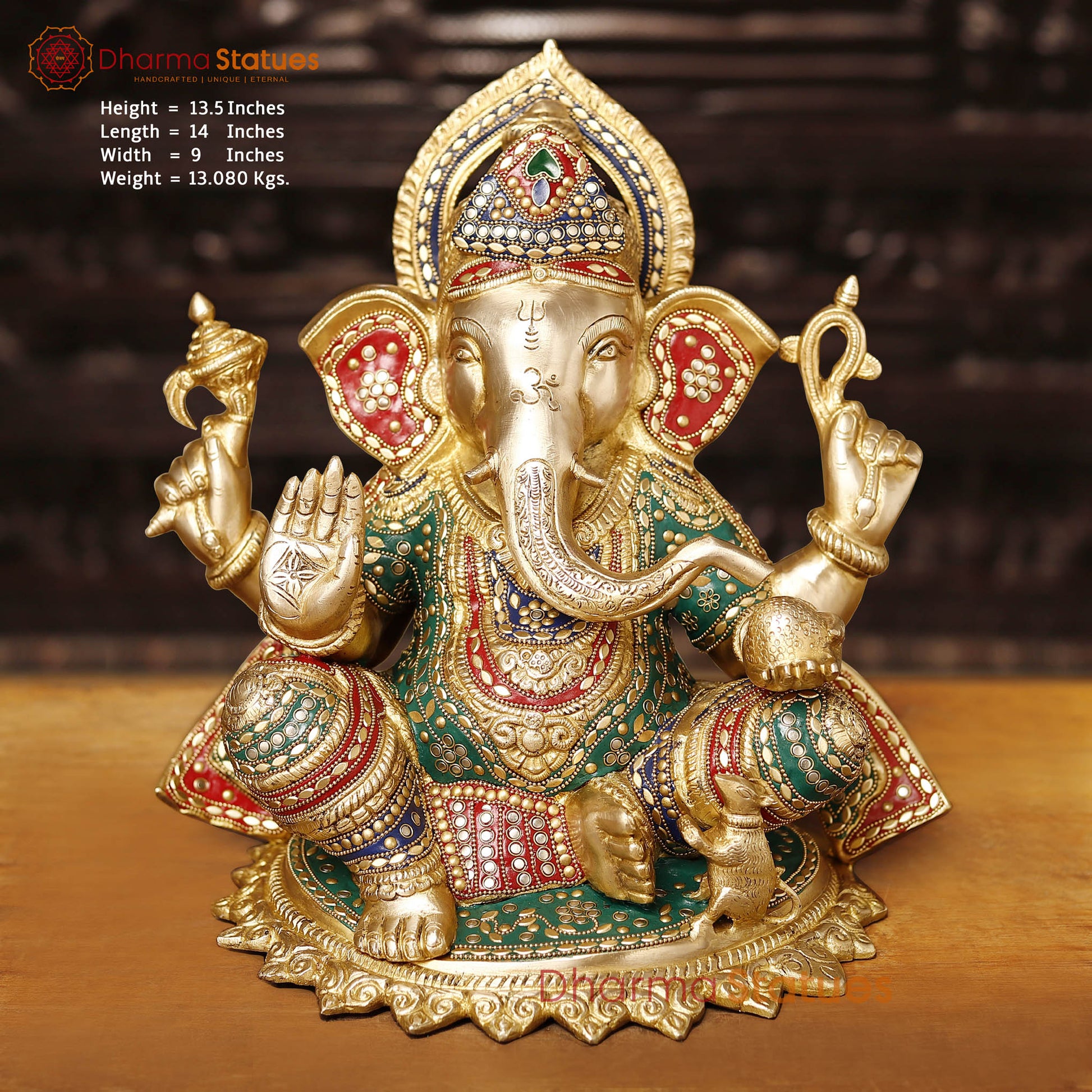 This handcrafted Brass Ganesha statue is a work of art made from brass, featuring intricate golden and stone work embellishments. The statue includes a depiction of Ganesh with his beloved mouse companion, adding a playful and auspicious touch. The combination of brass, golden finish, and stone work creates a captivating and harmonious ensemble, symbolizing prosperity and divine blessings. This beautiful statue is a cherished centerpiece in any sacred or decorative space, showcasing the craftsmanship and beauty of traditional art. Best for Wedding Gift | Diwali Gift | Gift purpose | Temple | worshipping | Perfect for Home decoration | Office decoration.