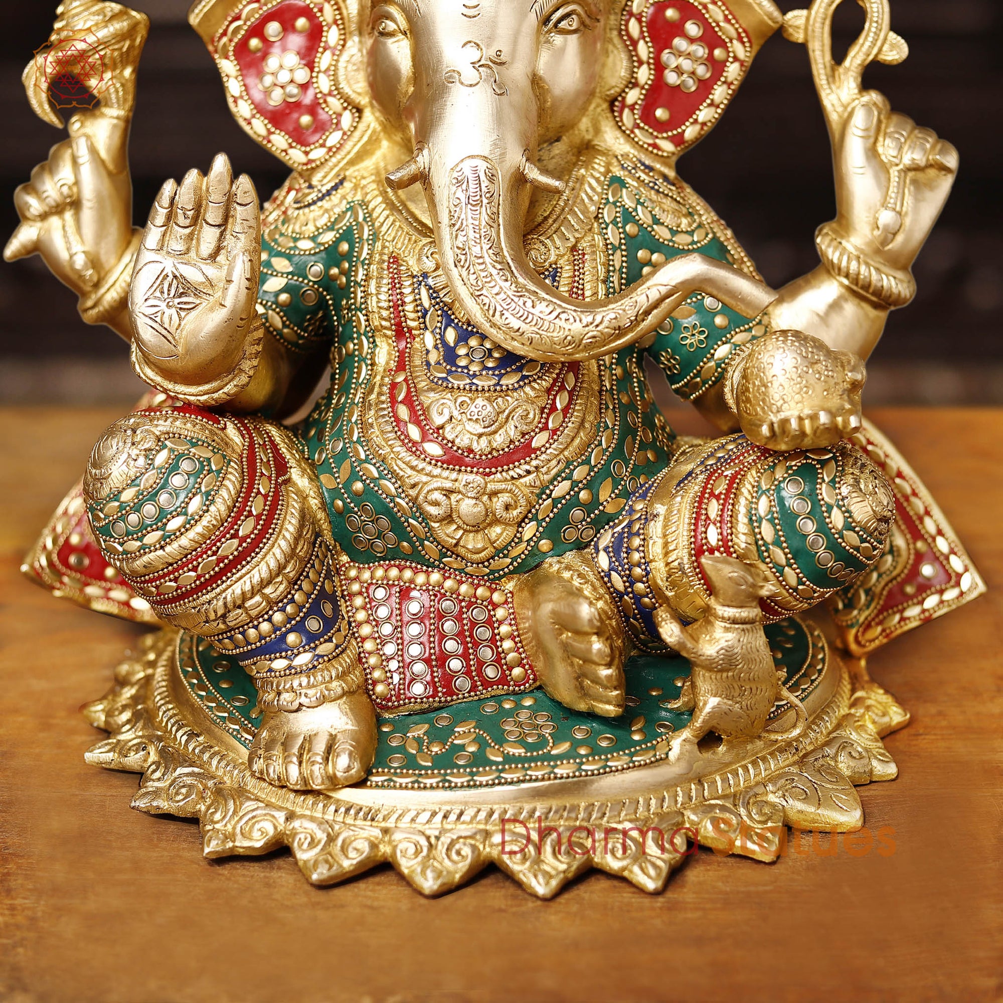 Brass Ganesh Sitting On Lotus Base, Golden Finish & Stonework, 13.5"