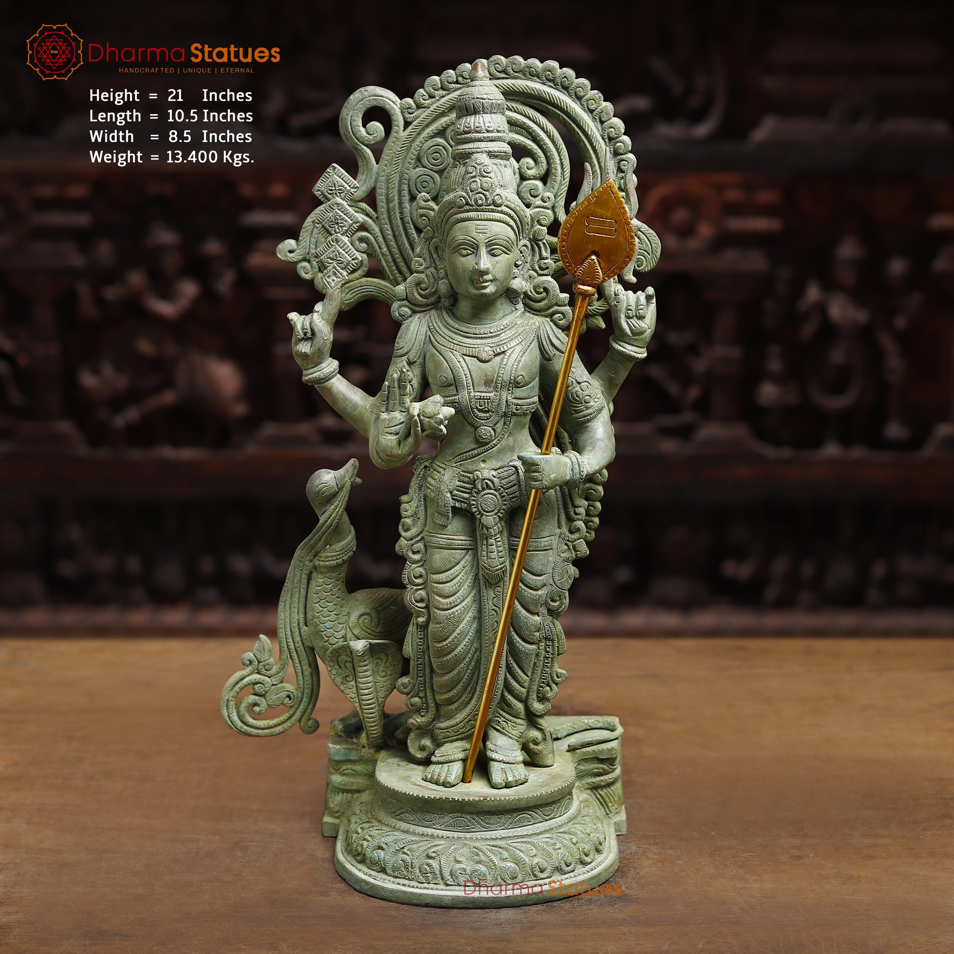 Brass Murugan with Peacock and Cobra, Antique Green Finish, 21"