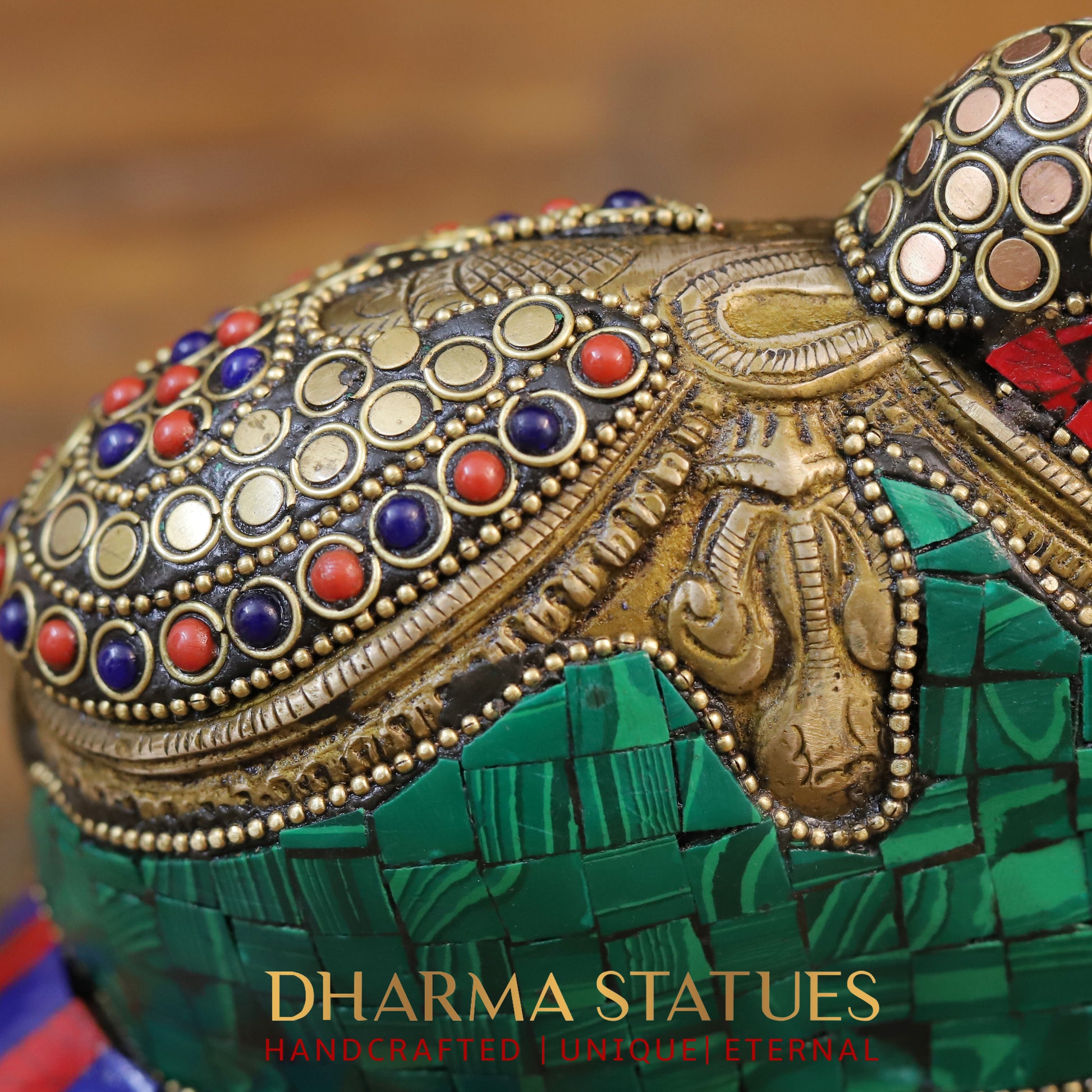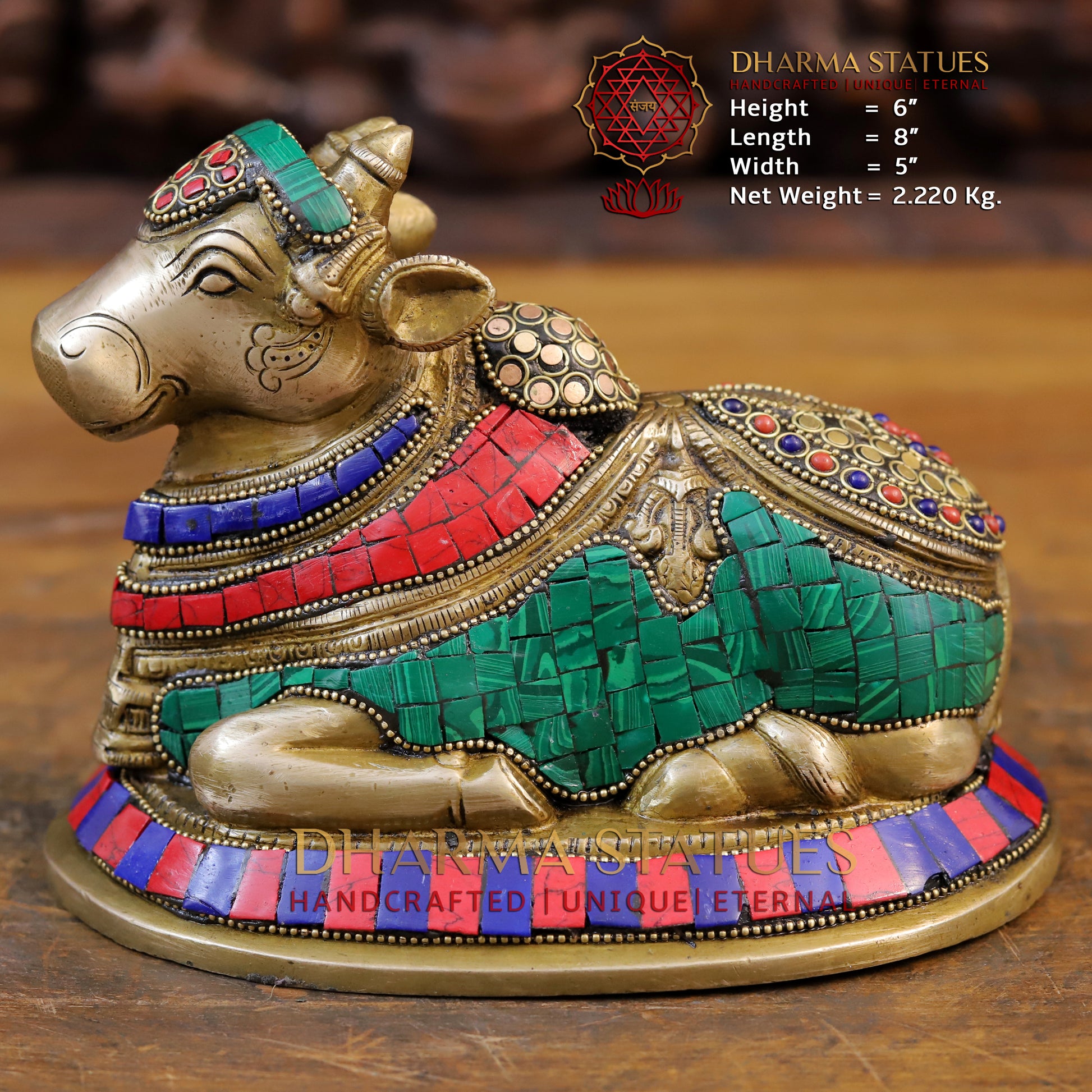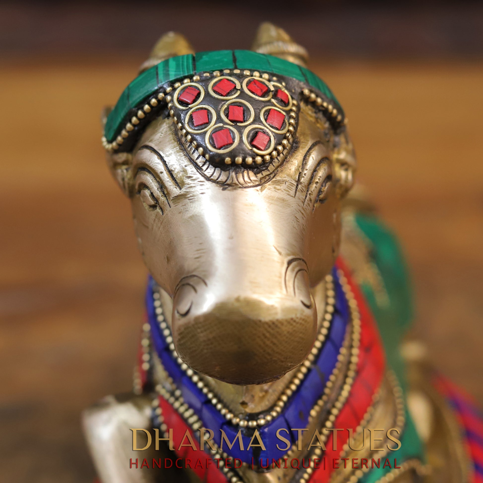 This brass Nandi idol features intricate stone work and a seating posture, making it an elegant addition to any decor. Crafted with fine golden accents, it exudes an air of sophistication and reverence. Perfect for worship or as a decorative piece, it adds a touch of sacred beauty to any space. Best for Wedding Gift | Diwali Gift | Gift purpose | Temple | worshipping | Perfect for Home decoration | Office decoration.