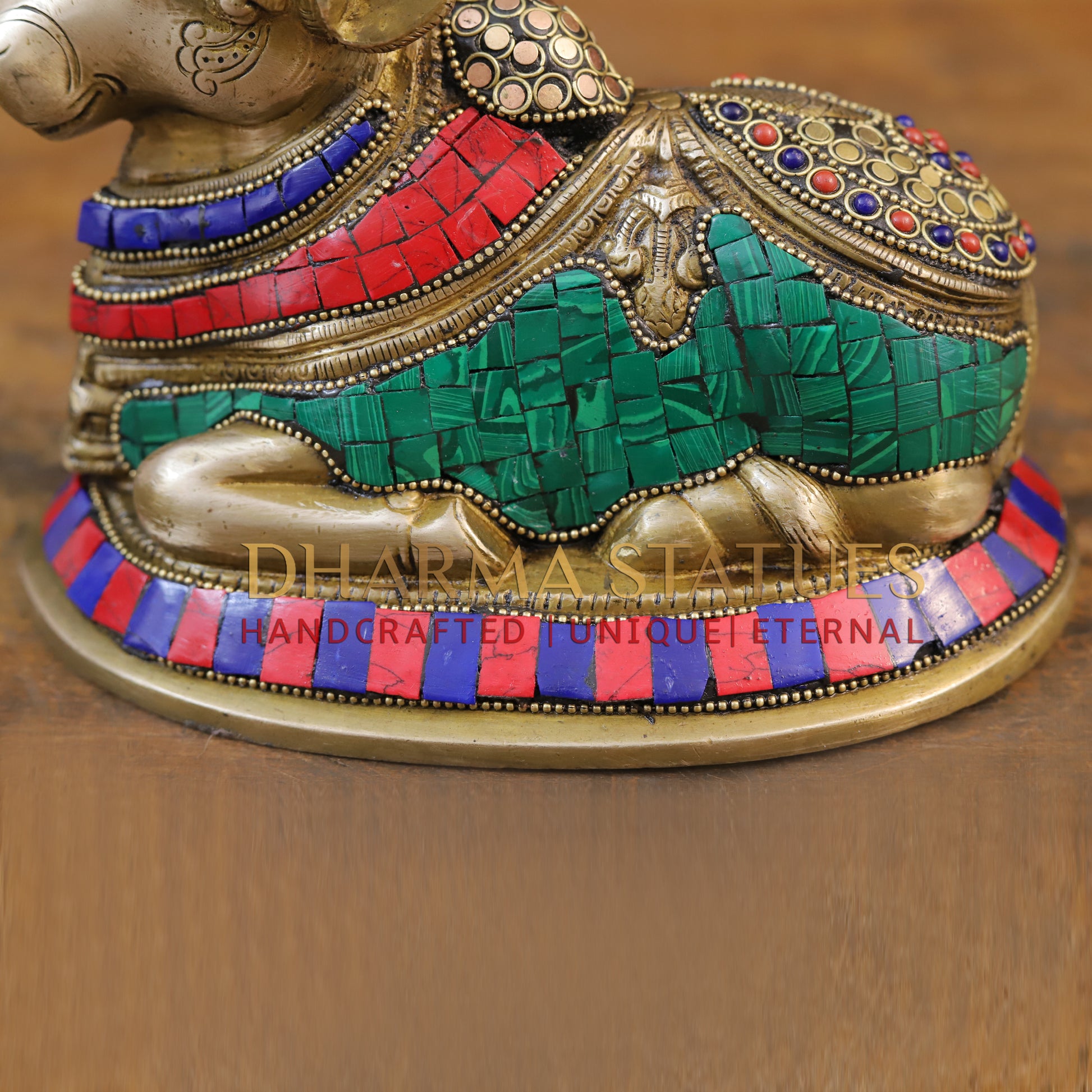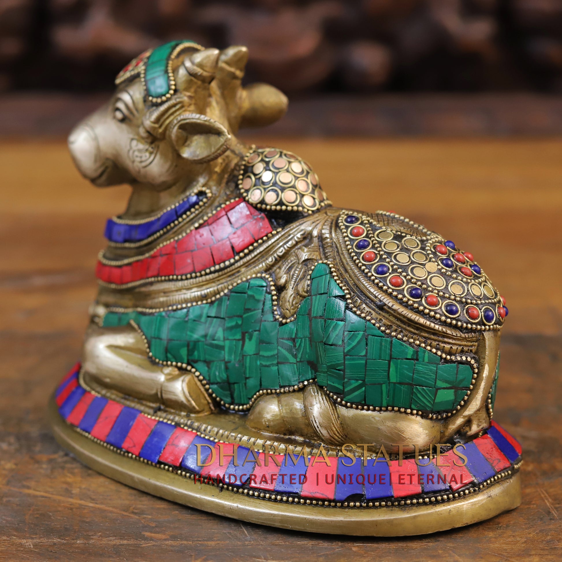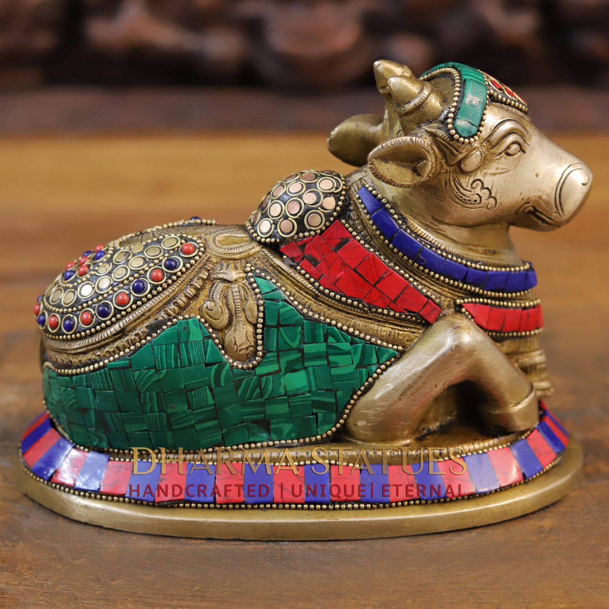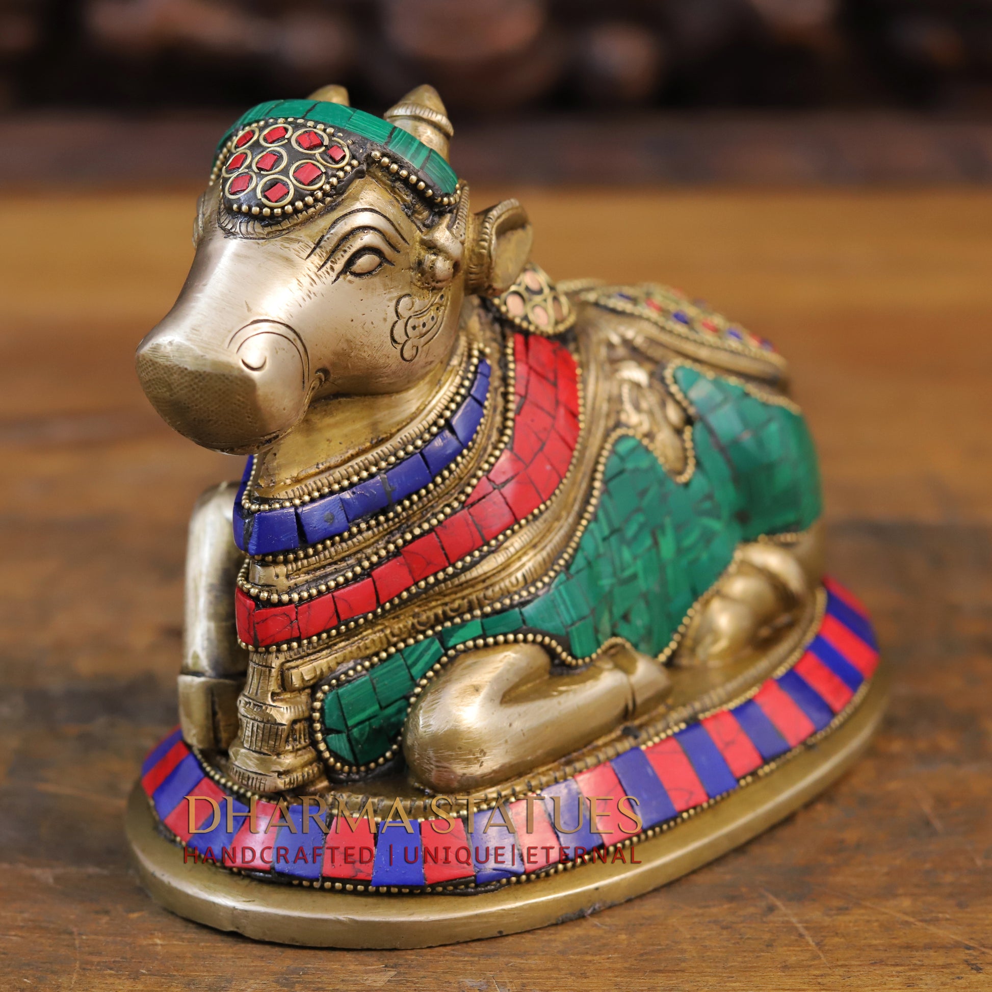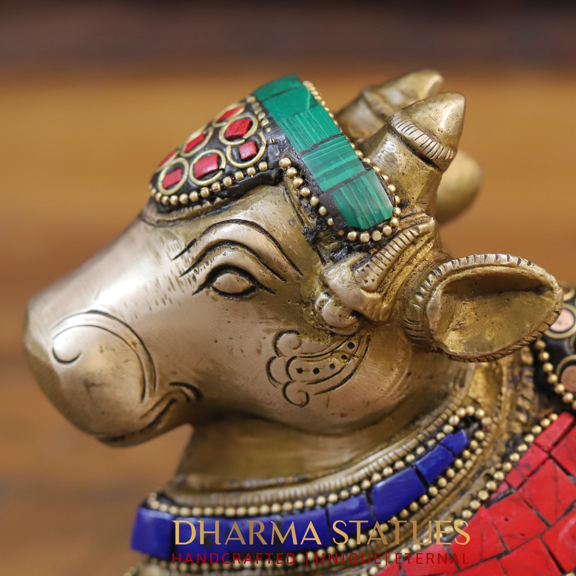 Brass Nandi Idol, Seated, Gold finish with Stone Work, 6"