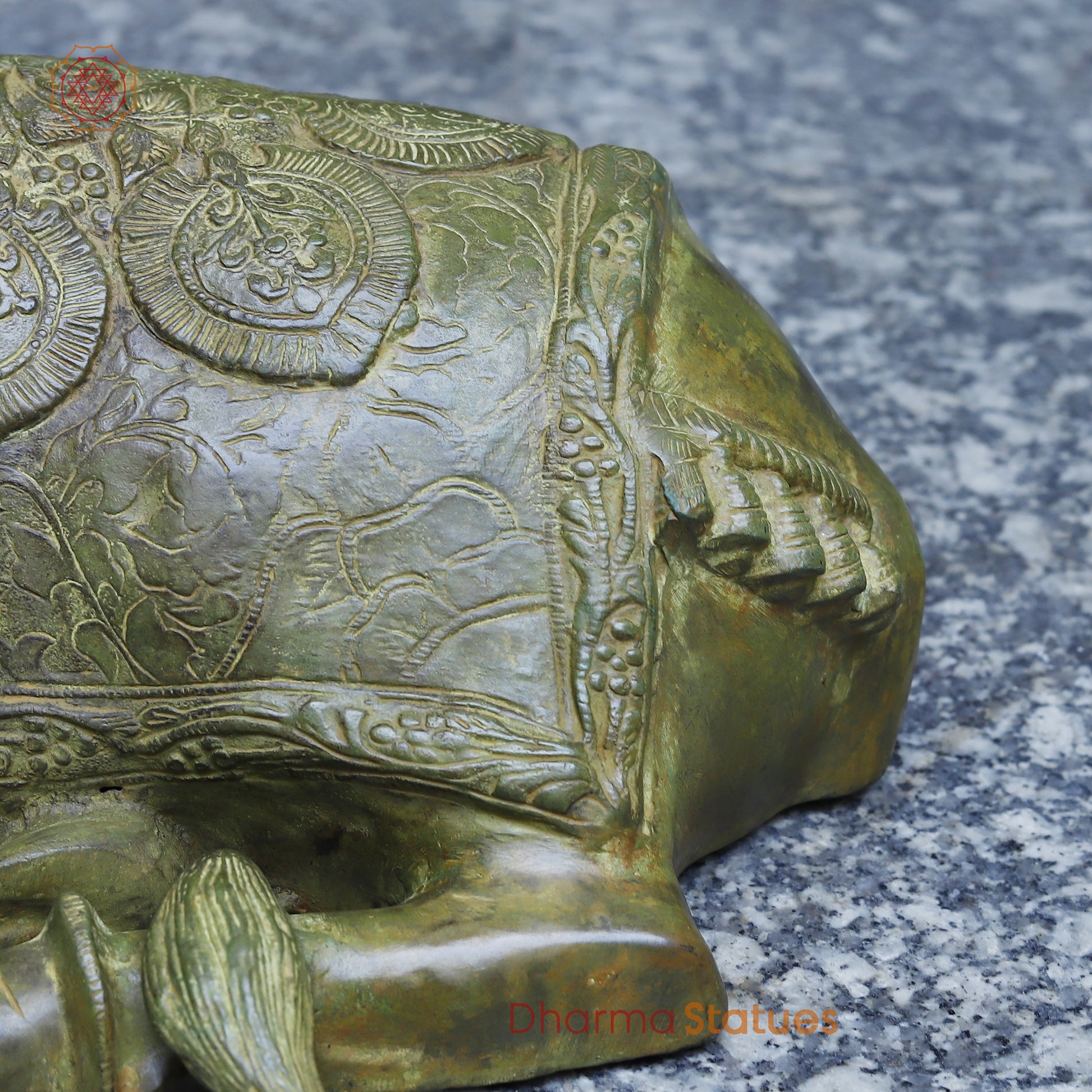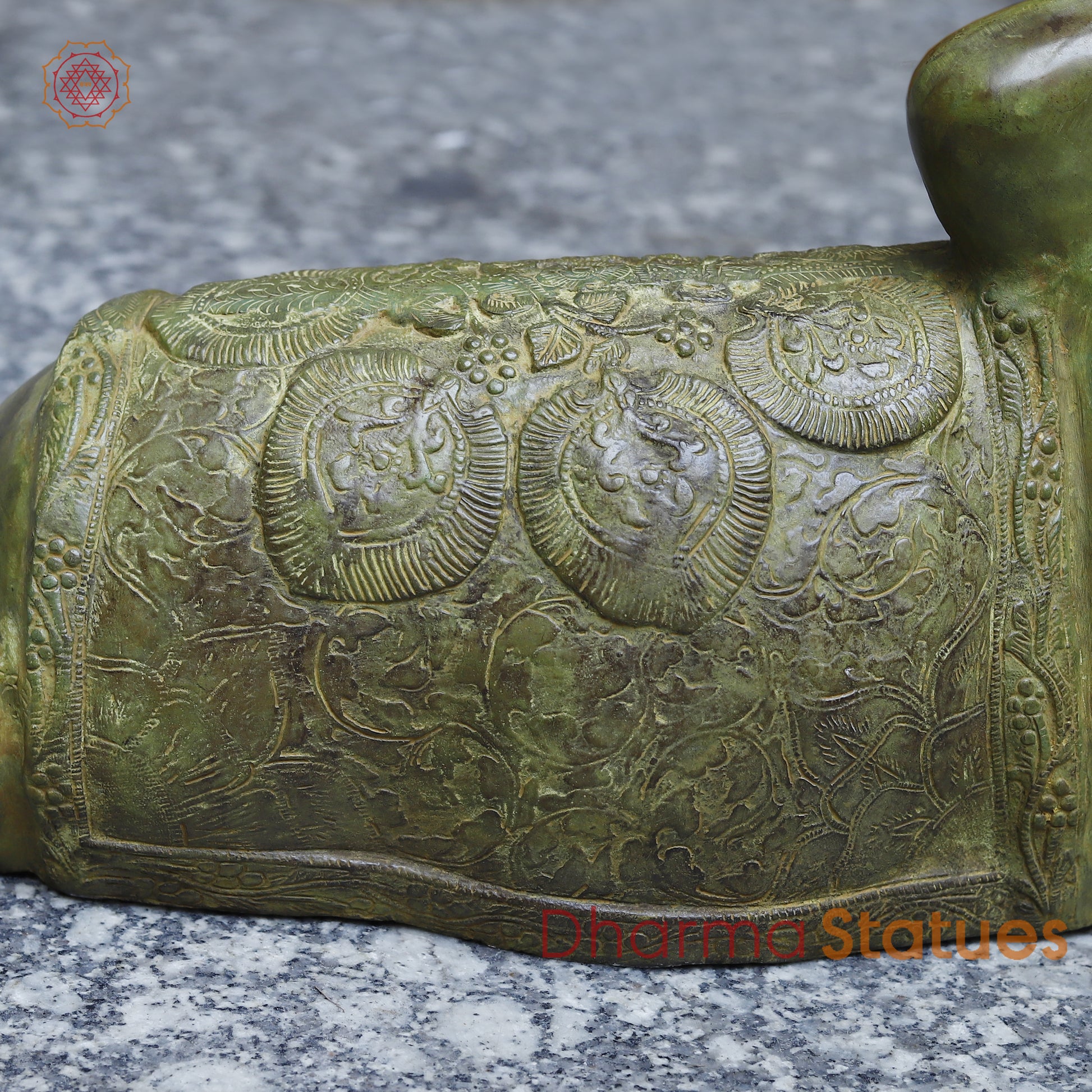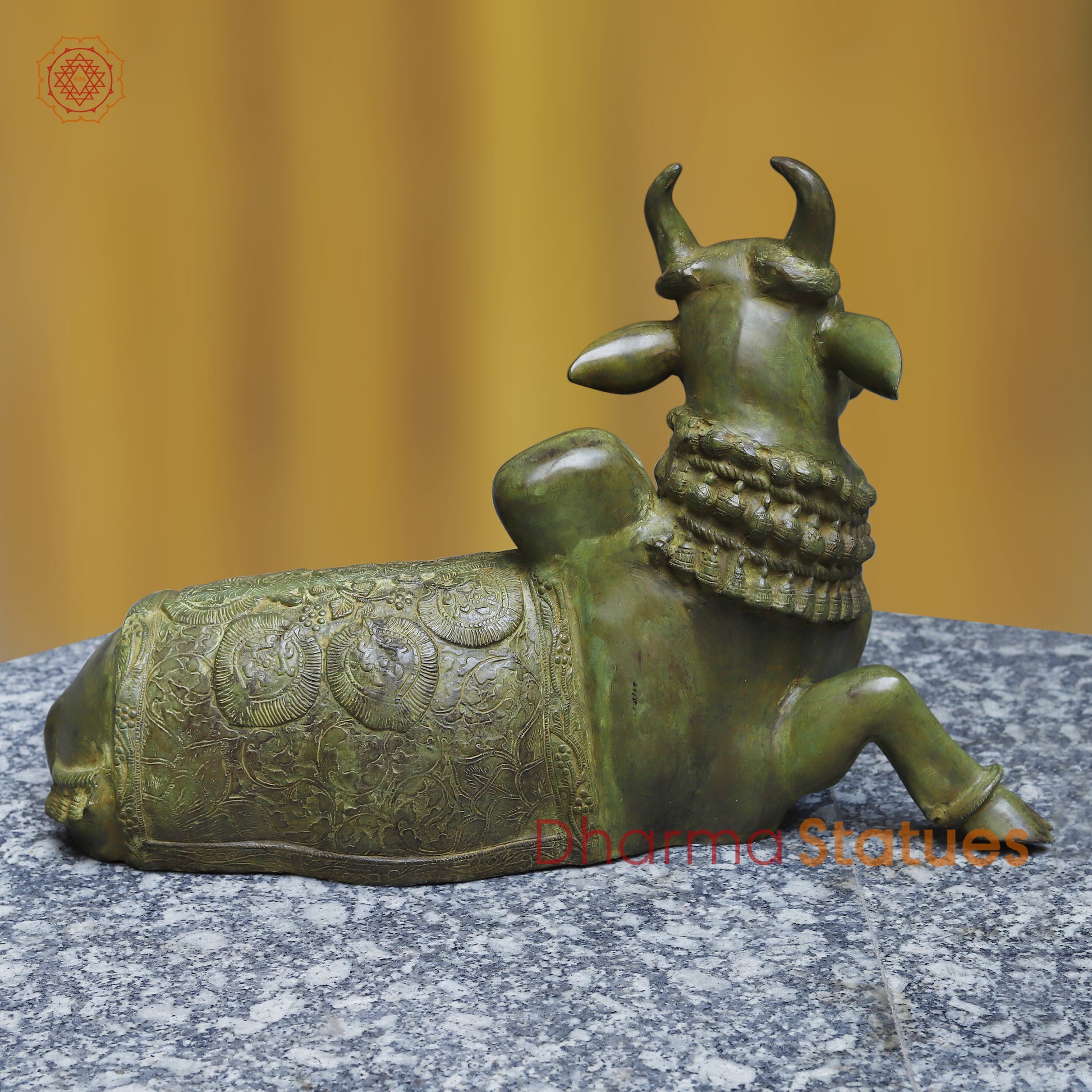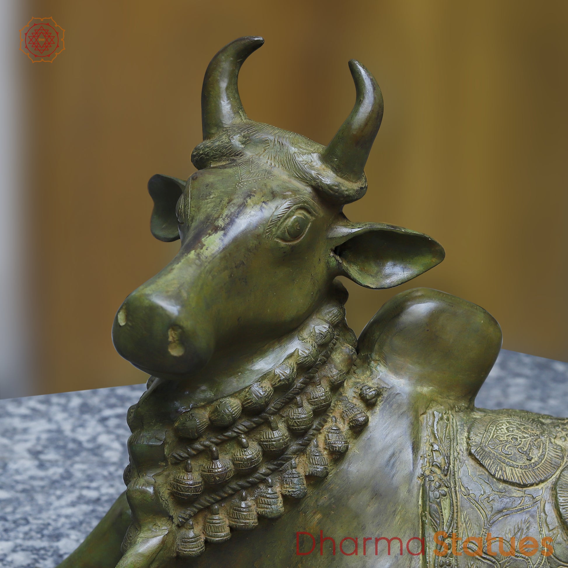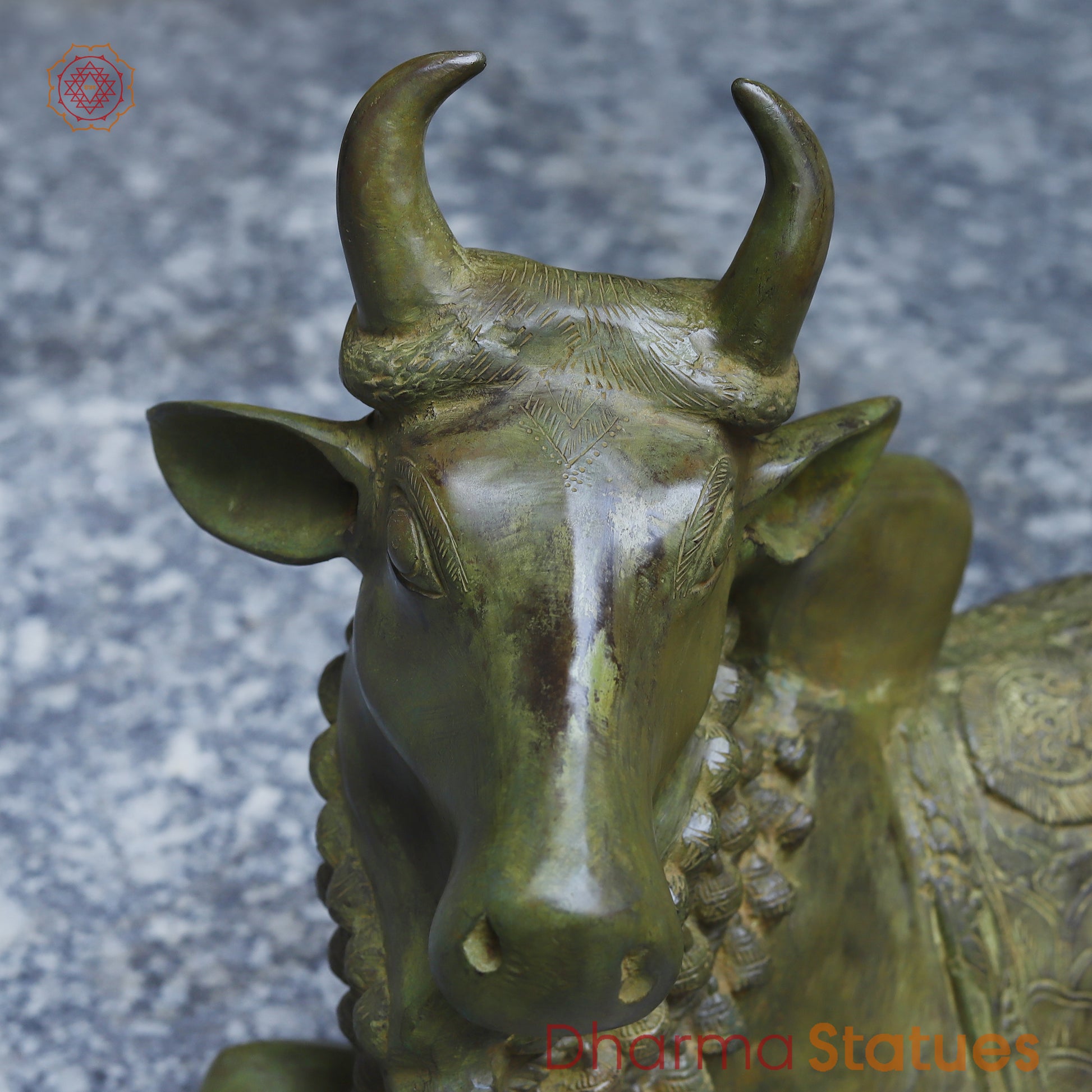 Experience the beauty of this Brass Nandi Seated sculpture, expertly crafted with an antique green finish. Made of high-quality brass, this piece adds a touch of elegance and traditional charm to any space. Measuring 18 inches, it is the perfect size for display in your home or office.