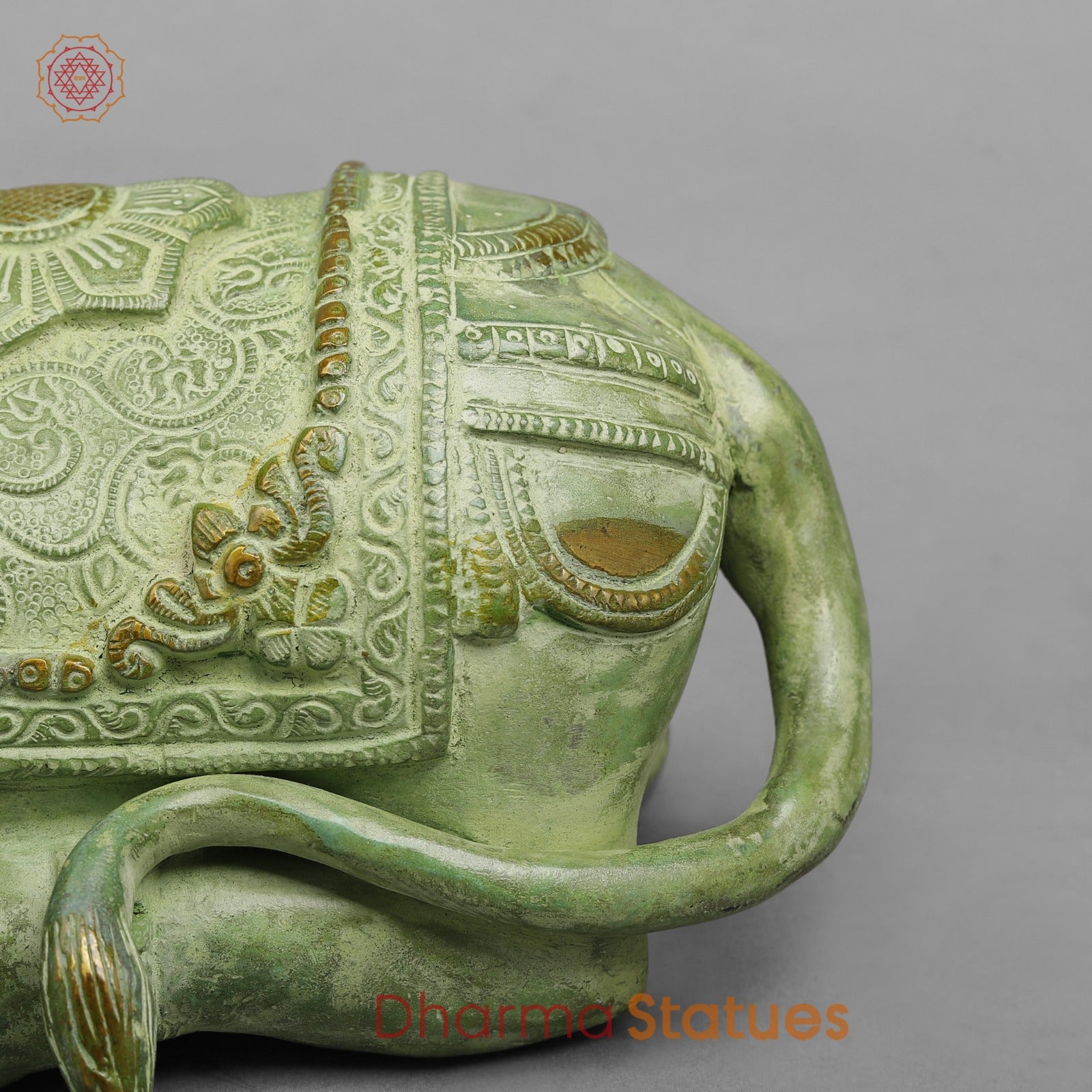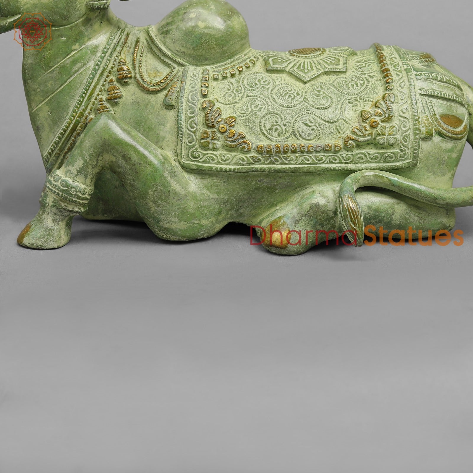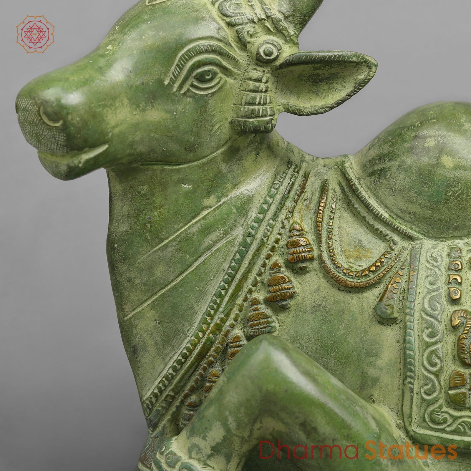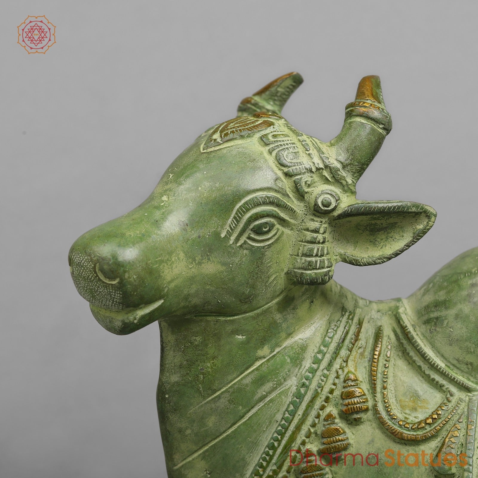 A finely handcrafted brass Nandi in a calm seated posture, adorned with intricate detailing and finished in a soft leaf green patina. Representing devotion, loyalty, and divine guardianship, this piece is ideal for Shiva temples, pooja spaces, or refined spiritual décor.