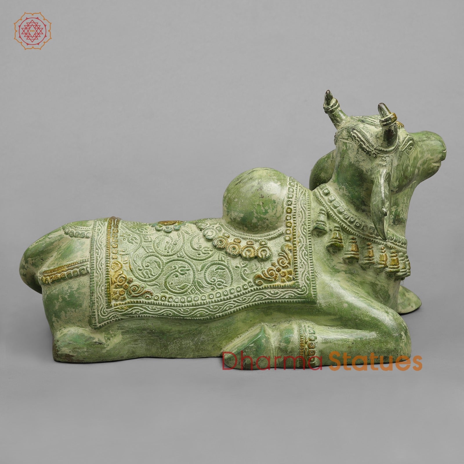 A finely crafted brass Nandi in a serene seated posture, finished with a soothing leaf green patina. Detailed carvings highlight traditional artistry, symbolizing devotion, strength, and guardianship—ideal for Shiva temples, pooja spaces, or elegant spiritual décor.