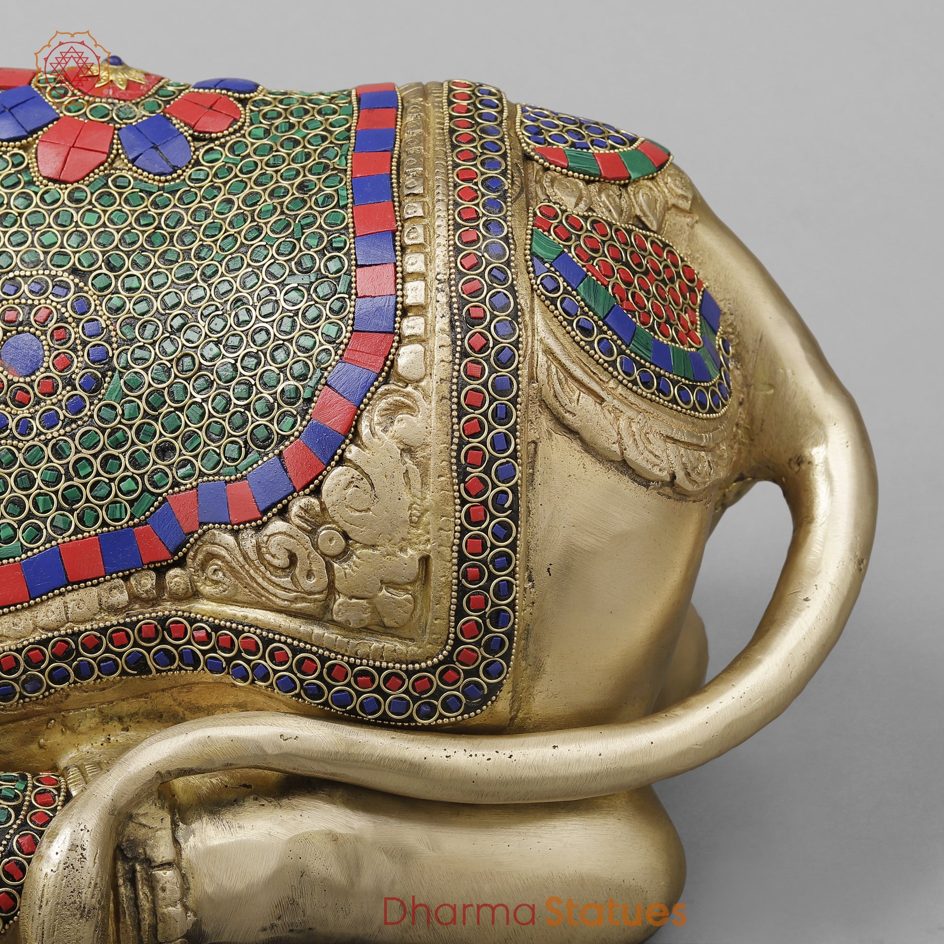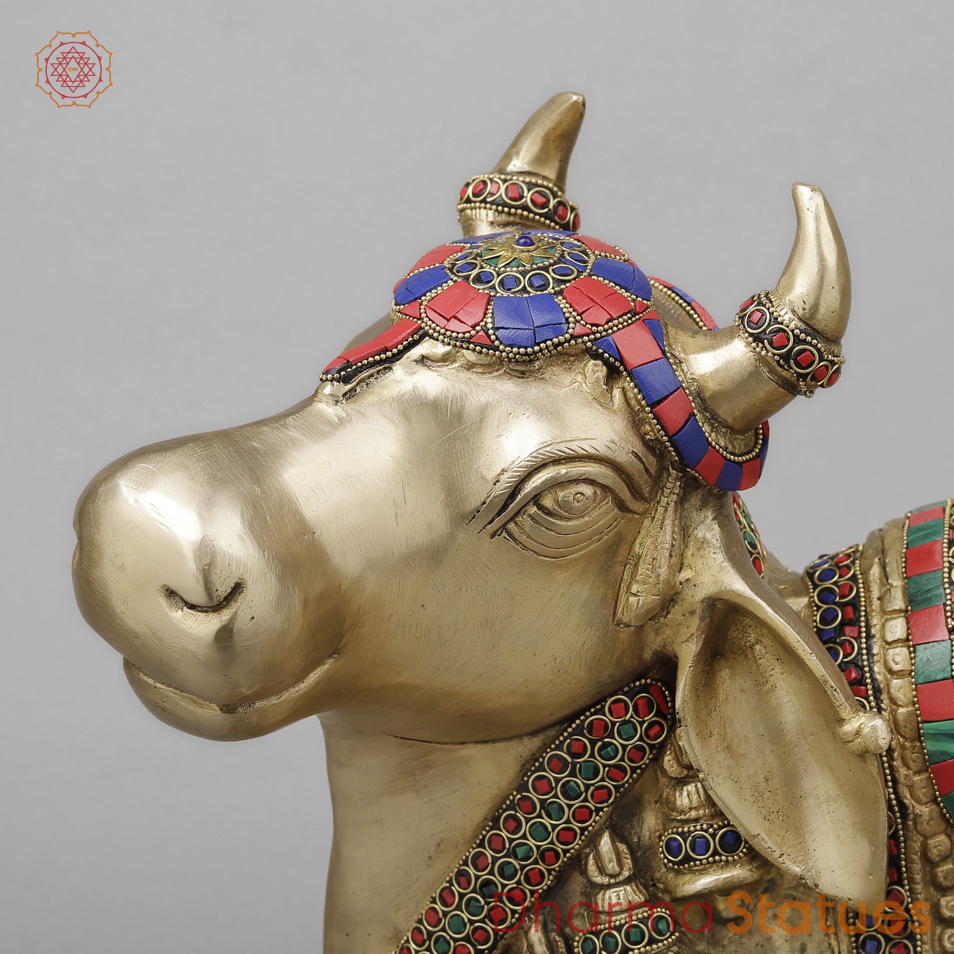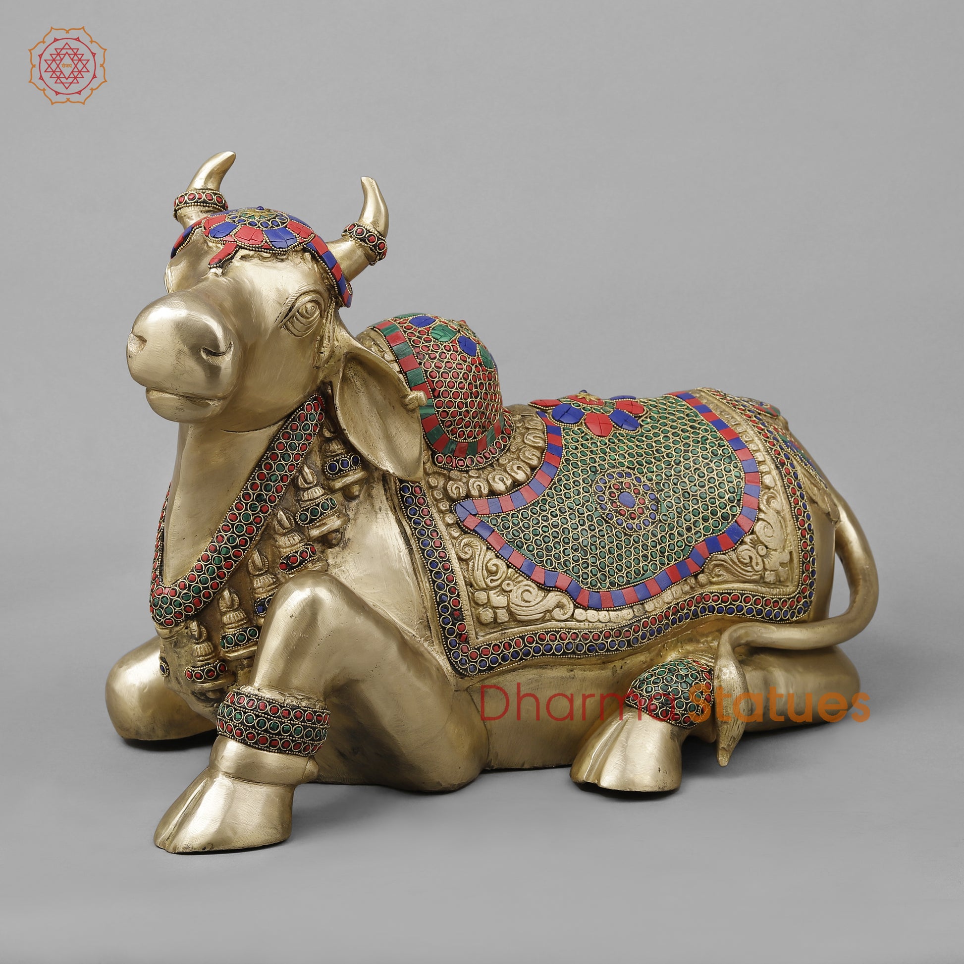 Brass Nandi Idol, adorned with intricate stonework, symbolizes devotion, strength, and sacred energy. Designed with a golden finish, this 14-inch masterpiece is a perfect addition to any home, temple, or meditation space, embodying spiritual grace and protection.