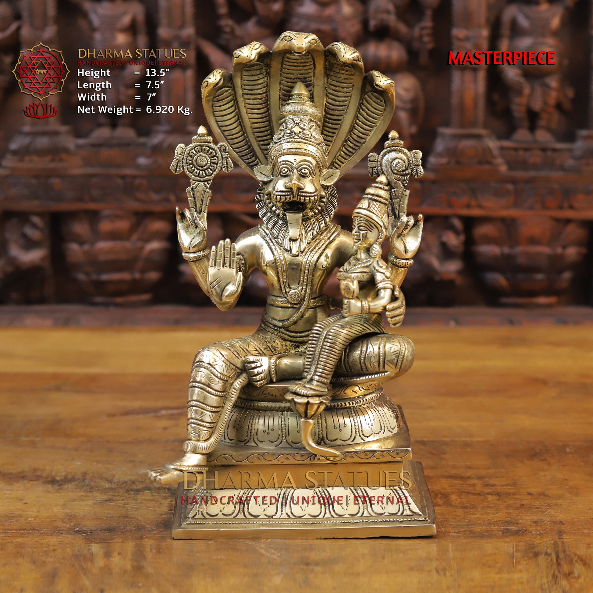 Stunning brass Narasimha sculpture, adorned with a fine golden finish and seated with Lakshmi, the Hindu goddess of wealth and prosperity. Expertly crafted with meticulous detail, this 13.5" statue is a beautiful and powerful addition to any home, bringing blessings of abundance and success.
