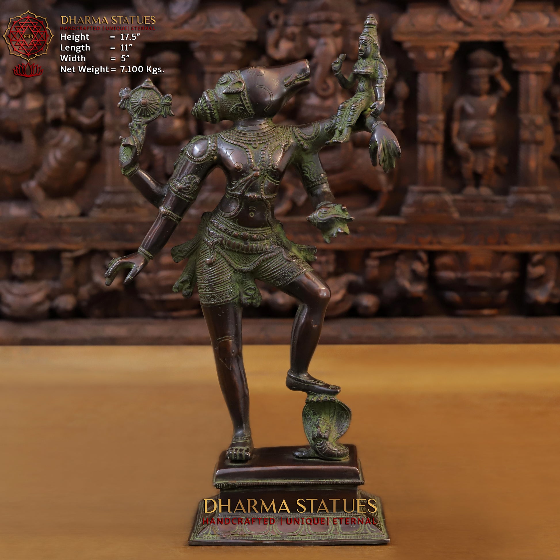 Add a touch of divinity to your home with our hand-crafted Brass Narayana Vishnu Holding Lakshmi Goddess. Made with a beautiful copper and green finish, this 17.5" piece radiates elegance and devotion. Let the powerful energy of Narayana Vishnu and Lakshmi bring blessings into your space.